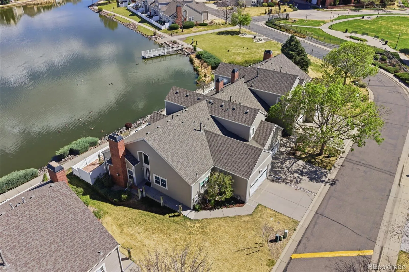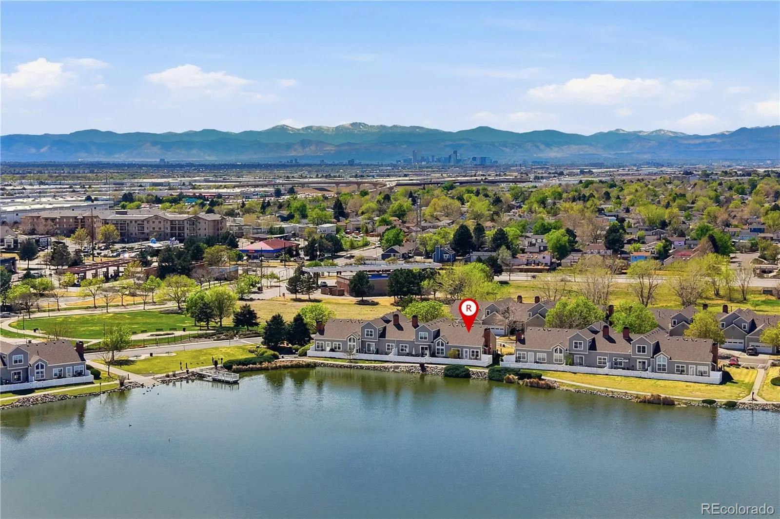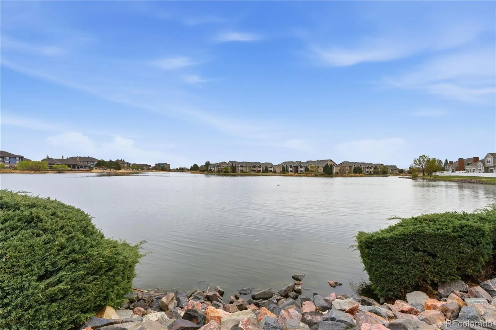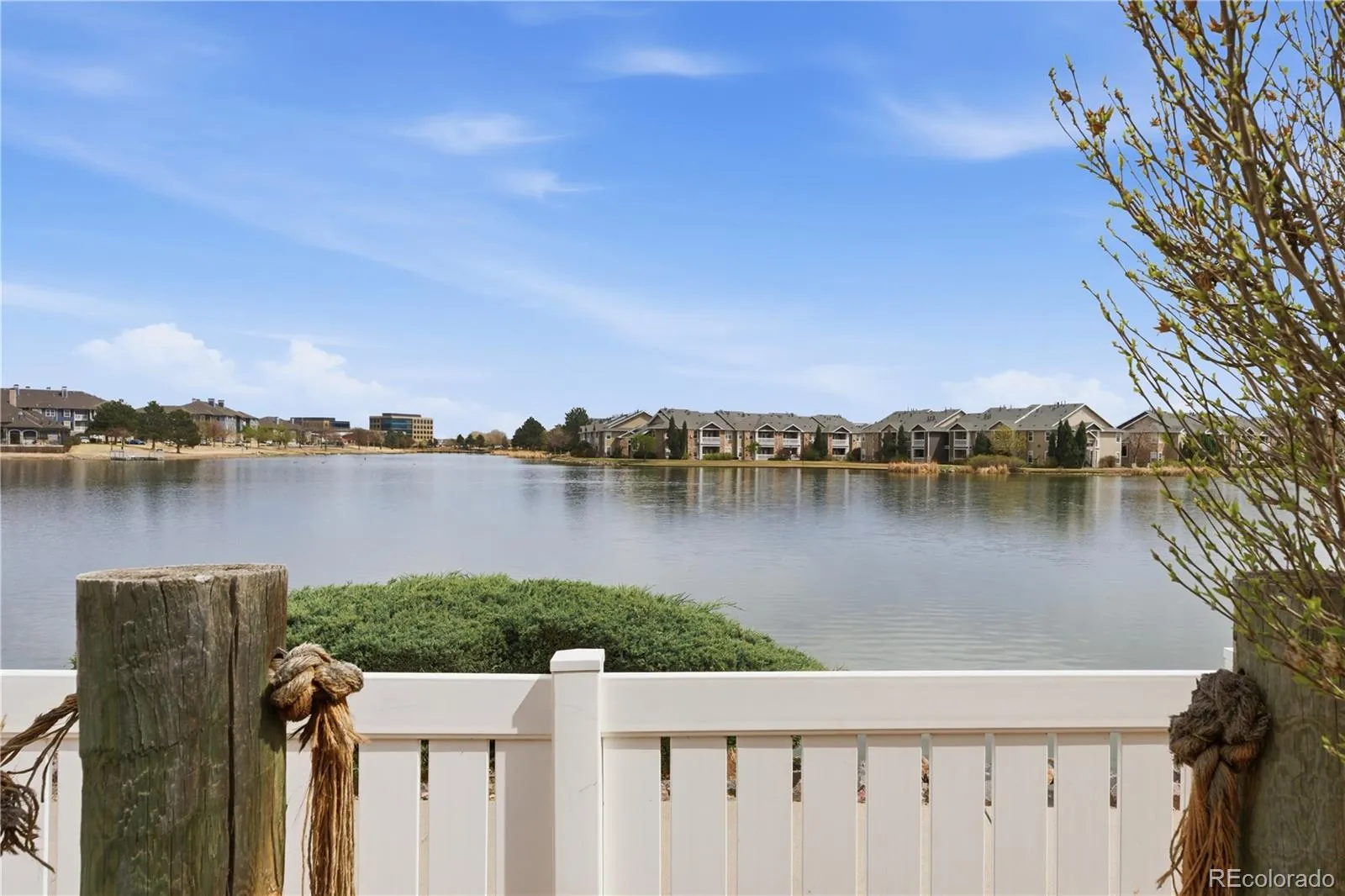 Perfectly positioned on the water in a quiet gated community, this rare end-unit ranch-style townhome offers a unique blend of lakefront living and low-maintenance comfort. From the moment you step inside, the home feels open and inviting, with soaring ceilings and dramatic two-story windows that fill the space with natural light and frame peaceful lake views. Newer windows in the living area and kitchen, along with updated glass in the bedrooms, enhance efficiency and clarity, making the views even more of a focal point. The living room is both bright and cozy, anchored by a gas fireplace that creates a warm, welcoming atmosphere. The kitchen is functional and well laid out, featuring newer stainless steel appliances and a seamless connection to the dining area. Wood blinds and ceiling fans add comfort throughout, while the open layout enhances the sense of space. Additional updates include a newer furnace and air conditioner, appliances, and washer and dryer. Both bedrooms feature large windows with beautiful lake views, creating a calm and relaxing setting. The primary suite stands out with a five-piece ensuite bath and generous dual closets. A dedicated laundry room with cabinetry adds convenience, and the encapsulated crawl space offers excellent storage. Step outside to direct access to the walking path around the lake, where you can enjoy the natural setting and local waterfowl. The fully fenced backyard is designed for easy upkeep, with red flagstone patio space and full water views that create a peaceful outdoor retreat. A cozy front porch with a bench and a wheelchair-accessible ramp adds thoughtful functionality. An oversized two-car garage with shelving provides additional storage. The location offers restaurants just a few blocks away and quick access to shopping at Northfield and Central Park, along with major highways and DIA. Bright, well-maintained, and set right on the lake, this home offers a comfortable, easy lifestyle.