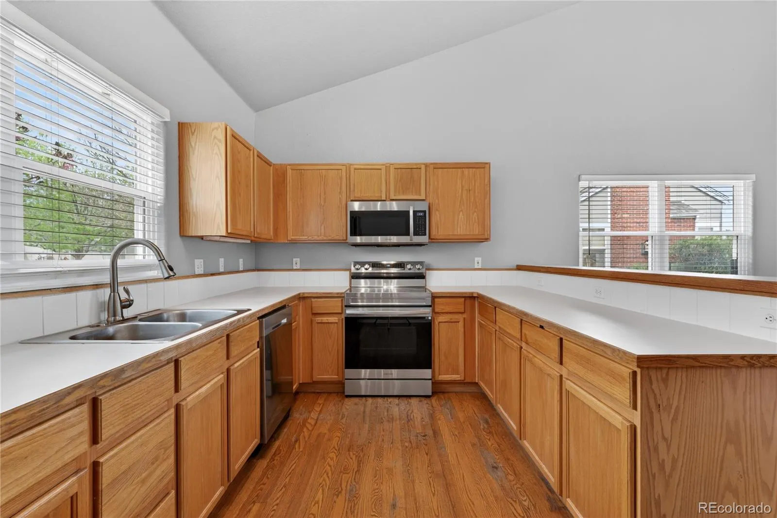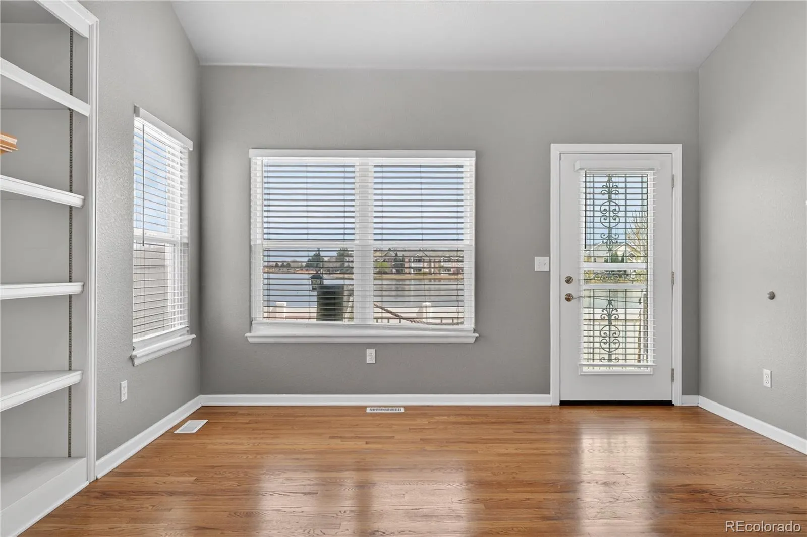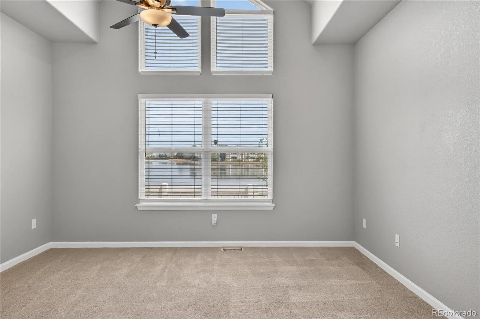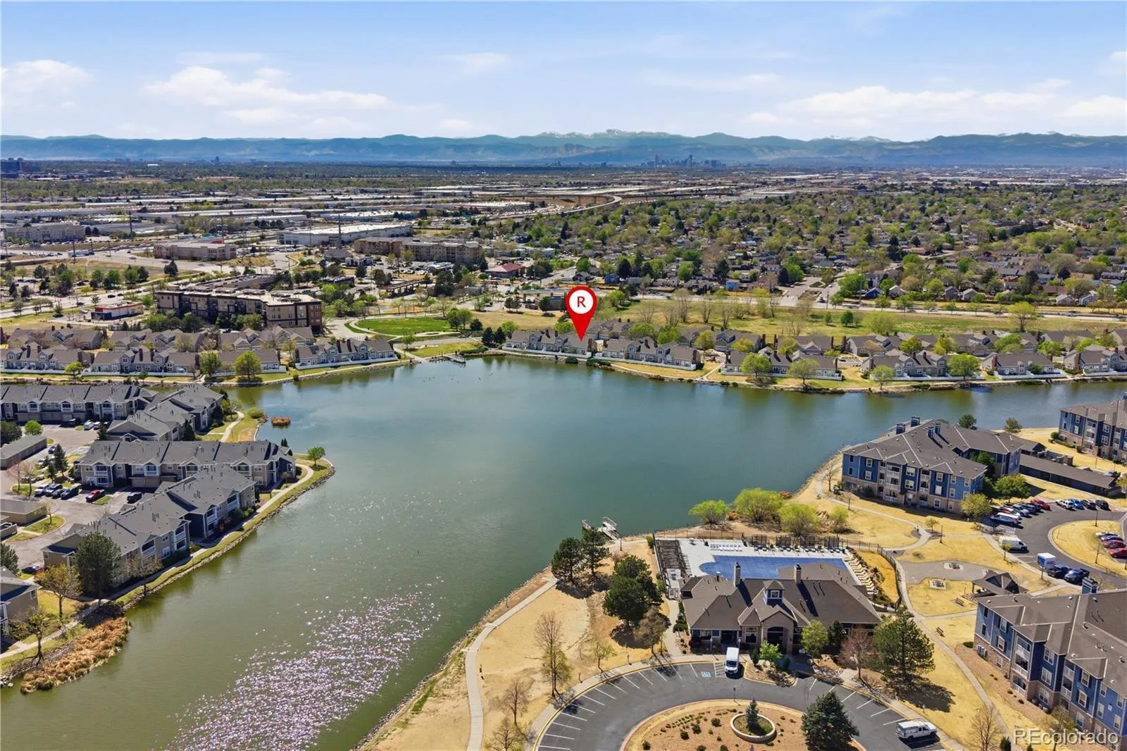 Perfectly positioned on the water in a quiet gated community, this rare end-unit ranch-style townhome offers a unique blend of lakefront living and low-maintenance comfort. From the moment you step inside, the home feels open and inviting, with soaring ceilings and dramatic two-story windows that fill the space with natural light and frame peaceful lake views. Newer windows in the living area and kitchen, along with updated glass in the bedrooms, enhance efficiency and clarity, making the views even more of a focal point. The living room is both bright and cozy, anchored by a gas fireplace that creates a warm, welcoming atmosphere. The kitchen is functional and well laid out, featuring newer stainless steel appliances and a seamless connection to the dining area. Wood blinds and ceiling fans add comfort throughout, while the open layout enhances the sense of space. Additional updates include a newer furnace and air conditioner, appliances, and washer and dryer. Both bedrooms feature large windows with beautiful lake views, creating a calm and relaxing setting. The primary suite stands out with a five-piece ensuite bath and generous dual closets. A dedicated laundry room with cabinetry adds convenience, and the encapsulated crawl space offers excellent storage. Step outside to direct access to the walking path around the lake, where you can enjoy the natural setting and local waterfowl. The fully fenced backyard is designed for easy upkeep, with red flagstone patio space and full water views that create a peaceful outdoor retreat. A cozy front porch with a bench and a wheelchair-accessible ramp adds thoughtful functionality. An oversized two-car garage with shelving provides additional storage. The location offers restaurants just a few blocks away and quick access to shopping at Northfield and Central Park, along with major highways and DIA. Bright, well-maintained, and set right on the lake, this home offers a comfortable, easy lifestyle.