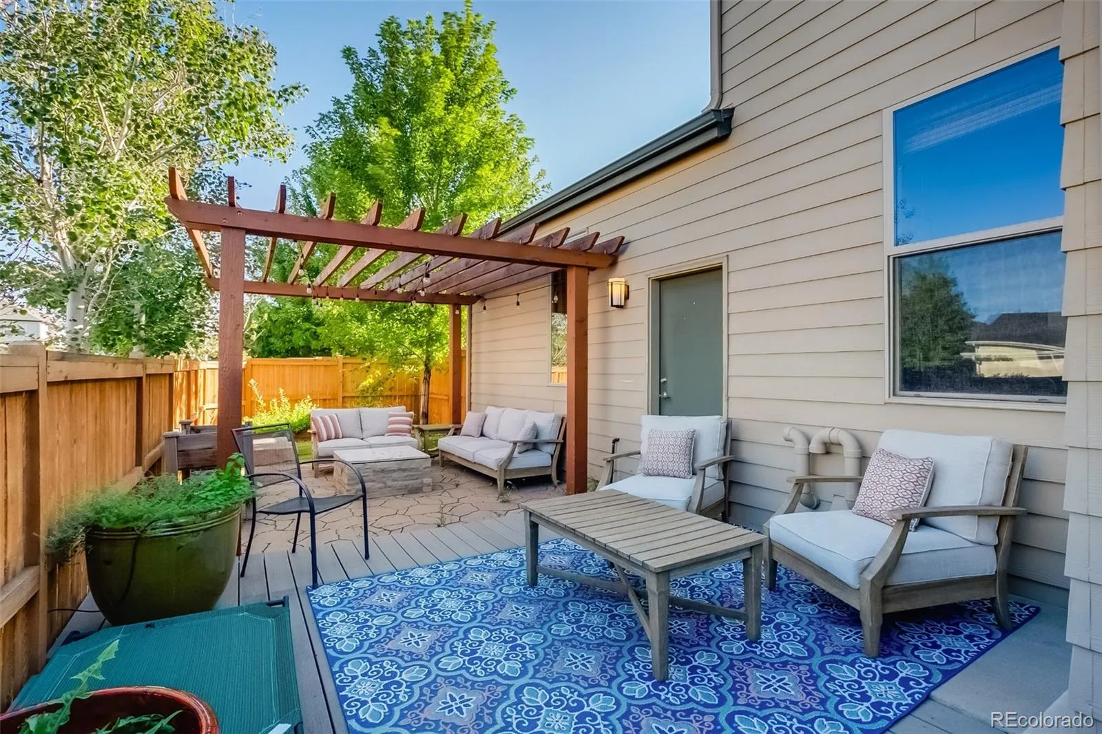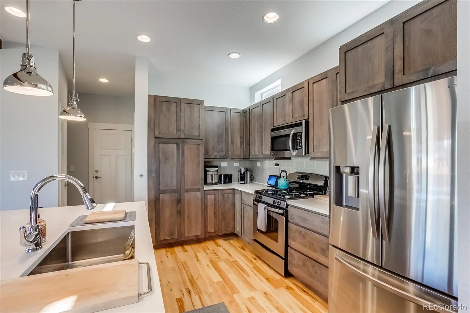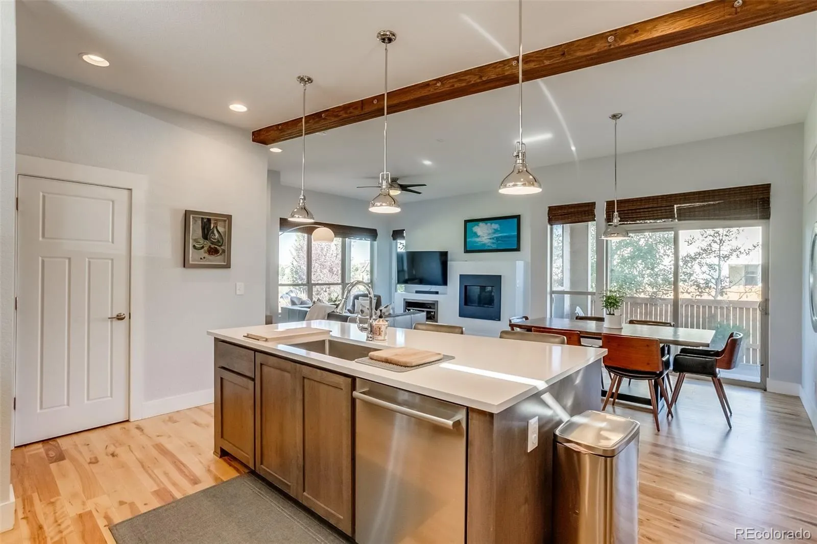You’re immediately greeted by hardwood floors and an open-concept floor plan bathed in natural light throughout. The kitchen is truly the heart of the home, featuring a large center island with quartz countertops, designer backsplash, and charming upper cabinet windows that flood the space with even more sunlight. The adjoining dining area opens directly to the professionally landscaped side yard, creating the perfect indoor/outdoor flow for entertaining or simply enjoying Colorado evenings.