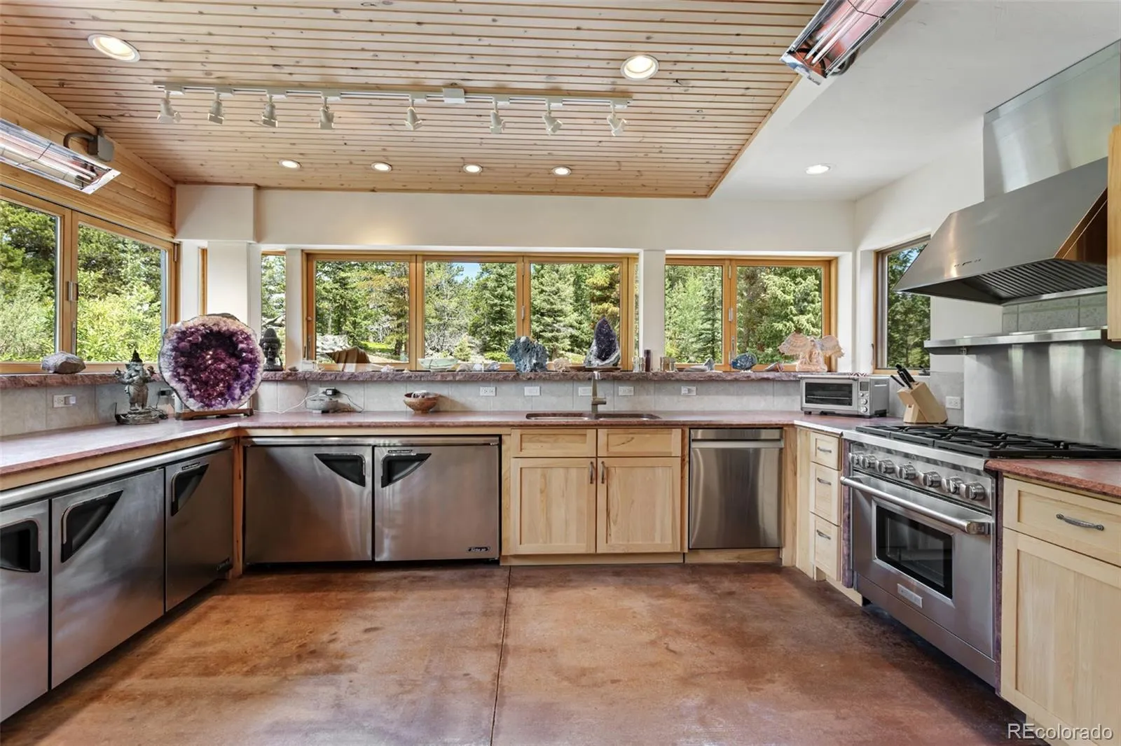 • Chef’s Domain: A professional-grade kitchen fully equipped with overhead and french doors, triple-depth granite countertops, and infrared heaters, in-floor heating, built in expansive refrigeraton units, 180 degree windows, Wolf Range Oven, and more.
