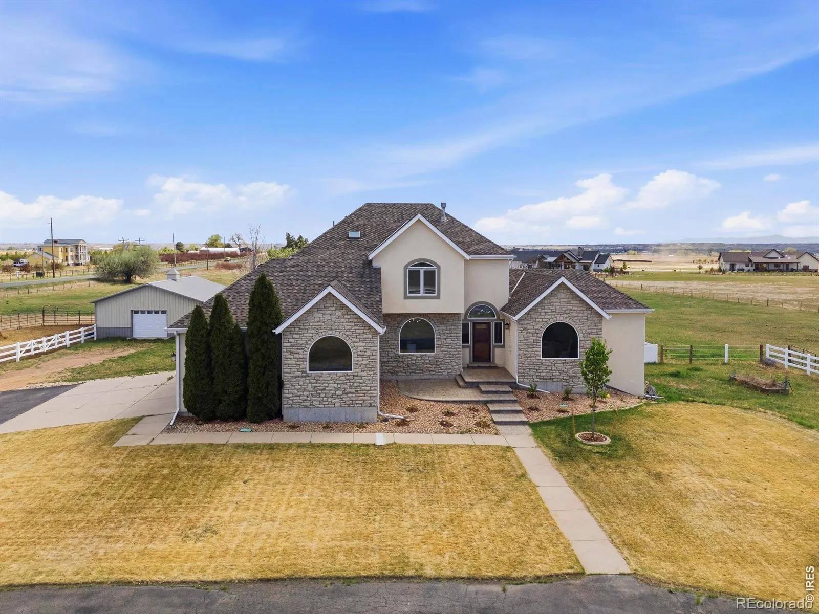 Welcome to 8952 Gander Valley Lane, where modern updates meet tranquil country living. This beautifully renovated estate features refreshed landscaping, new paint, carpet, light fixtures, renovated bathrooms, and a stunning kitchen, all tied together by gorgeous wood floors. Set on 6 private acres, you’ll enjoy breathtaking mountain views and endless outdoor possibilities.The heart of the home is the gourmet kitchen, perfect for culinary adventures, paired with a formal dining room and a dramatic great room featuring a stone fireplace-ideal for cozy evenings. Relax and enjoy the mountain views from your main-floor primary suite, featuring a renovated 5-piece luxury bath. Outdoor enthusiasts will love the expansive grounds, complete with a natural gas fire pit, a tranquil pond with a waterfall, and plenty of space to roam, play, or unwind. For equestrians or hobbyists, the 30×40 barn with four portable stalls and fenced pasture offers endless possibilities for horses, a workshop, or even a cherished car collection. A loafing shed and additional parking ensure there’s room for all your toys and tools.Looking for even more space? The partially finished garden-level basement, with its fourth bedroom and abundant natural light, offers endless potential to customize.Minutes from Windsor, Fort Collins, and Harmony Club golf course, this is your chance to embrace modern style, outdoor adventure, and peaceful living.