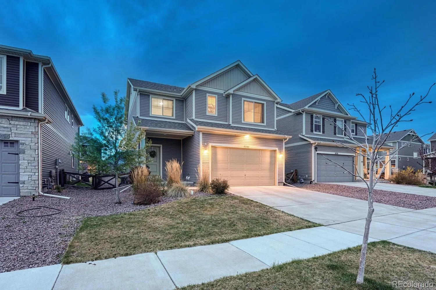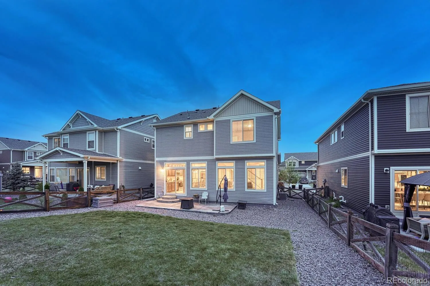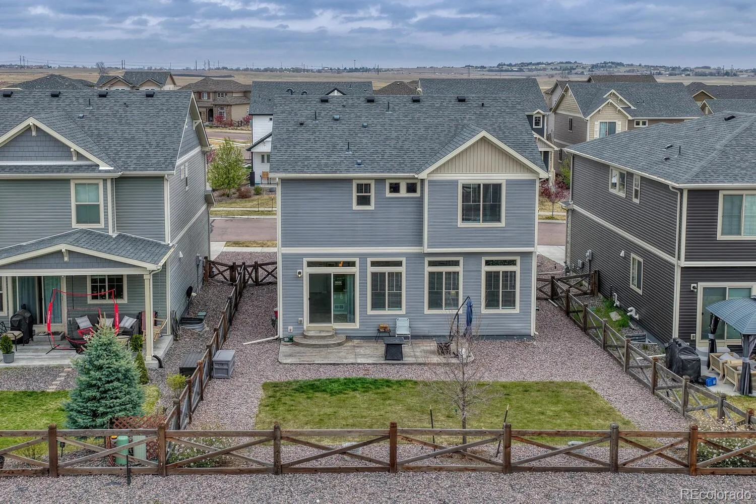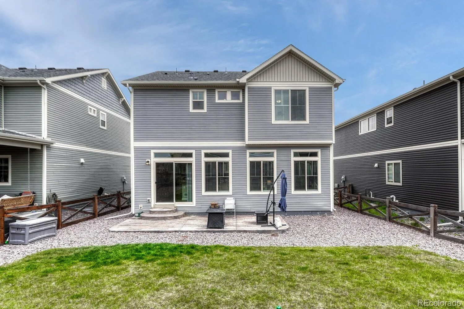 Beautifully maintained 3BR, 3BA, 2-story home offering 1,805 sf of comfortable living space & a 2-car attached garage. Located on a fenced 0.11-acre lot in the popular community of Banning Lewis Ranch. This home has great curb appeal, featuring clean, low-maintenance landscaping & an inviting covered front porch. Inside, enjoy a bright & open floor plan with beautiful LVP flooring throughout most of the main level & abundant windows that flood the home with natural light. All window blinds, curtains, & rods are included. Central air & heat provide year-round comfort. There is a convenient powder bathroom off the entry. The spacious Great Room has a wall of windows overlooking the backyard & flows seamlessly into the Dining Area & Kitchen, great for entertaining family & friends. The Dining Area is positioned adjacent to the Kitchen for easy serving & cleanup. The Island Kitchen is a delight for any home chef, offering a pantry, breakfast bar, pendant lighting, wood cabinetry, & attractive granite countertops. Stainless steel appliances incl a gas range oven, built-in microwave, dishwasher, & side-by-side refrigerator. The upper level hosts a Laundry Room with a window, 3 carpeted BRs, & 2BAs. The expansive Primary Suite serves as a private retreat with space for a sitting or desk area, a walk-in closet, & ensuite bathroom featuring an extended dual-sink vanity, mirror, & an enclosed tiled shower. 2 addtl BRs share a full hall bathroom with a vanity, mirror, & tiled tub/shower. Step outside to enjoy the fenced backyard, complete with a composite patio perfect for outdoor dining & relaxation. A generous stretch of green grass is surrounded by xeriscaped planting beds, offering plenty of space for kids & pets to play. Living in Banning Lewis Ranch means enjoying community parks, trails, & a pool designed to complement an active lifestyle. With nearby shopping, dining, & entertainment options, this home offers the perfect balance of comfort, convenience, & community.