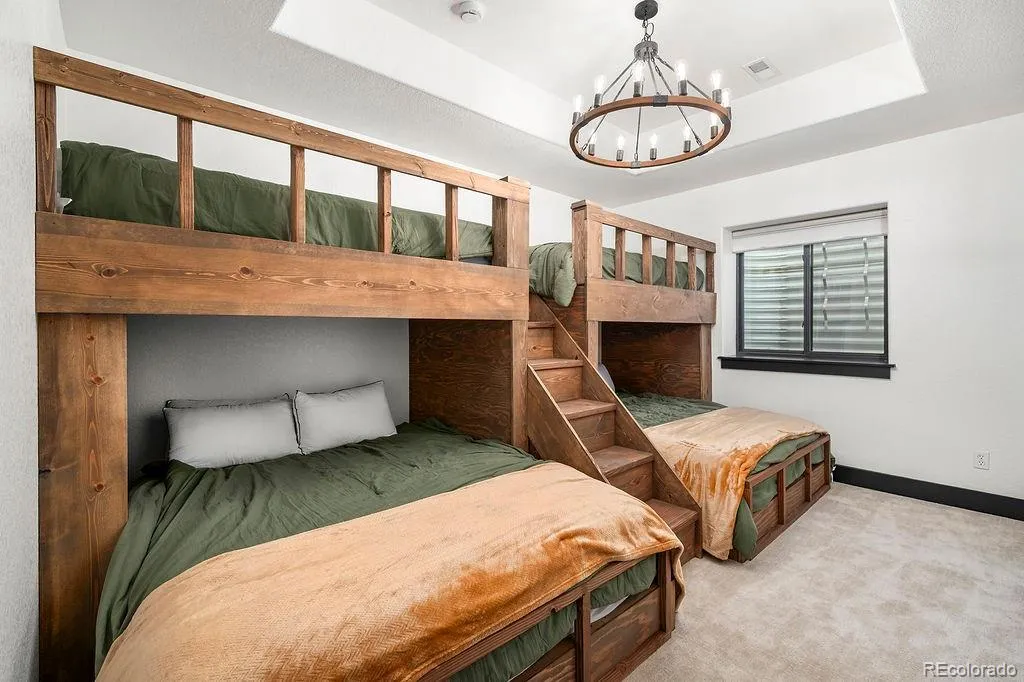 Two bedrooms and a full bath complete the walkout level, including a bunk room and guest room with patio access.