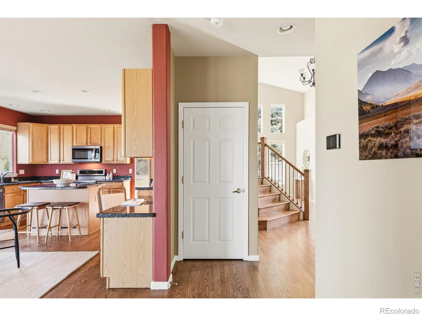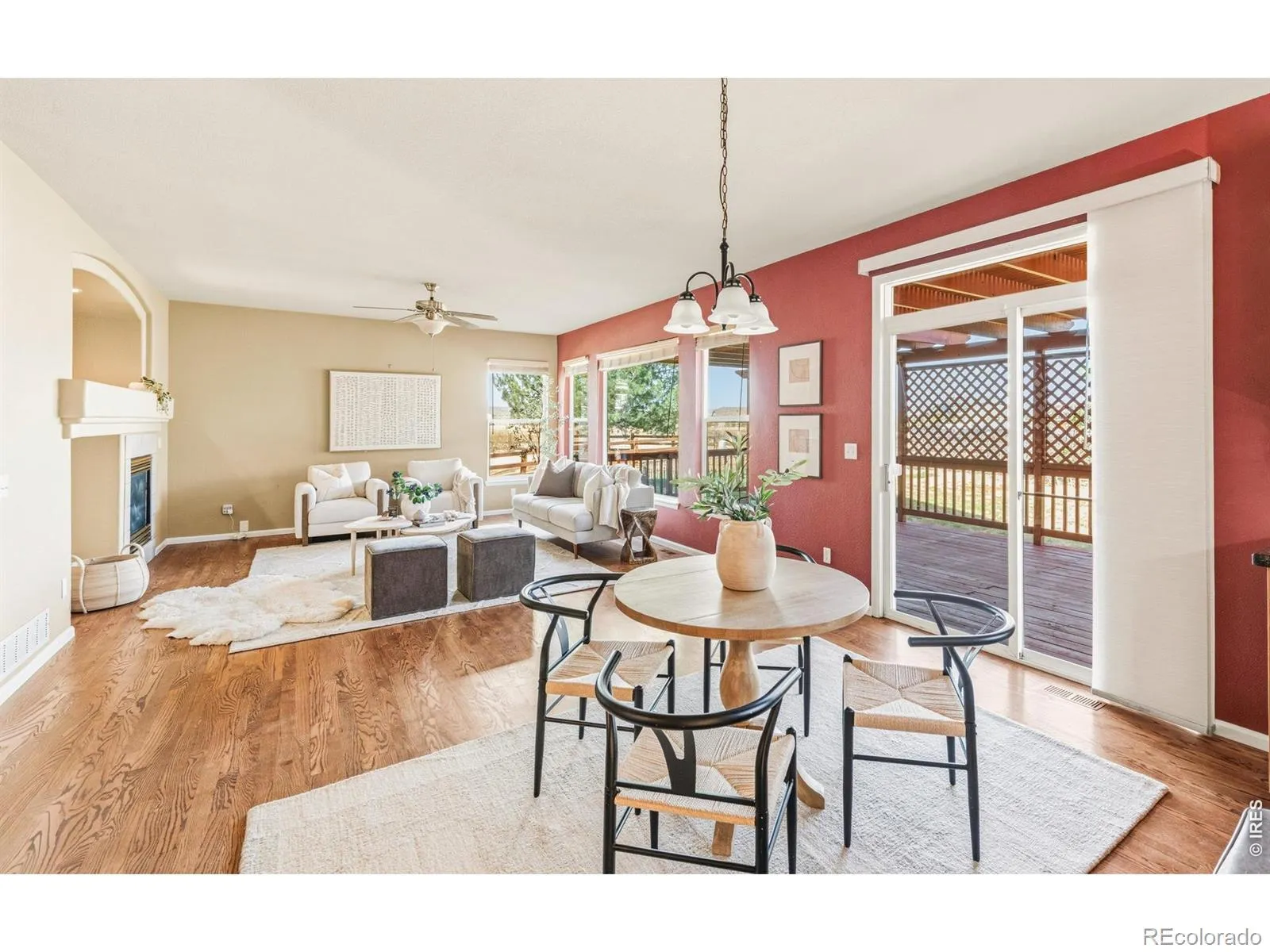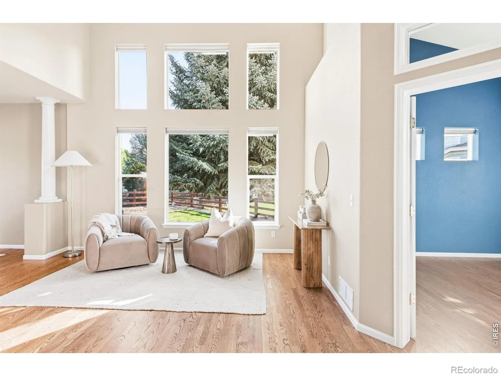 Positioned at the end of a quiet cul-de-sac and backing to an open greenbelt, this Orchard Glen residence captures sweeping views of Indian Peaks and an exceptional sense of space. A welcoming entry introduces a private office behind French doors, while rich wood floors guide residents through a thoughtfully designed main level with formal dining and inviting gathering areas. The spacious eat-in kitchen connects to the main living area, framed by large windows and a tiled fireplace. Upstairs, four bedrooms including a stunning primary suite with expansive mountain views, a generous walk-in closet and a five-piece bath as well as a guest room with its own bath. A convenient mudroom with laundry and dog door enhance everyday functionality. Outside, a large yard with mature fruit trees and an established garden creates a peaceful retreat. With an unfinished basement ready for customization and close proximity to BVSD schools, Downtown Erie and Boulder, this home offers both lifestyle and location.
