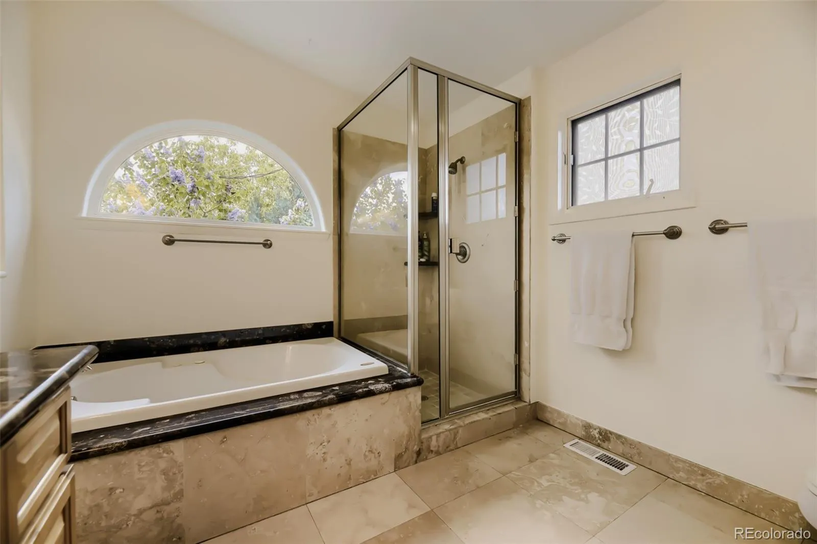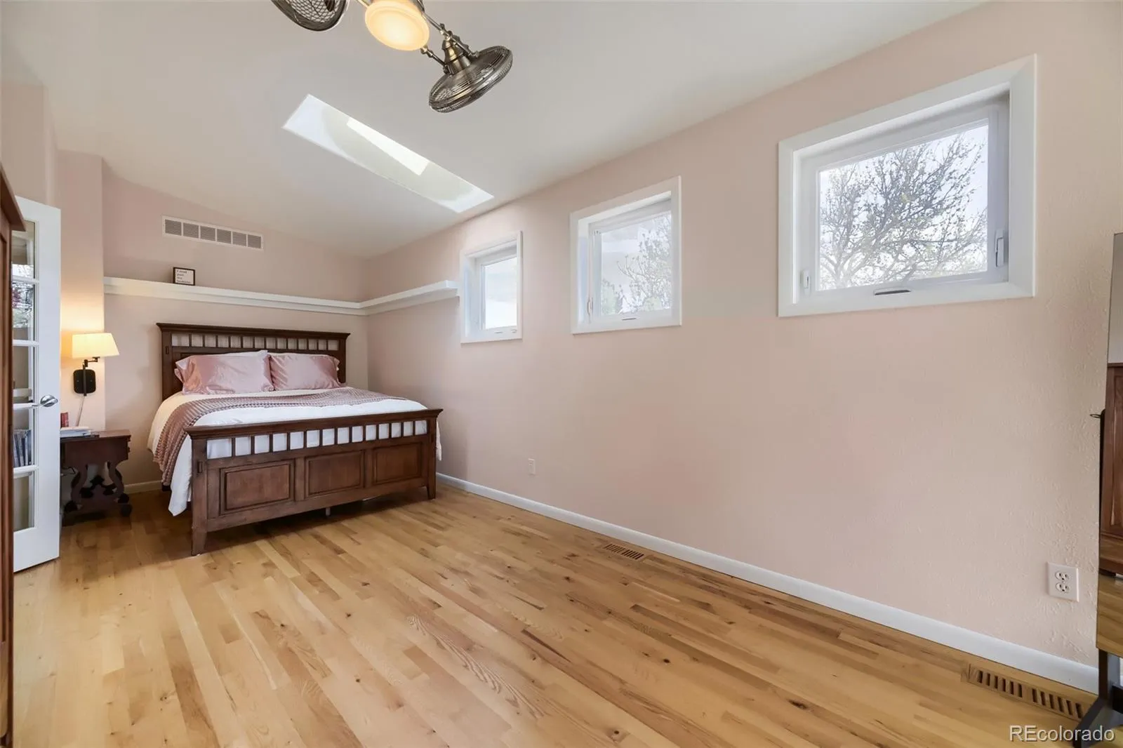 The primary suite earns its title — sitting area, heated bathroom floors, Juliet balcony overlooking your garden with mountain views, and a brand new mini-split AC system for the primary bedroom.