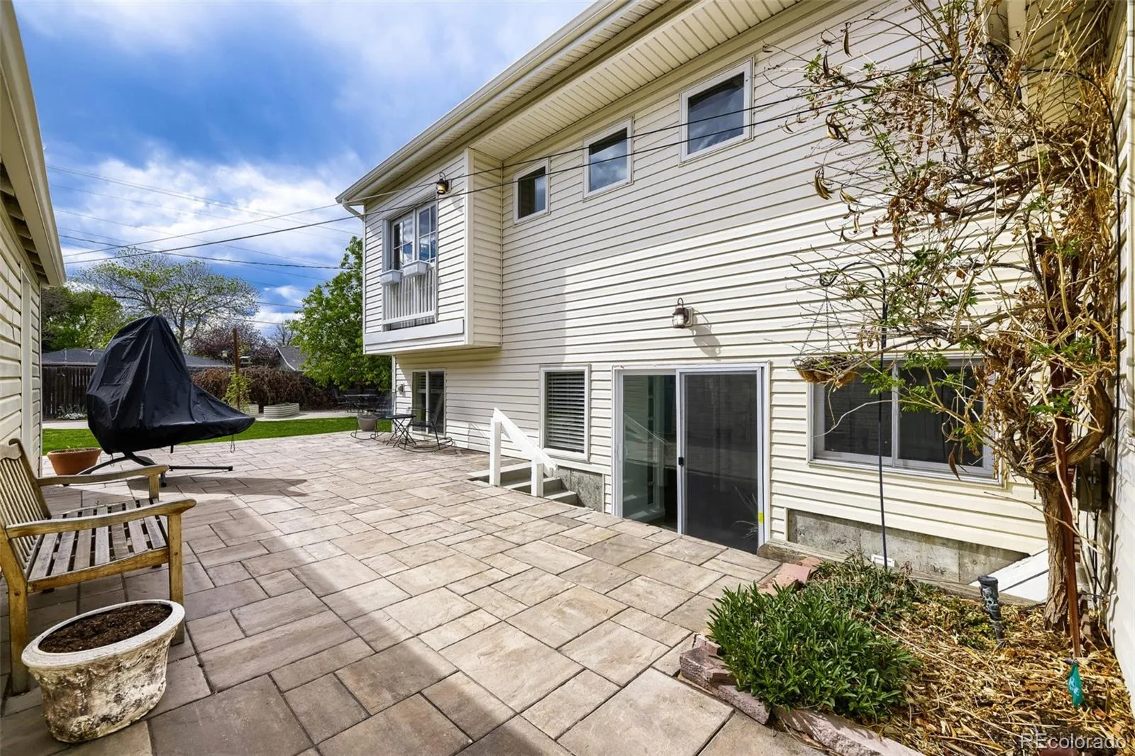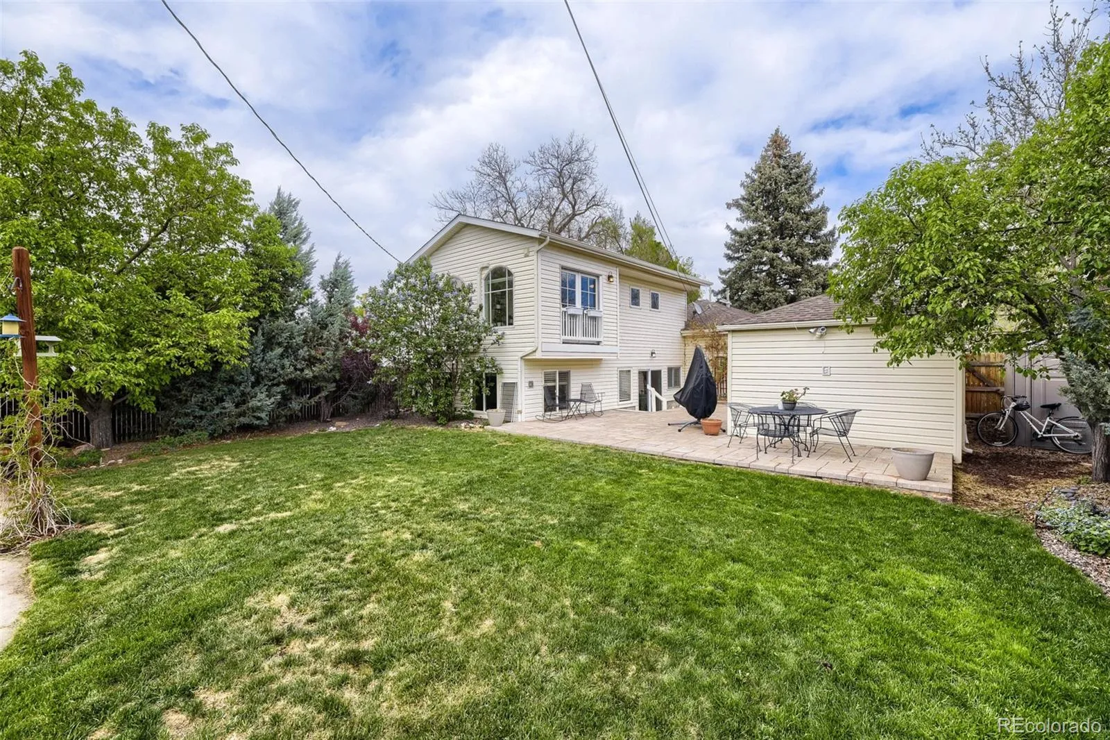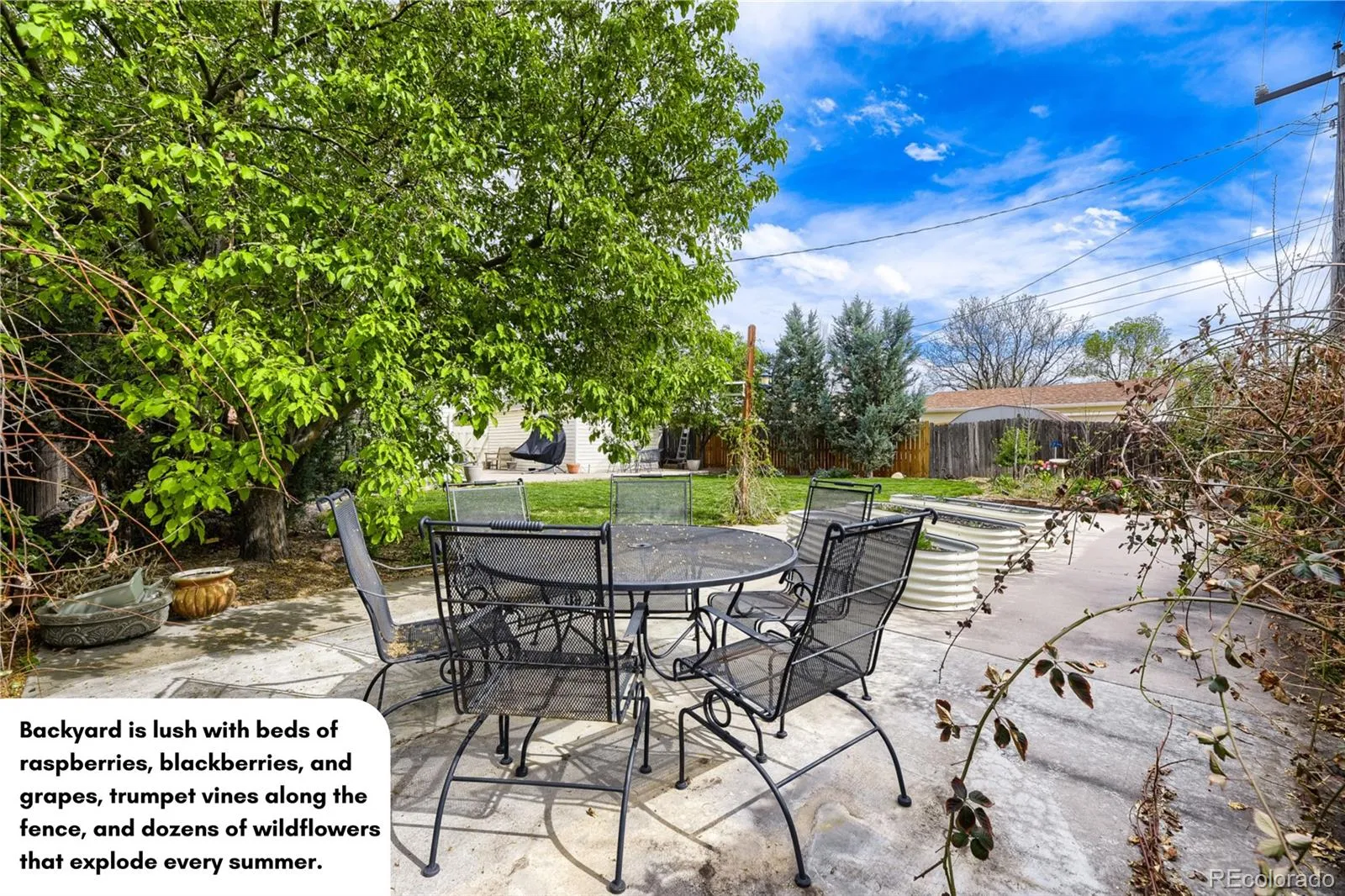 The backyard is something special. Established beds of raspberries, blackberries, and grapes, trumpet vines along the fence, and dozens of wildflowers that explode every summer. A paver-stone patio sits right off the back of the home with a second tucked-back seating area among the vines — the whole space has an almost wine country feel. Both yards are professionally landscaped with their own irrigation systems, and the patio is already plumbed for a gas BBQ.