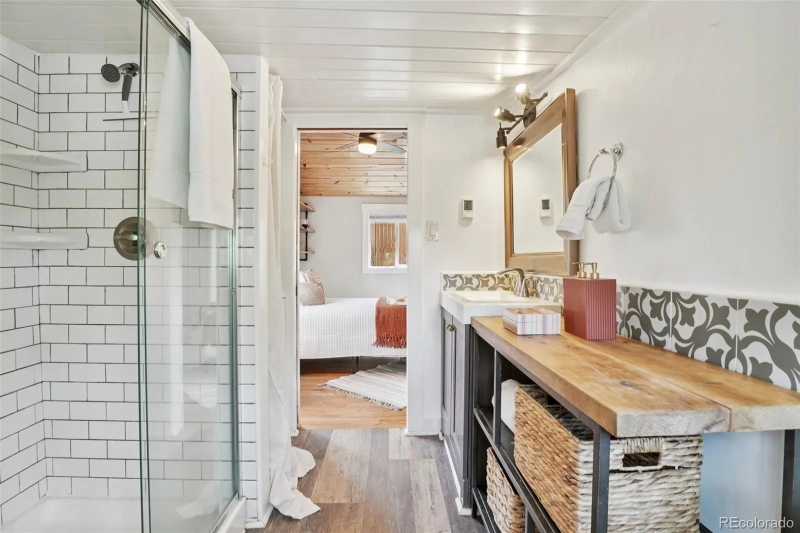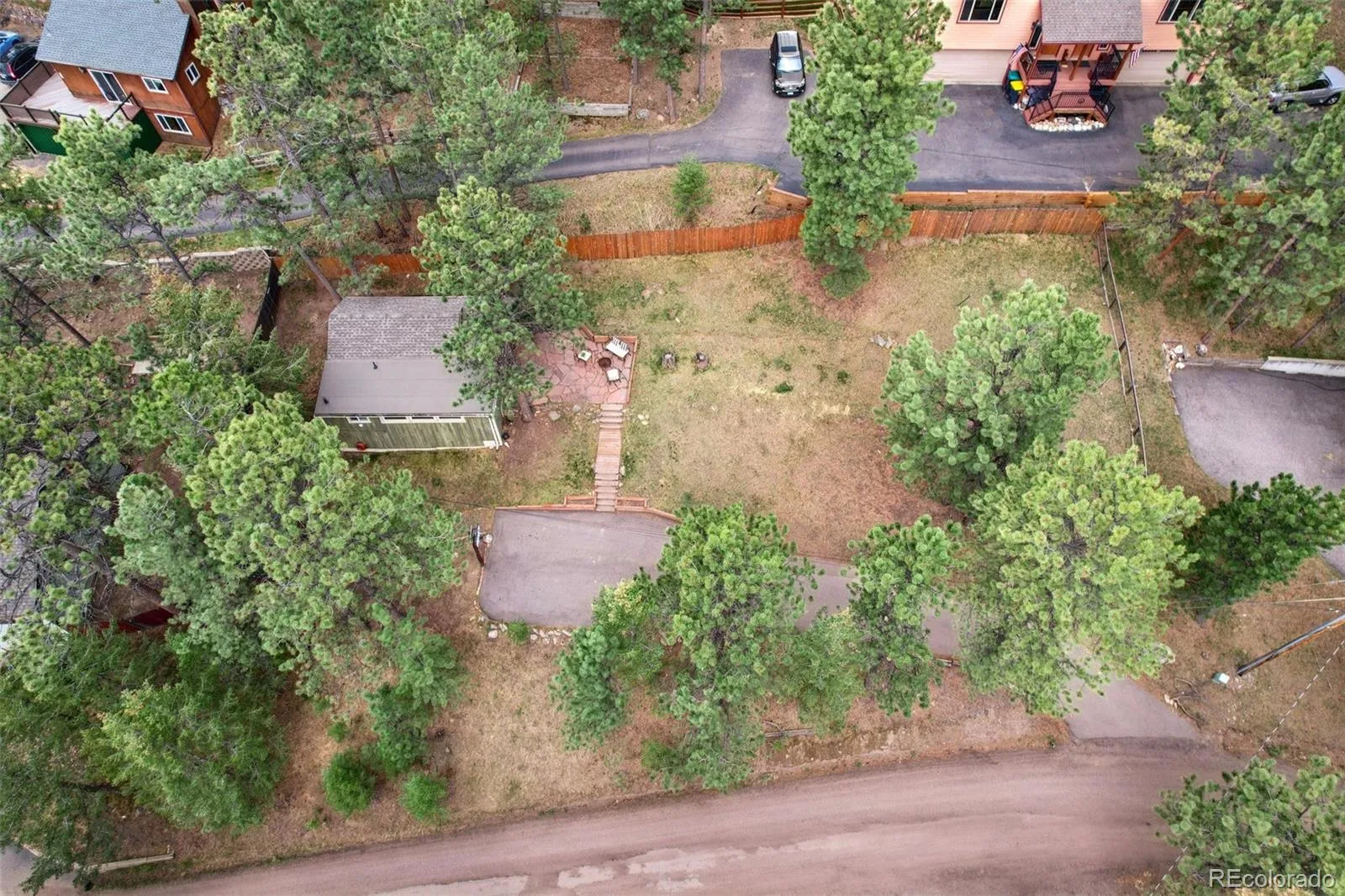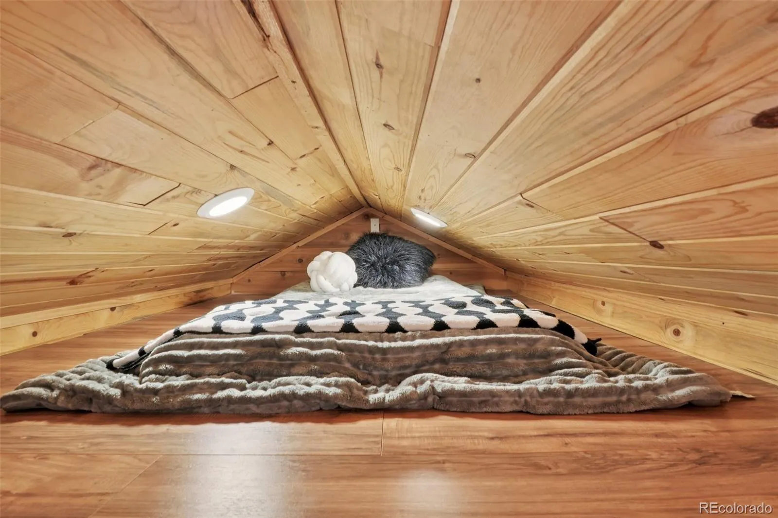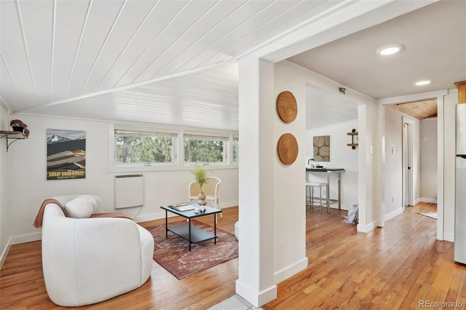 Some homes have a story — this one has a whole chapter. Nestled among soaring ponderosa pines in North Evergreen, this 1930s cabin has been reimagined with the kind of thoughtful, artful detail that makes you stop and take it all in. A craftsman-style entry with cedar gable, timber bracket accents, and a striking iron-detailed front door sets the tone before you even step inside. Once you do, warm hardwood floors, tongue-and-groove ceilings, and a wall of windows framing the treetops make the living space feel like a permanent vacation. The kitchen is equal parts functional and charming — stainless gas range, mosaic tile backsplash, and warm wood cabinetry that feels right at home in the mountains. Custom navy built-ins at the entry add a designer touch that carries throughout. The bedroom is a true retreat — vaulted knotty pine tongue-and-groove ceiling, exposed beams, a sliding barn door, a mini-split for year-round comfort, and a wooden ladder leading up to the most delightful sleeping loft tucked into the peak of the roofline. The spa-inspired bath features a subway tile walk-in shower, decorative tile backsplash, vanity with custom storage, radiant heated flooring, and stacked in-unit laundry. Outside, gather around the flagstone patio fire pit, unwind on the private side deck, let the kids discover the treehouse, or dream up possibilities in the oversized workshop shed. And for the savvy buyer — MR-3 zoning on this 12,000 sq ft lot allows for a duplex or two-family home, making this an exceptional opportunity to build equity or add income potential in one of Evergreen’s most desirable neighborhoods. Immediate income potential as a short-term rental at this price-point. Public water and sewer, no HOA, easy access to Denver — and a whole lot of Colorado soul. Don’t let this one get away.
