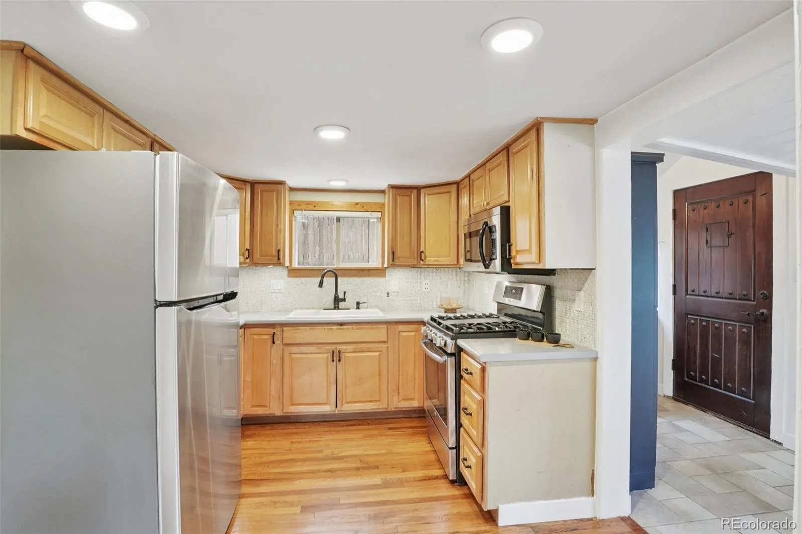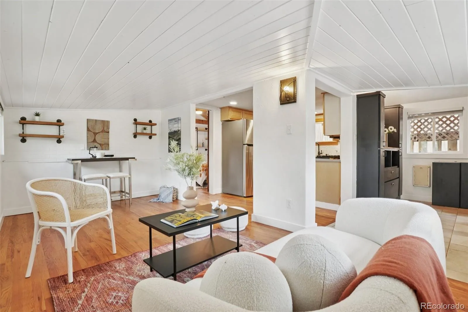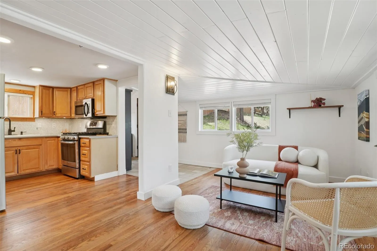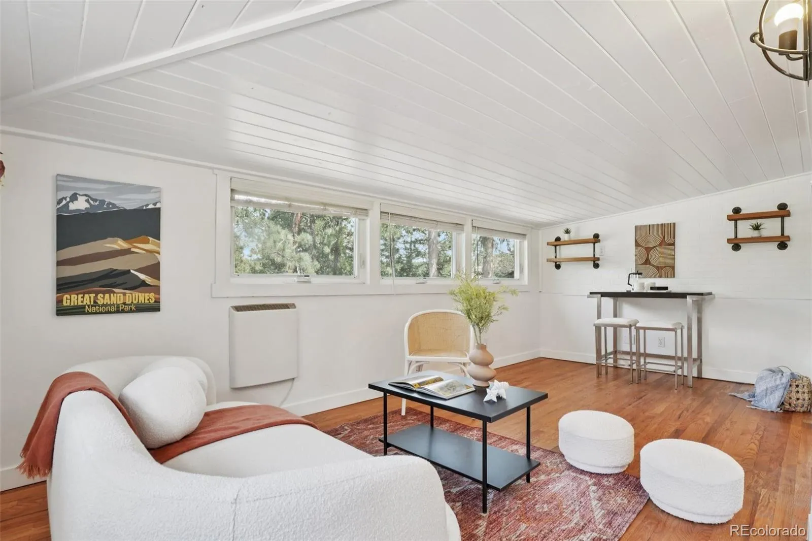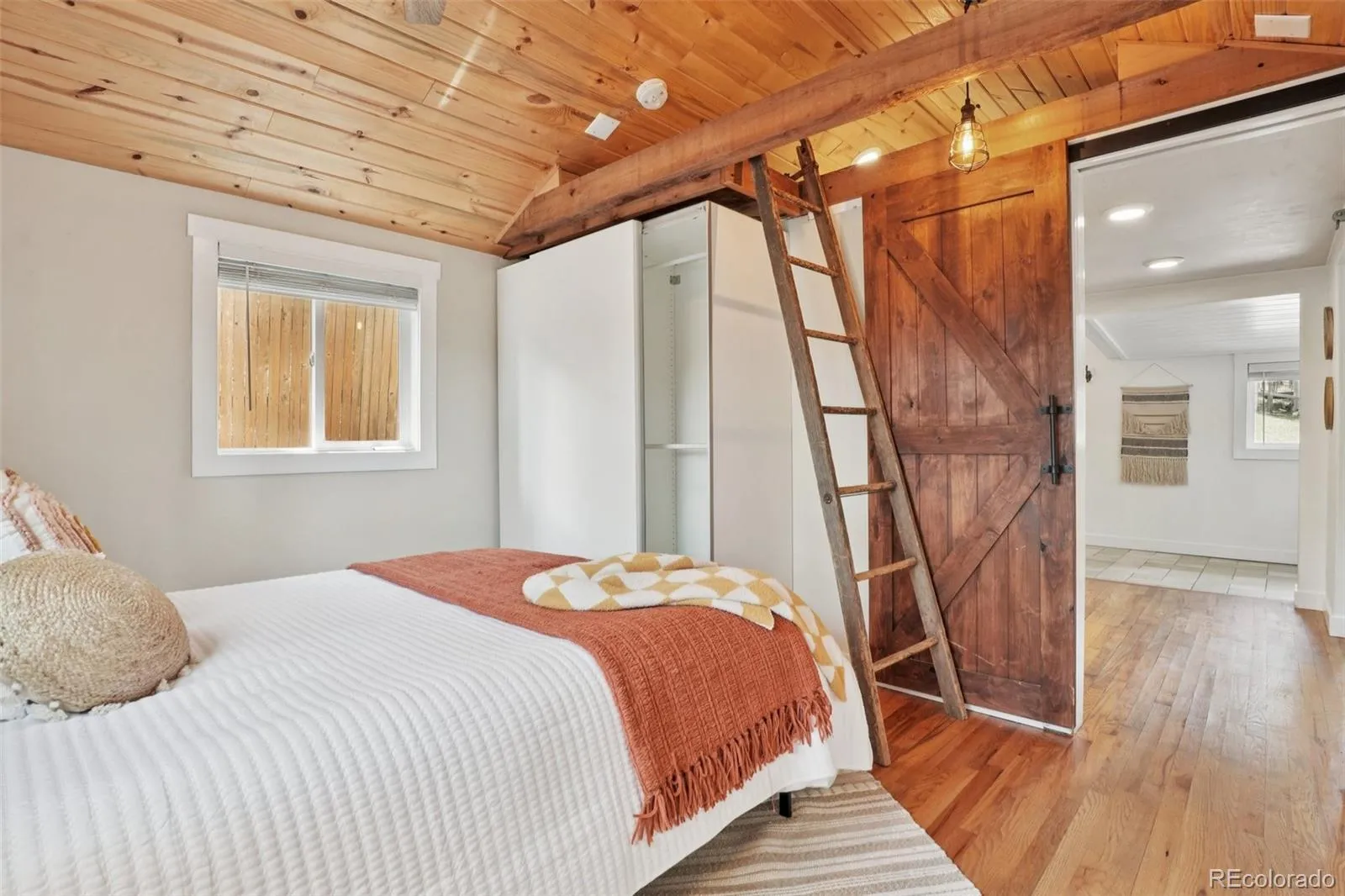 Some homes have a story — this one has a whole chapter. Nestled among soaring ponderosa pines in North Evergreen, this 1930s cabin has been reimagined with the kind of thoughtful, artful detail that makes you stop and take it all in. A craftsman-style entry with cedar gable, timber bracket accents, and a striking iron-detailed front door sets the tone before you even step inside. Once you do, warm hardwood floors, tongue-and-groove ceilings, and a wall of windows framing the treetops make the living space feel like a permanent vacation. The kitchen is equal parts functional and charming — stainless gas range, mosaic tile backsplash, and warm wood cabinetry that feels right at home in the mountains. Custom navy built-ins at the entry add a designer touch that carries throughout. The bedroom is a true retreat — vaulted knotty pine tongue-and-groove ceiling, exposed beams, a sliding barn door, a mini-split for year-round comfort, and a wooden ladder leading up to the most delightful sleeping loft tucked into the peak of the roofline. The spa-inspired bath features a subway tile walk-in shower, decorative tile backsplash, vanity with custom storage, radiant heated flooring, and stacked in-unit laundry. Outside, gather around the flagstone patio fire pit, unwind on the private side deck, let the kids discover the treehouse, or dream up possibilities in the oversized workshop shed. And for the savvy buyer — MR-3 zoning on this 12,000 sq ft lot allows for a duplex or two-family home, making this an exceptional opportunity to build equity or add income potential in one of Evergreen’s most desirable neighborhoods. Immediate income potential as a short-term rental at this price-point. Public water and sewer, no HOA, easy access to Denver — and a whole lot of Colorado soul. Don’t let this one get away.