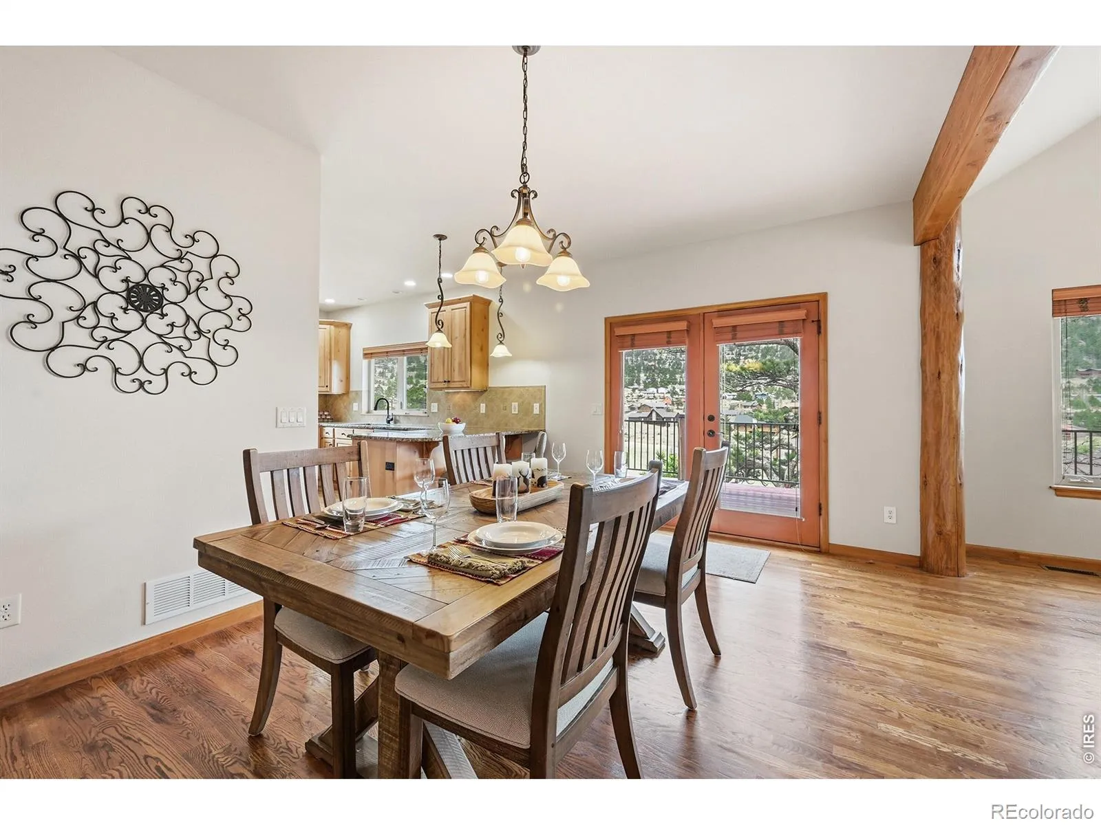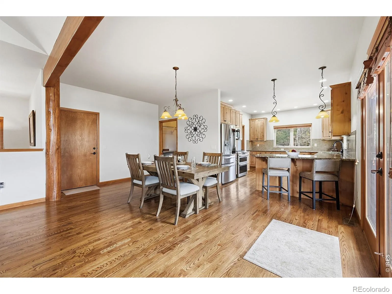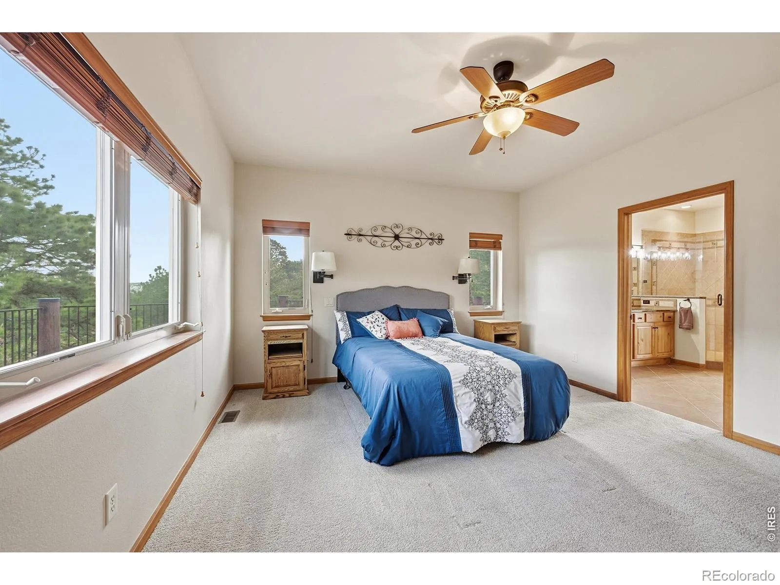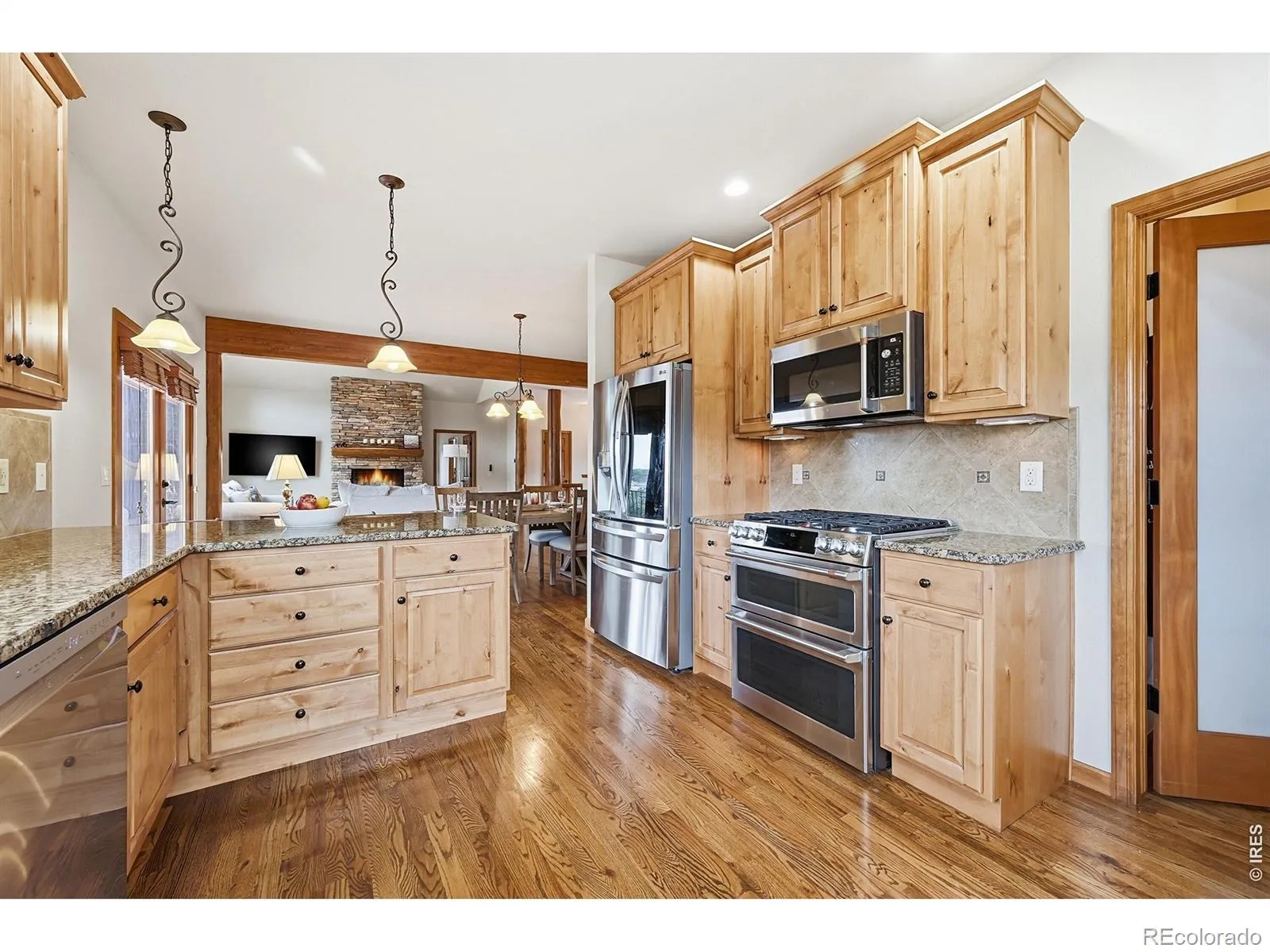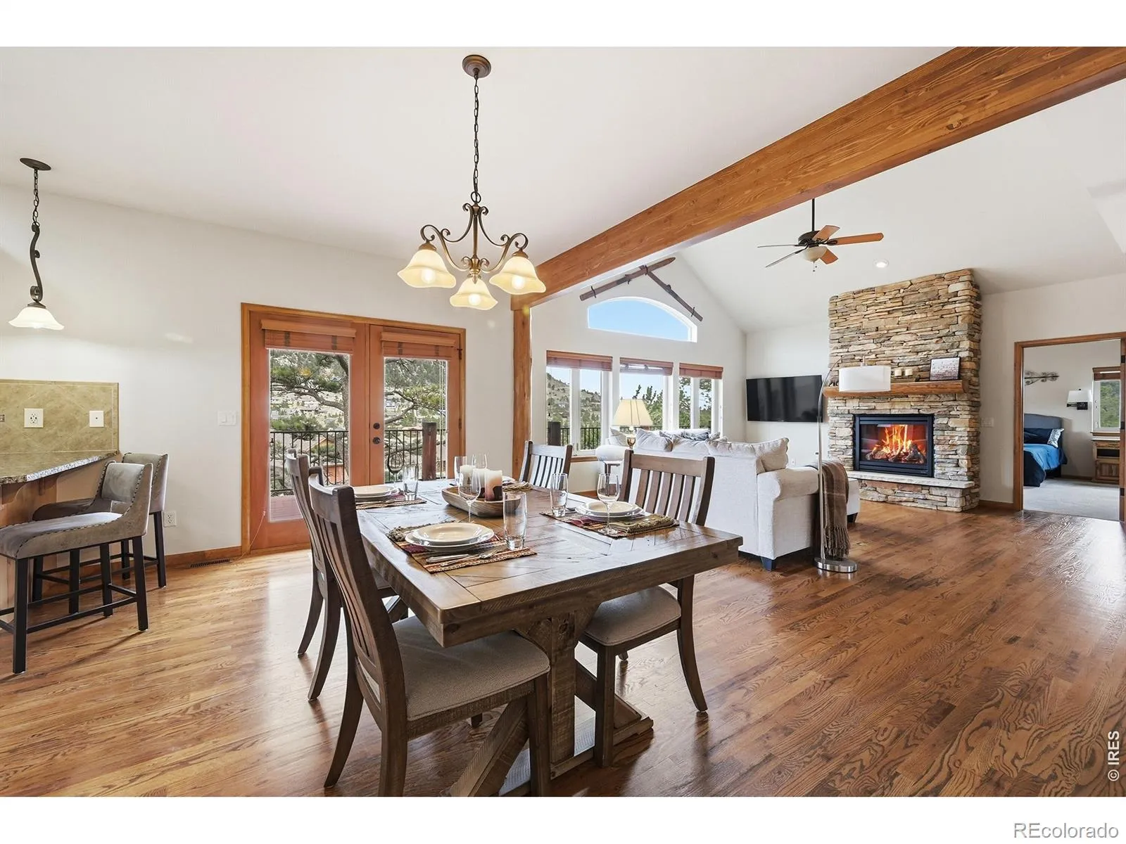 Nestled at the base of Prospect Mountain, this stunning walk-out ranch offers the perfect blend of privacy, comfort, and breathtaking natural beauty on just over an acre in Estes Park. Backing to open space, this property provides unmatched tranquility, unobstructed views, and frequent wildlife sightings-truly embracing the Colorado mountain lifestyle while still being just minutes from town.With 3,052 square feet of thoughtfully designed living space, this 4-bedroom, 3.5-bath home delivers both functionality and elegance. Step inside to be greeted by expansive mountain views, wood floors, and charming pine log accents that instantly create a sense of home. The open-concept main level features seamless flow between the kitchen, dining, and living areas-ideal for entertaining or relaxing by the impressive stone fireplace while soaking in views for miles.The well-appointed kitchen is a chef’s dream, complete with stainless steel appliances, knotty alder cabinetry, granite countertops, and a spacious walk-in pantry. The main-level primary suite is a private retreat, offering a luxurious 5-piece bath with a soaking tub, expansive shower, and serene surroundings.The lower level is designed for comfort and flexibility, featuring a large family room with a second gas fireplace, a second primary suite with ensuite bath and walk-in closet, plus two additional generously sized bedrooms. A full bath and bonus hobby/office/storage nook complete the space.Outdoor living truly shines with a redwood wraparound deck and expansive lower patio-perfect for entertaining, unwinding, or watching elk wander through the open space. This property offers a peaceful escape with easy access to all that Estes Park has to offer-dining, shopping, Lake Estes recreation, and Rocky Mountain National Park adventures. Check out additional features list in supplements. HE Furnace 2022. 50 year roof shingle. 5 year roof cert. Measurements approximate. Buyer to verify.