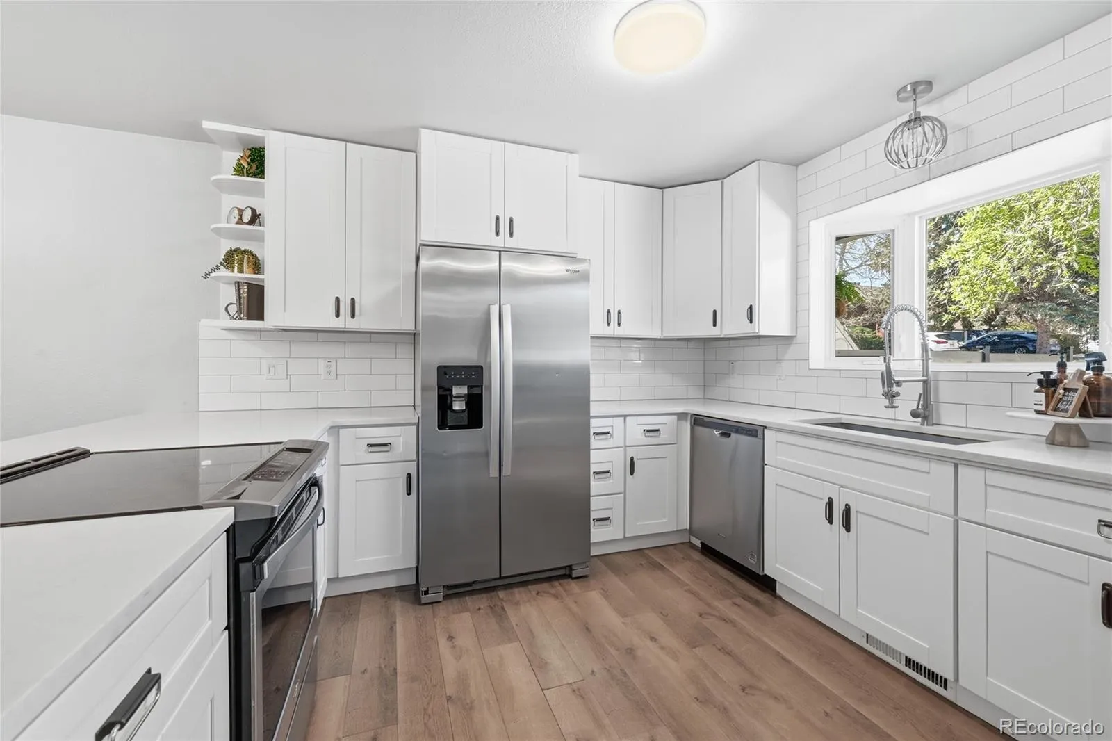 The fully refreshed kitchen is designed to impress, featuring quartz countertops, stainless steel appliances, and crisp white cabinetry. Whether you’re hosting gatherings or enjoying a quiet night in, this space feels bright, open, and connected exactly how today’s buyers want to live.