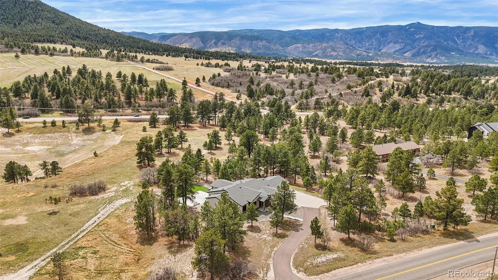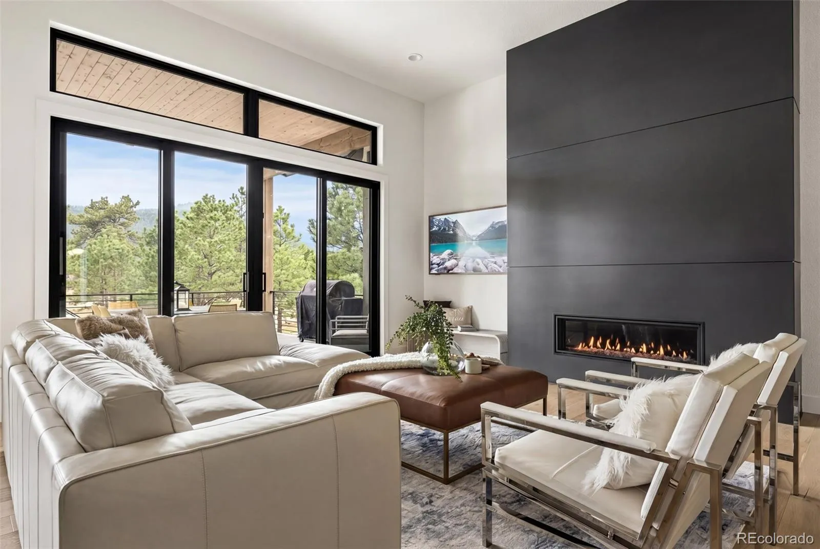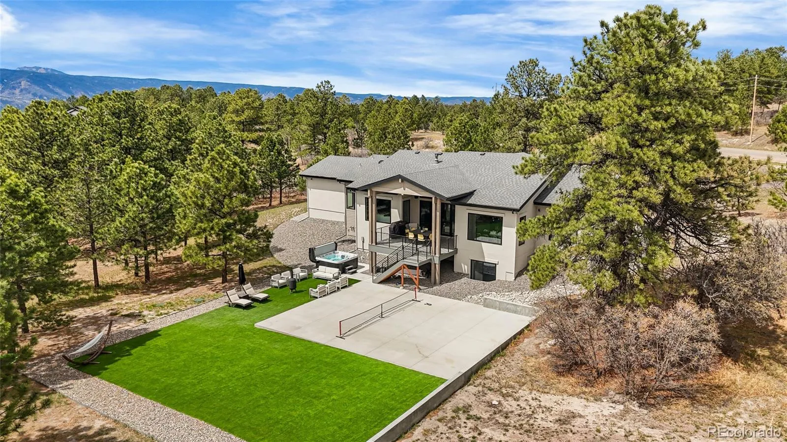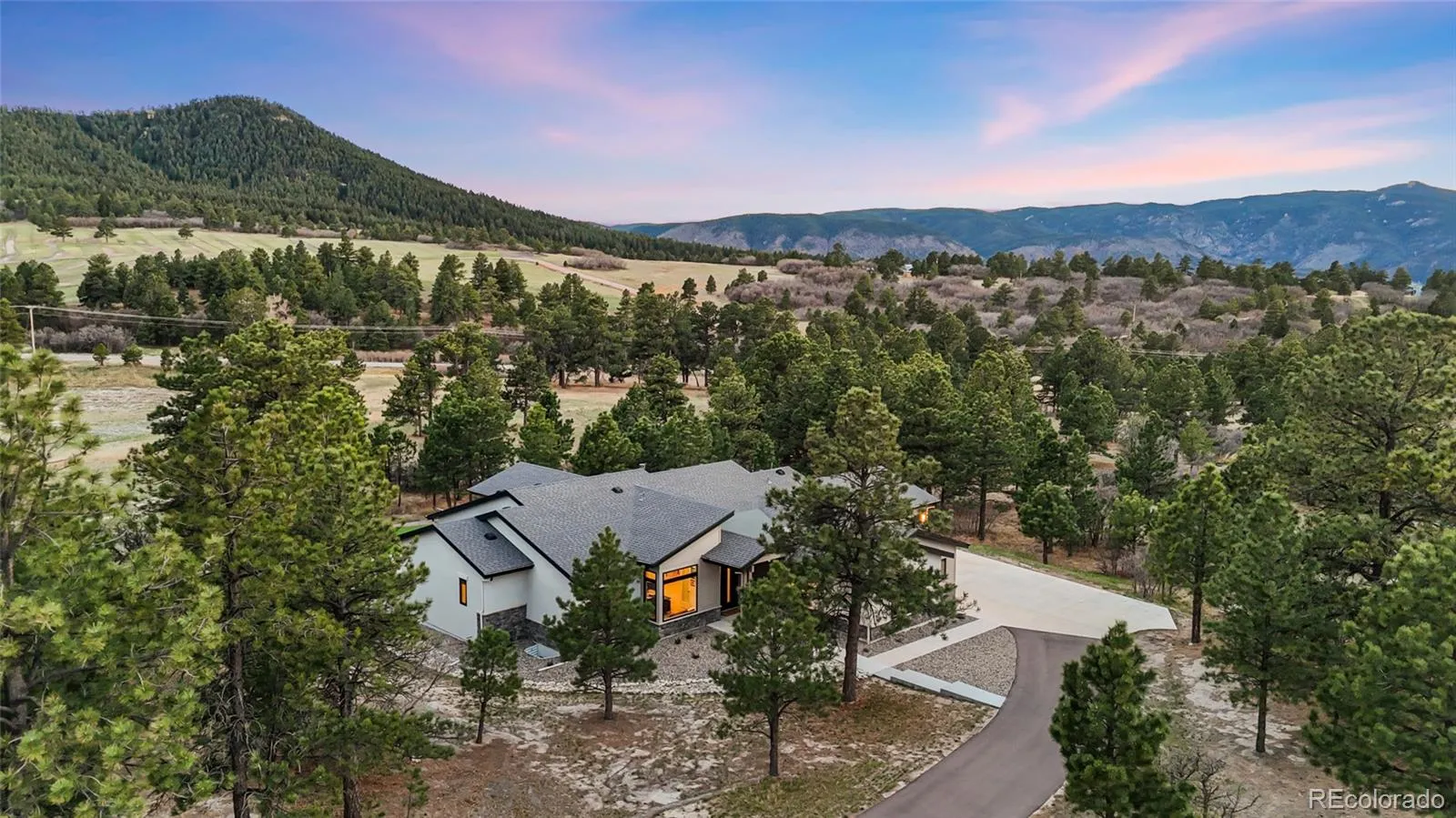 Experience the perfect blend of Colorado’s rugged beauty and modern sophistication on nearly five pristine acres in Larkspur. This custom-built estate offers a true mountain retreat lifestyle with easy access to Castle Rock, I-25, and the Front Range as well as Costco and a shopping center just 10 minutes up the road. Inside, 10-foot ceilings and curated lighting set a tone of effortless luxury. The expansive great room is anchored by a dramatic floor-to-ceiling cold-rolled steel fireplace, while oversized windows frame stunning Rocky Mountain views. The gourmet kitchen is designed for both performance and entertaining, featuring an 8-burner gas range, double wall ovens, built-in refrigerator, and premium finishes, all flowing seamlessly into the main living spaces. The primary suite offers a private retreat with a spa-inspired five-piece bath, a spacious walk-in closet, and direct access to the laundry room. The main level also includes a dedicated office and two additional bedrooms. The finished basement expands the home’s footprint with media and gathering spaces, a home gym, sauna, private guest suite, and a large unfinished area ready for customization. Modern living is elevated with gig-speed fiber internet, whole-home wiring, mesh Wi-Fi, and a built-in sound system extending to the covered Trex deck. Unlike typical mountain properties, this nearly 5-acre lot is remarkably flat, offering rare usability for outdoor living, events, or recreation. Enjoy low-maintenance turf, professional xeriscaping, and a private hot tub perfect for stargazing. A rare opportunity to own a legacy property that delivers luxury, privacy, and convenience without compromise.