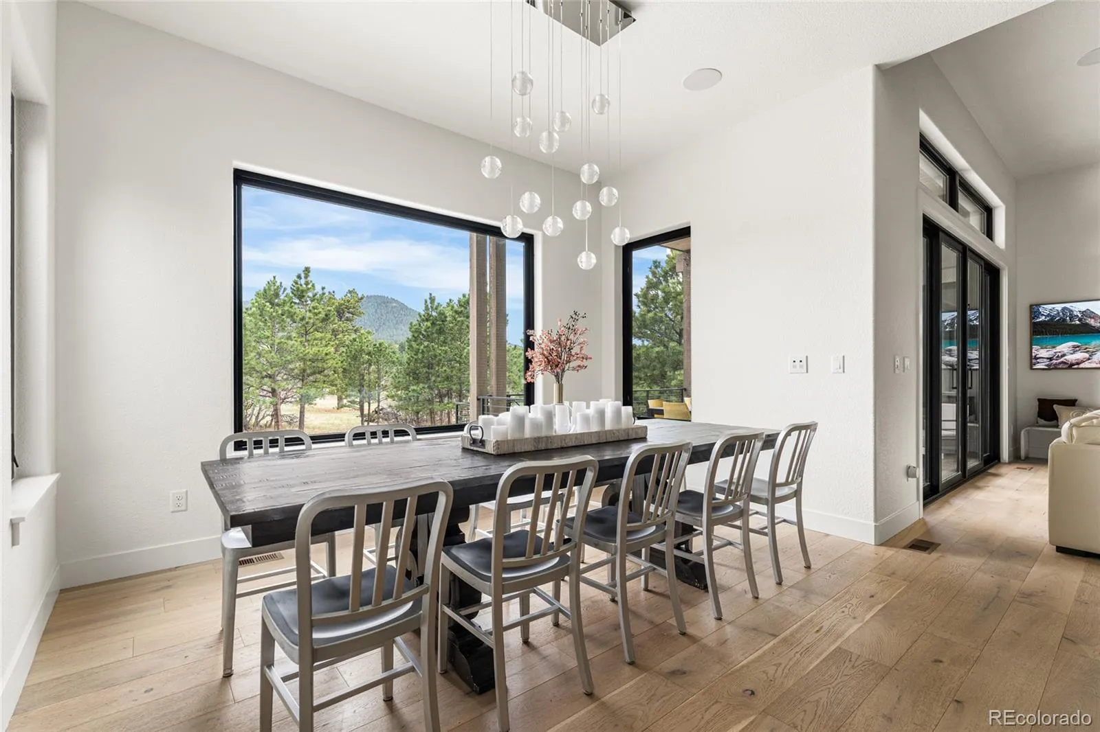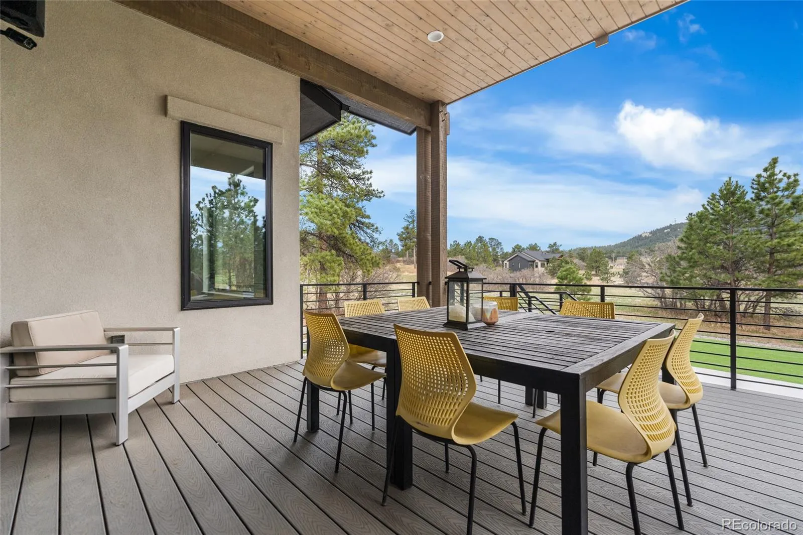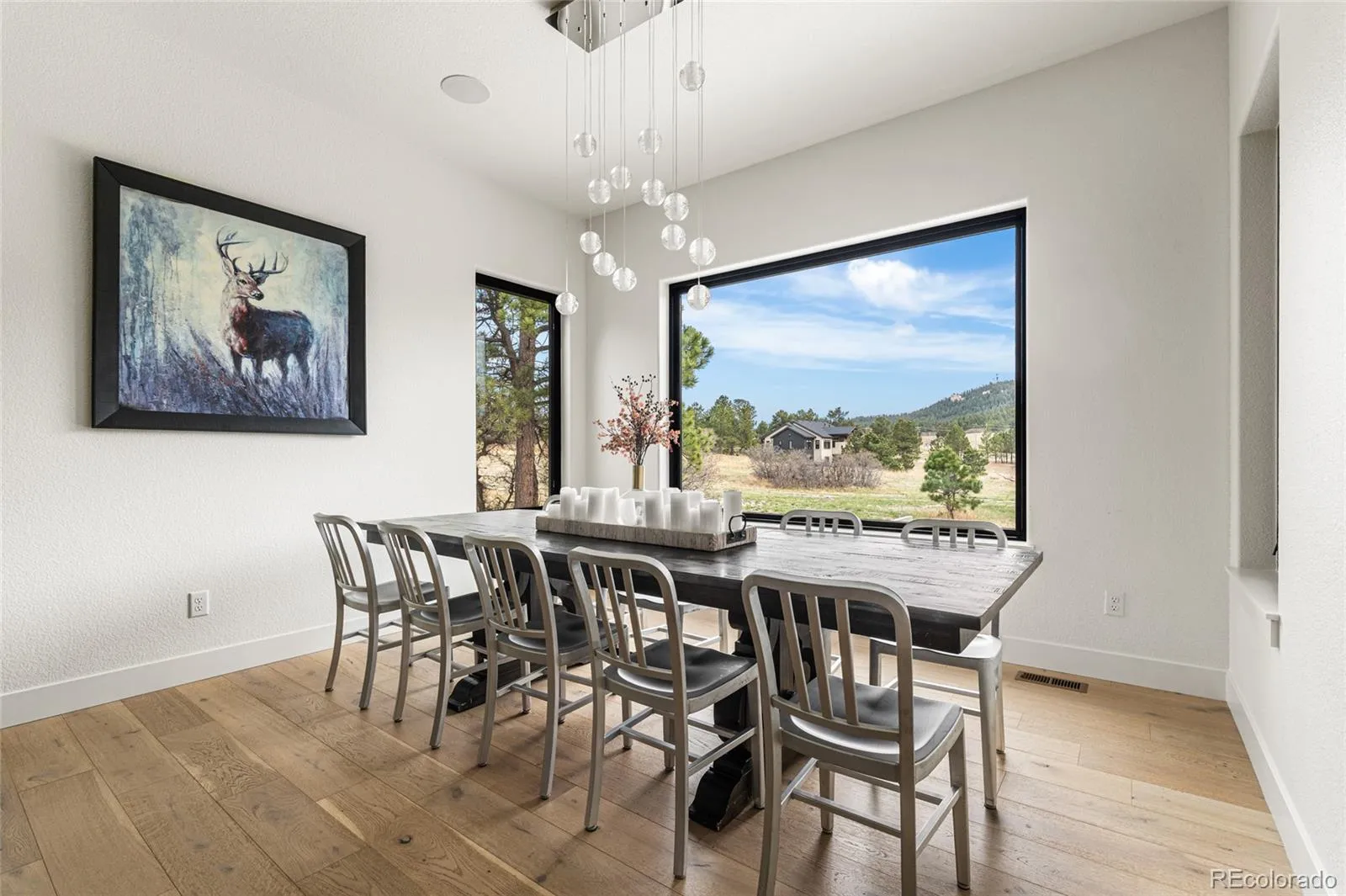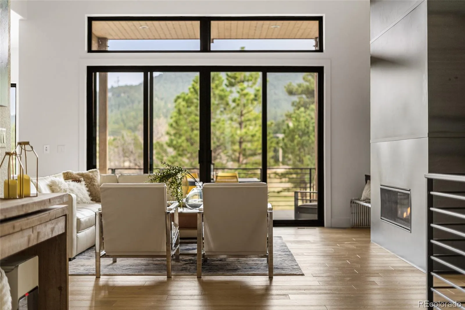 Experience the perfect blend of Colorado’s rugged beauty and modern sophistication on nearly five pristine acres in Larkspur. This custom-built estate offers a true mountain retreat lifestyle with easy access to Castle Rock, I-25, and the Front Range as well as Costco and a shopping center just 10 minutes up the road. Inside, 10-foot ceilings and curated lighting set a tone of effortless luxury. The expansive great room is anchored by a dramatic floor-to-ceiling cold-rolled steel fireplace, while oversized windows frame stunning Rocky Mountain views. The gourmet kitchen is designed for both performance and entertaining, featuring an 8-burner gas range, double wall ovens, built-in refrigerator, and premium finishes, all flowing seamlessly into the main living spaces. The primary suite offers a private retreat with a spa-inspired five-piece bath, a spacious walk-in closet, and direct access to the laundry room. The main level also includes a dedicated office and two additional bedrooms. The finished basement expands the home’s footprint with media and gathering spaces, a home gym, sauna, private guest suite, and a large unfinished area ready for customization. Modern living is elevated with gig-speed fiber internet, whole-home wiring, mesh Wi-Fi, and a built-in sound system extending to the covered Trex deck. Unlike typical mountain properties, this nearly 5-acre lot is remarkably flat, offering rare usability for outdoor living, events, or recreation. Enjoy low-maintenance turf, professional xeriscaping, and a private hot tub perfect for stargazing. A rare opportunity to own a legacy property that delivers luxury, privacy, and convenience without compromise.