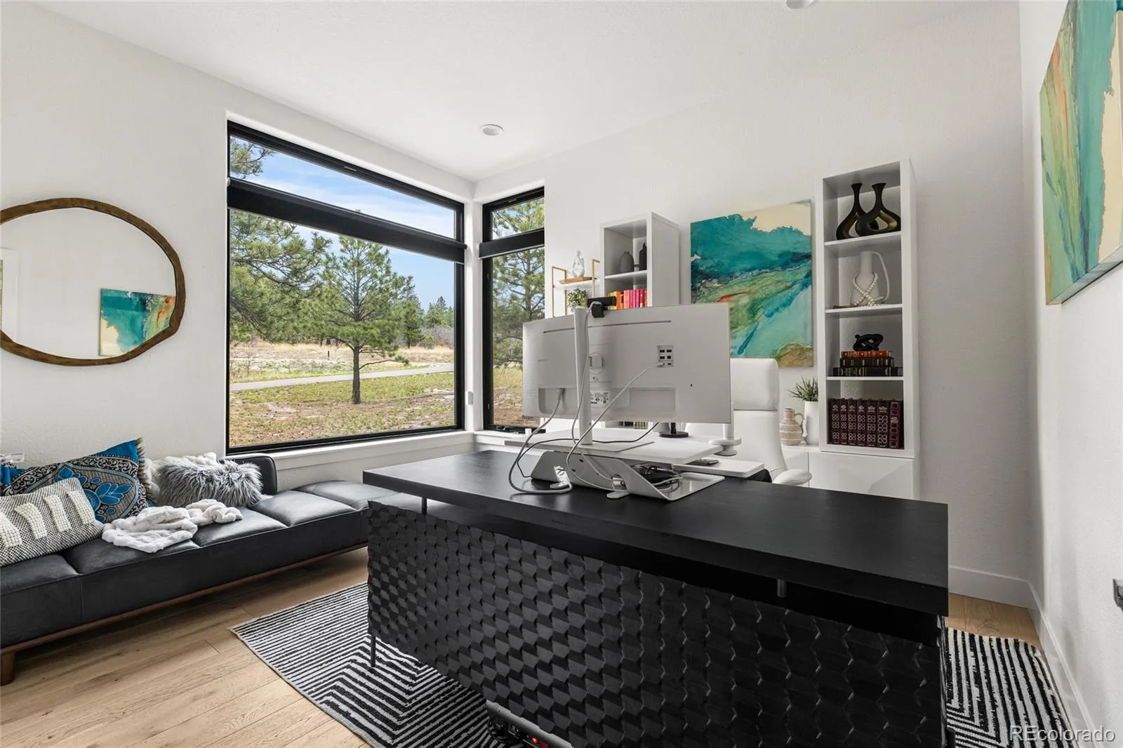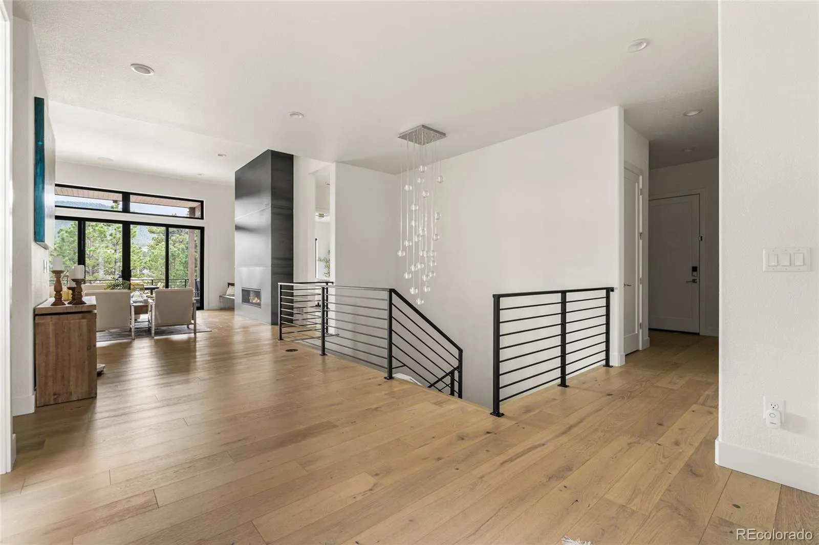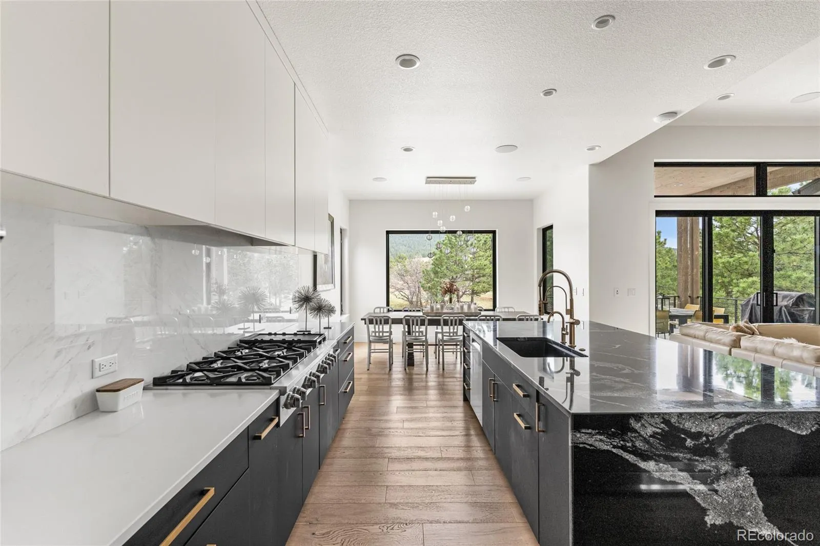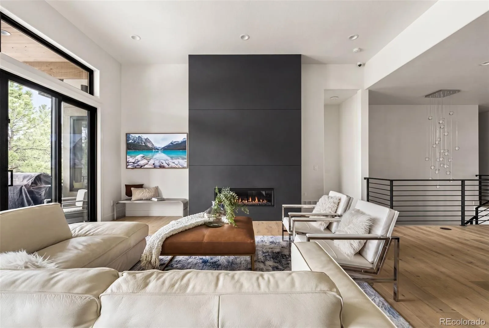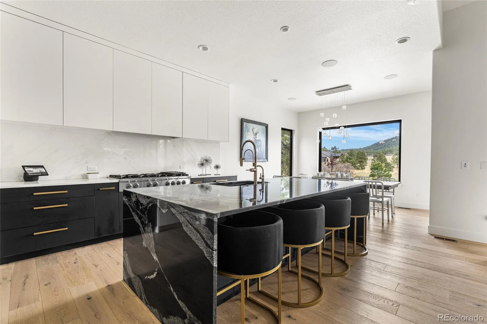 Experience the perfect blend of Colorado’s rugged beauty and modern sophistication on nearly five pristine acres in Larkspur. This custom-built estate offers a true mountain retreat lifestyle with easy access to Castle Rock, I-25, and the Front Range as well as Costco and a shopping center just 10 minutes up the road. Inside, 10-foot ceilings and curated lighting set a tone of effortless luxury. The expansive great room is anchored by a dramatic floor-to-ceiling cold-rolled steel fireplace, while oversized windows frame stunning Rocky Mountain views. The gourmet kitchen is designed for both performance and entertaining, featuring an 8-burner gas range, double wall ovens, built-in refrigerator, and premium finishes, all flowing seamlessly into the main living spaces. The primary suite offers a private retreat with a spa-inspired five-piece bath, a spacious walk-in closet, and direct access to the laundry room. The main level also includes a dedicated office and two additional bedrooms. The finished basement expands the home’s footprint with media and gathering spaces, a home gym, sauna, private guest suite, and a large unfinished area ready for customization. Modern living is elevated with gig-speed fiber internet, whole-home wiring, mesh Wi-Fi, and a built-in sound system extending to the covered Trex deck. Unlike typical mountain properties, this nearly 5-acre lot is remarkably flat, offering rare usability for outdoor living, events, or recreation. Enjoy low-maintenance turf, professional xeriscaping, and a private hot tub perfect for stargazing. A rare opportunity to own a legacy property that delivers luxury, privacy, and convenience without compromise.