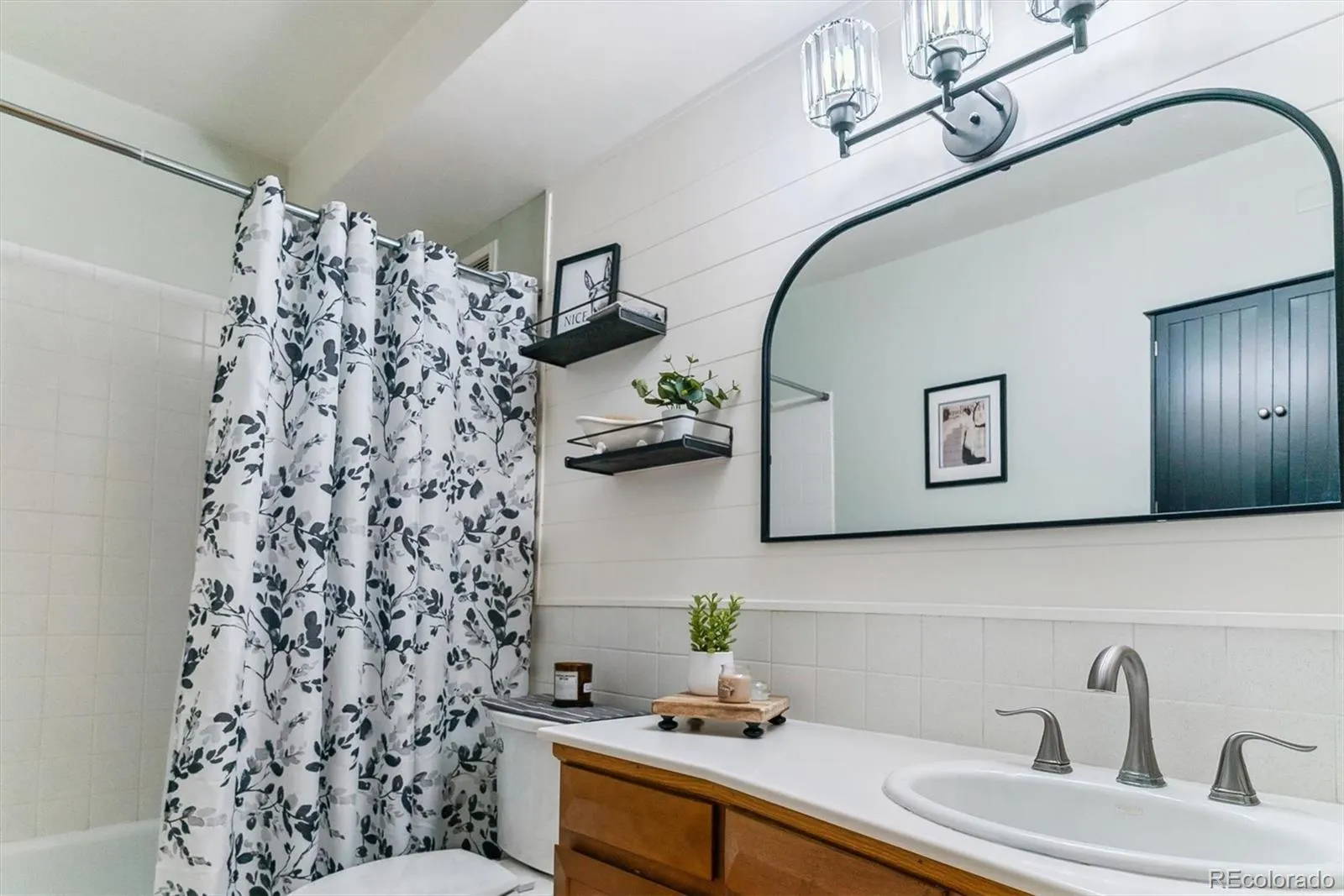 The bathroom has been stylishly refreshed with shiplap detailing, updated lighting, modern mirror, and shower head. Both bedrooms are bright and inviting with ceiling fans and custom blinds.