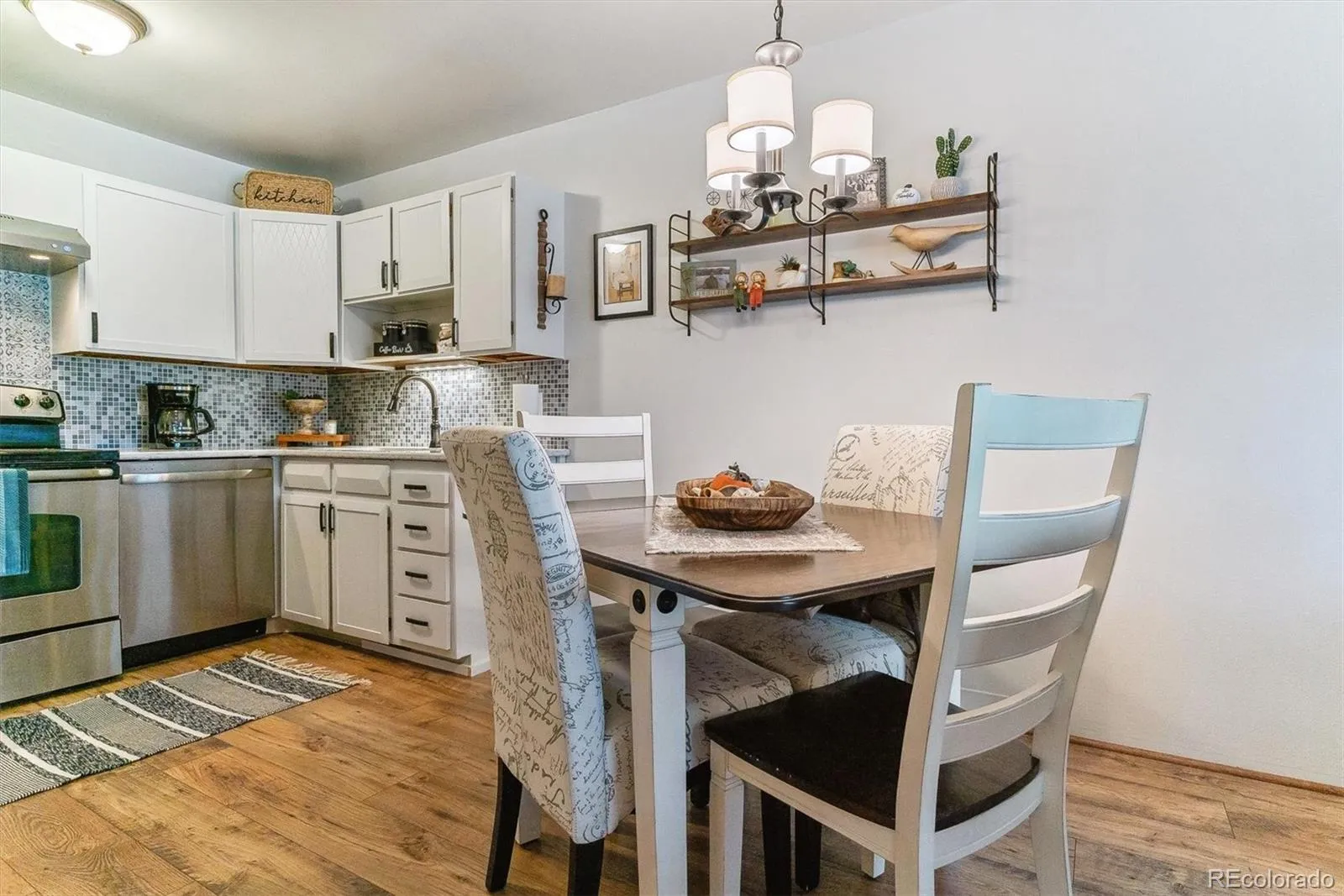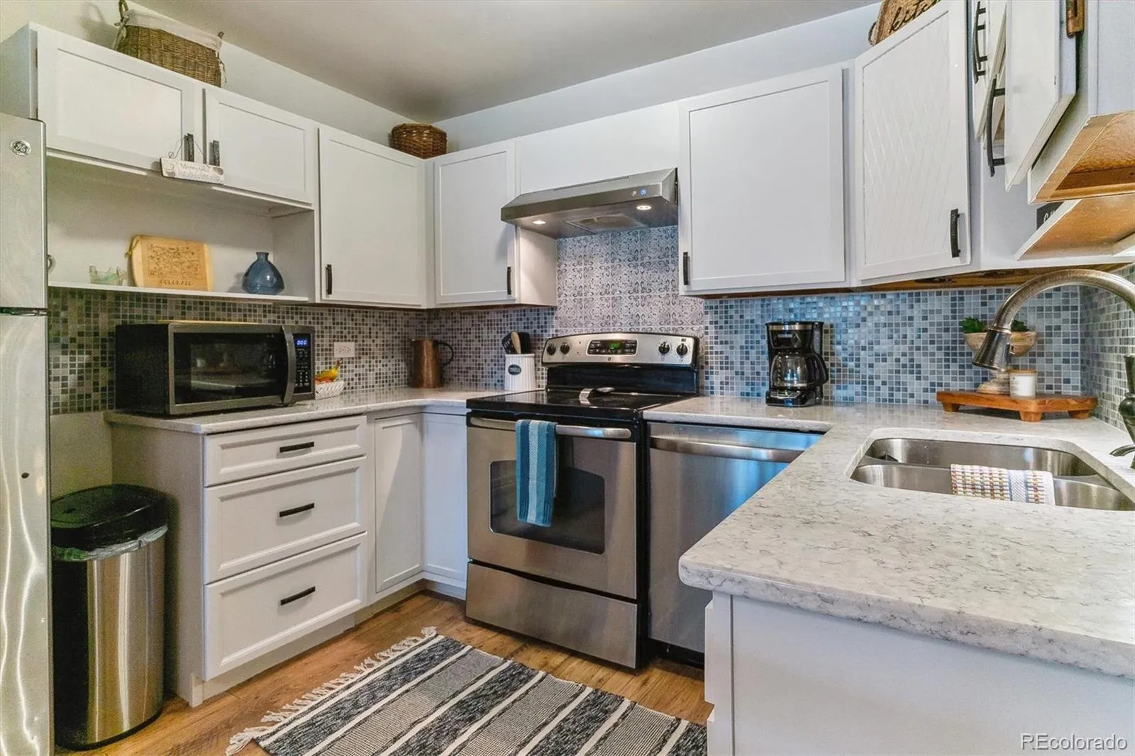 New wide-plank luxury vinyl flooring flows through the kitchen and spacious living area, while a thoughtfully designed drop zone at the entry improves functionality and expands the kitchen. The kitchen features quartz countertops, custom tile backsplash, fresh paint, and upgrades including a newer dishwasher, faucet, cabinet hardware, and light fixture.
