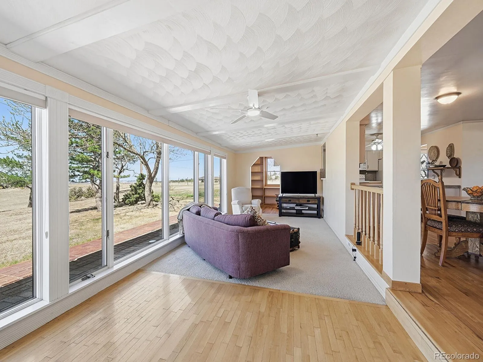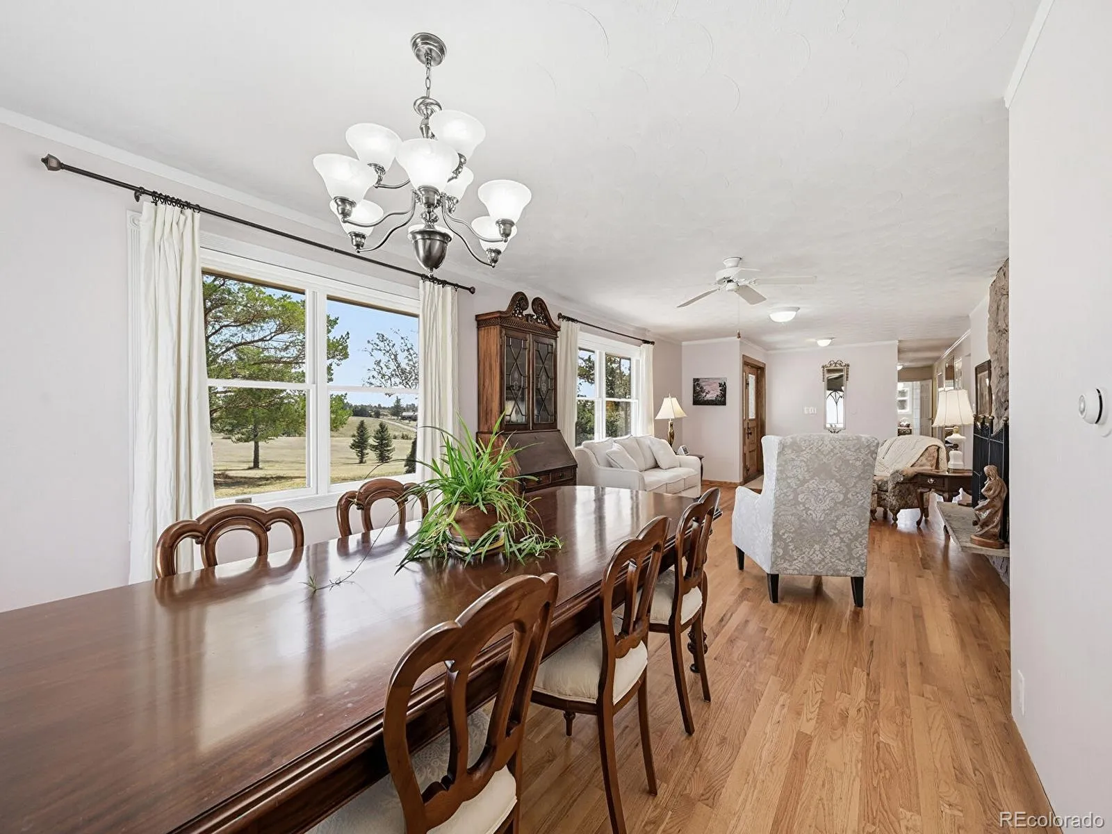 Inside, the bright and welcoming living room features a striking stone wood-burning fireplace—perfect for cozy Colorado evenings. The dining room is perfect for large gatherings. The primary suite serves as a private retreat, complete with dual closets and an en-suite bathroom. The kitchen is thoughtfully designed with modern appliances and opens to a comfortable dining area, ideal for gatherings. Just beyond, the sunroom offers a peaceful space to enjoy your morning coffee while taking in sweeping panoramic views of the Front Range, along with stunning sunsets and sparkling city lights.