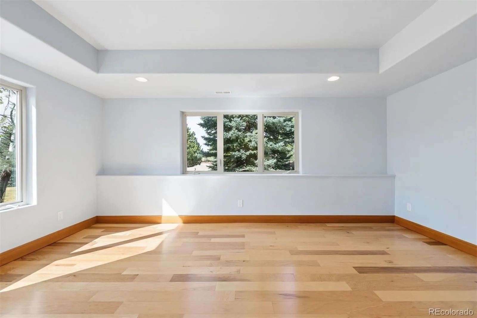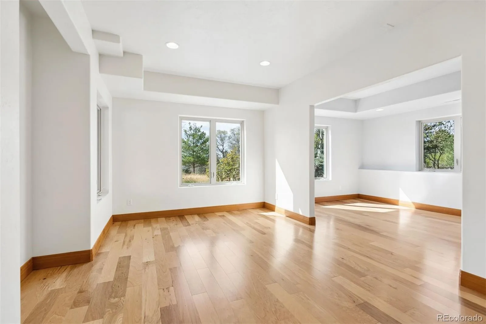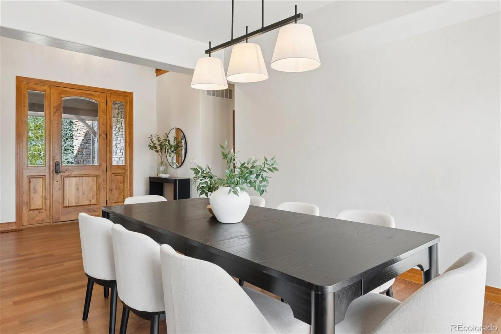 Set high on a hill in The Timbers and backing to open space, this custom two-story estate offers exceptional privacy on a beautifully treed 1.3-acre site, with sweeping mountain views that stretch from Long’s Peak to Pikes Peak. The setting is quiet and secluded, thoughtfully positioned to capture Colorado’s natural beauty at every turn. Beyond the setting, the home itself delivers soaring ceilings, rich wood beams, and expansive picture windows that frame the views and fill the space with natural light. The main level is anchored by a warm, inviting great room just off the kitchen, along with a formal dining room and a private study with fireplace. The kitchen is well-equipped and functional, featuring a large island with bar seating, a secondary prep sink, beverage refrigerator drawers, a wine refrigerator, and a six-burner Thermador gas cooktop. Double patio doors from the dining area open directly to the new deck, creating an easy indoor-outdoor connection. Fresh paint, newly refinished hardwood floors, and brand-new carpet (upstairs) bring a clean, updated feel throughout. Upstairs, four bedrooms include a spacious primary suite with a sitting area, fireplace, and private deck positioned to take in the full span of mountain views. Each secondary bedroom offers direct bathroom access and walk-in closets, creating a thoughtful upper-level layout. The finished walkout basement adds a dedicated theater/media room, large family room with bar, exercise room, and a private guest suite with bath. Outdoor living takes center stage with a newly built deck and expansive patio, complemented by multiple fire pit areas, hot tub, and garden beds, all oriented toward the peaceful, panoramic landscape. A side load four-car garage and high end garage cabinetry completes this ideal home. A complete offering in The Timbers, combining a spacious lot, thoughtful layout, mountain views, and a compelling price point.