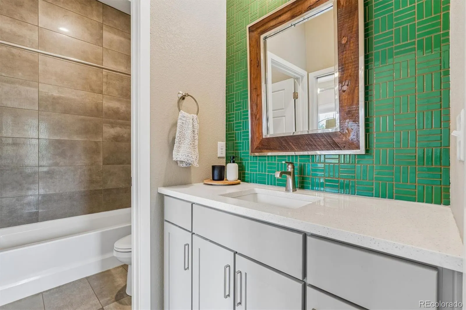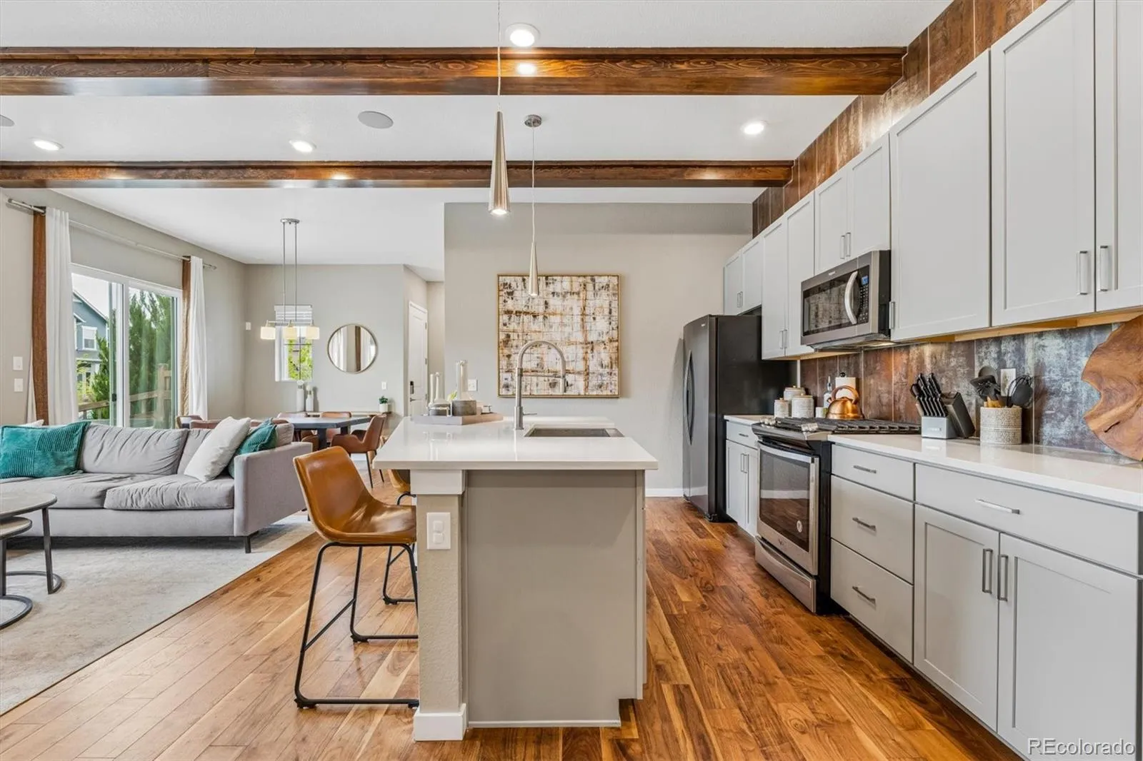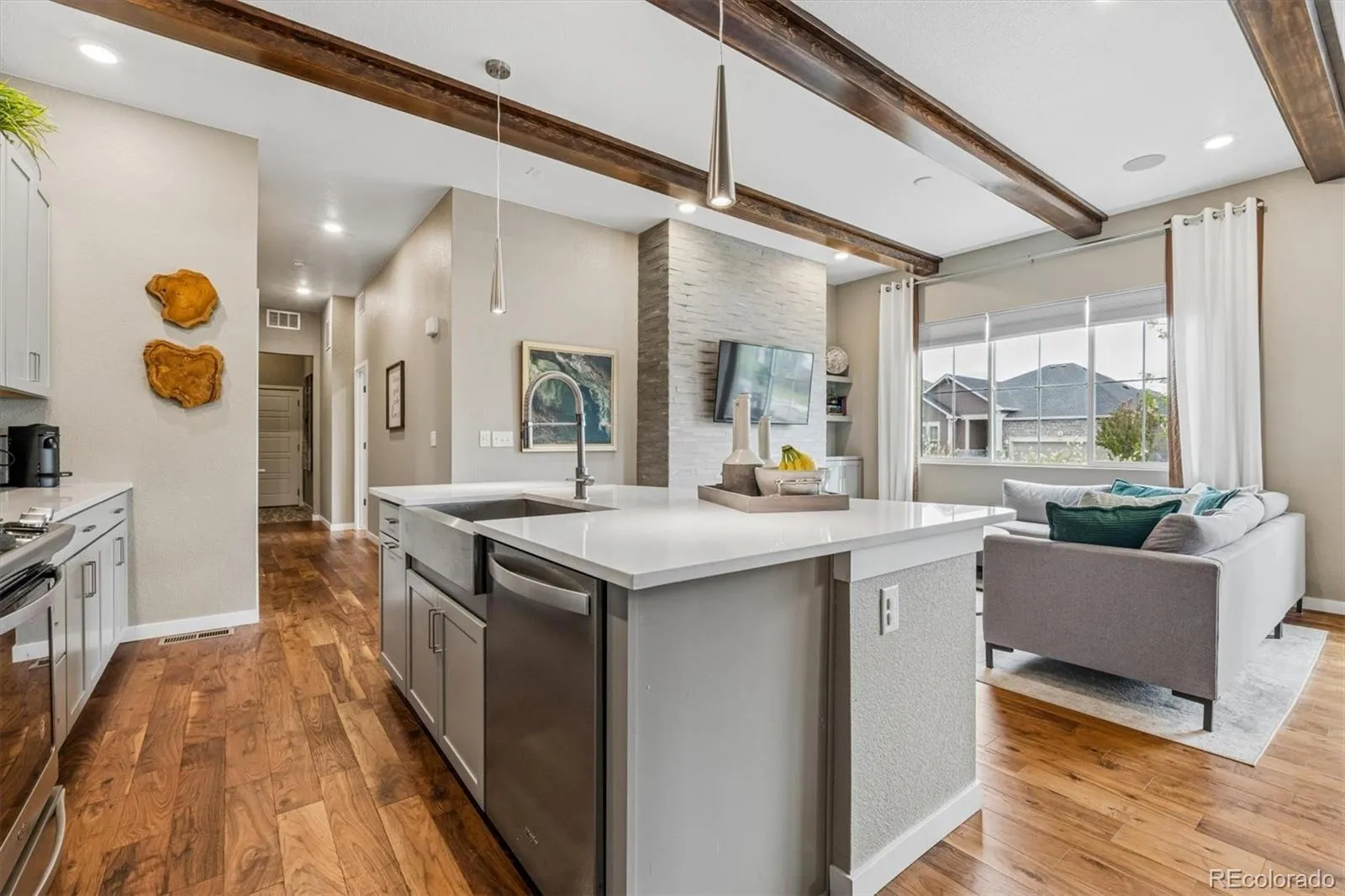 Welcome to this beautifully designed 3 bedroom, 3 bathroom single-family home in Brighton, offering a modern open-concept layout and stylish finishes throughout. The kitchen is a true centerpiece, featuring quartz countertops, light grey cabinetry, and stainless steel appliances, all seamlessly open to the main living space. The living room is filled with natural light and showcases wood flooring, stunning ceiling beams, and a sleek stone fireplace, creating a warm yet contemporary feel. The dining area flows effortlessly between the kitchen and living room, with direct access to the backyard—perfect for everyday living and entertaining. The primary suite is a relaxing retreat, complete with a dramatic accent wall, abundant natural light, a walk-in closet, and a private ensuite bath featuring a dual vanity, walk-in glass shower, and toilet room. A secondary bedroom includes its own ensuite bath, ideal for guests or a growing household. The full bath stands out with an eye-catching accent wall, shower/tub combo, sink, and toilet. The conveniently located laundry room includes washer/dryer hookups, a utility sink, and ample cabinet storage, with direct access to the attached 2-car garage. The finished full basement offers exceptional flexibility with a spacious layout perfect for entertaining, relaxing, and/or home gym. A basement bedroom and full bath with stylish tilework provides a comfortable space for guests or additional living needs. Step outside to enjoy the fully fenced backyard, ideal for summer BBQs, gatherings, kids at play, or pets to roam. Located near shopping, dining, trails, and great schools, this home offers comfort, style, and convenience. Come see today!