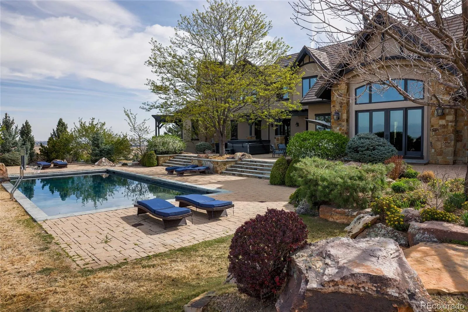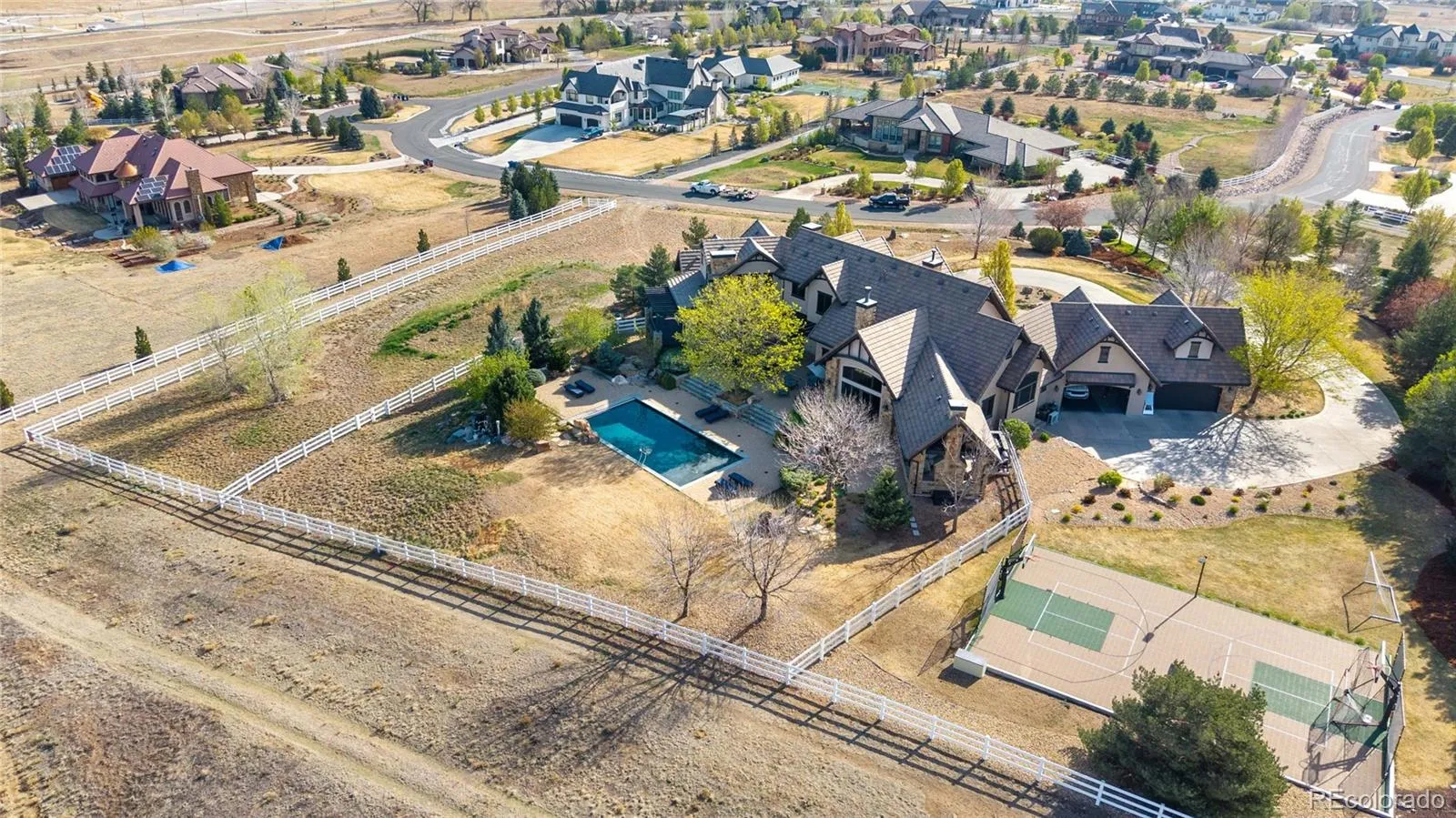 Experience unparalleled luxury where breathtaking, unobstructed mountain views greet you from every turn. Nestled on a premier 2.63-acre homesite within the prestigious Spruce Meadows Estate Community, this masterfully crafted estate offers a rare blend of elegance and tranquility with the flexibility to add an additional accessory building or detached garage. The sprawling grounds are designed for relaxation and active living, featuring a sparkling outdoor pool, a private sports court, and a sprawling backyard sanctuary complete with a covered veranda, outdoor fireplace, built-in grill and cozy gas firepit perfect for crisp Colorado evenings. Inside, the home showcases exceptional craftsmanship with rich woodwork, hardwood floors, and a dramatic vaulted great room anchored by massive beams and a floor-to-ceiling rock fireplace. The gourmet chef’s kitchen is a culinary triumph, equipped with top-tier Wolf and Subzero appliances, custom cabinetry, and a sunny breakfast nook that opens to the outdoor pavilion. Retreat to the main-floor primary suite, a private haven featuring a cozy fireplace, a private balcony, and a spa-like bath with soaring ceilings and stunning views. The upper level offers two spacious bedrooms with private en-suite baths, alongside a versatile loft with an adjoining bath that can easily serve as a third upstairs bedroom. The walk-out lower level is designed for ultimate recreation, boasting a game room with a full bar, a dedicated media room with theater seating, and a private, spa-like guest suite. Additionally, the property features an oversized four-car garage with a versatile attic space, perfect for a private workout room or home studio. This one-of-a-kind legacy estate pairs flawless finishes with an unmatched Front Range backdrop, commanding a premier position atop one of Broomfield’s highest points.