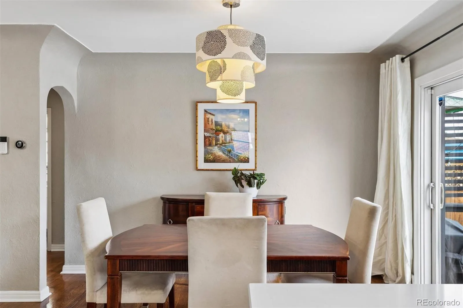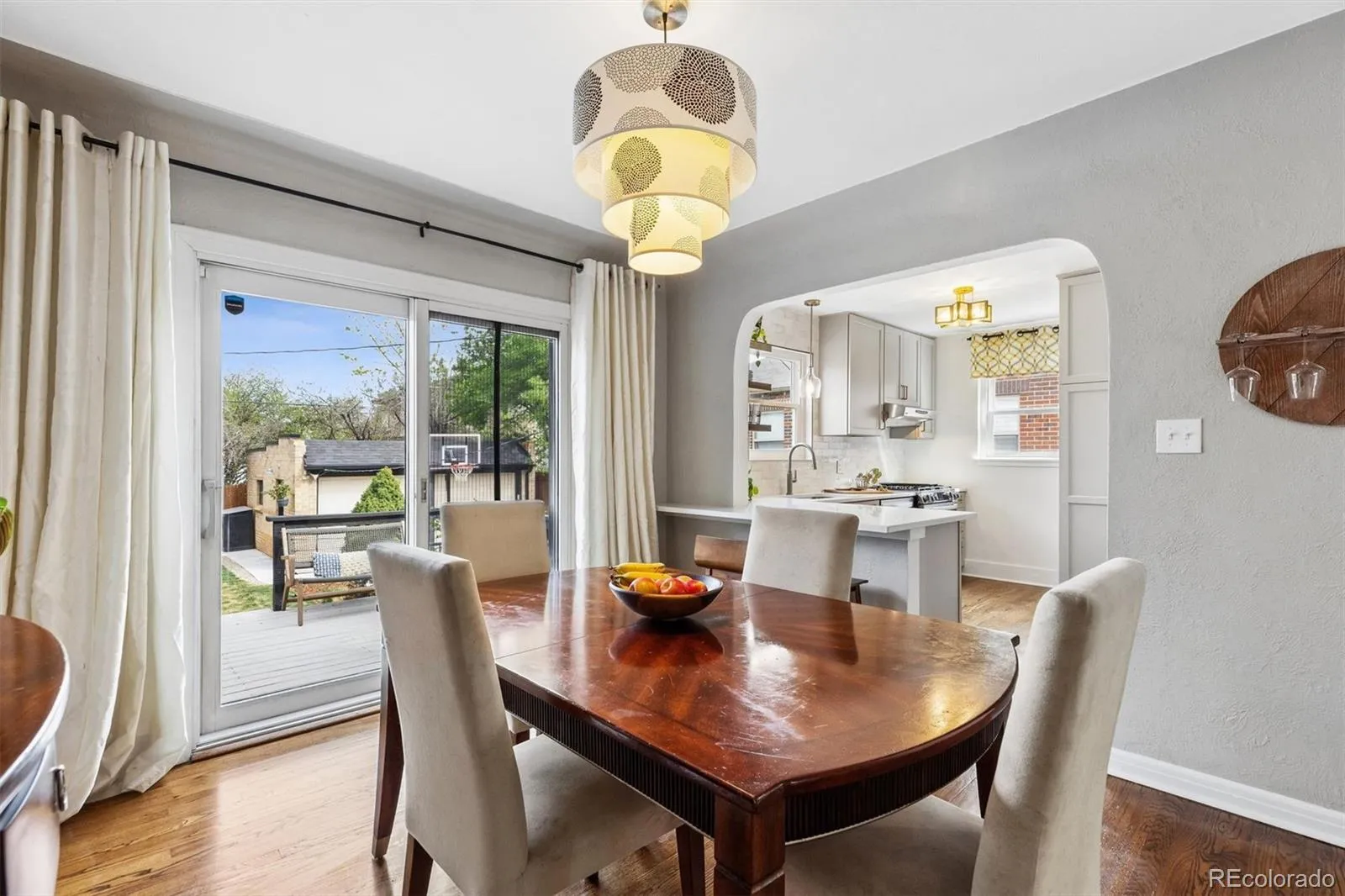 Welcome to 788 Glencoe Street, a 1942 International Style home in Denver’s Hilltop/Mayfair neighborhood, offering architectural character, flexible living, and a highly connected location near parks, dining, and major employment centers. Natural light fills the home through divided-light windows, highlighting hardwood floors throughout main floor and original details including coved ceilings, art niches, and glass doorknobs with decorative escutcheons. The main living area is anchored by a distinctive tile fireplace with simple column detailing and a honed travertine surround, reflecting the home’s early modern design. The updated kitchen features a peninsula with bar seating, creating an open connection between cooking, dining, and outdoor living. The dining room features sliding doors to a 16 x 12 deck overlooking the spacious, fully fenced, private yard. The layout includes four bedrooms, with two conforming bedrooms in the fully finished basement, offering flexibility for guests, office space, or additional living. The backyard faces east and is designed for both everyday use and entertaining, with mature trees providing privacy, low-maintenance decking, raised garden beds, and a dedicated fire pit area. Additional features include central heating and air conditioning, a two-car detached garage, yard sprinklers front and back. Situated on a 6,250 square foot lot along a tree-lined street, the home is just a short distance to Cranmer Park, Crestmoor Park, Denver Tennis Club, Rose Medical Center, and the shops and restaurants at 9th & CO. The location also offers convenient access to City Park, Denver Zoo and Museums, downtown Denver, Cherry Creek, the RTD A-Line, Denver International Airport, and Anschutz Medical Campus.