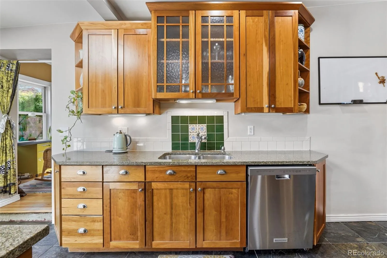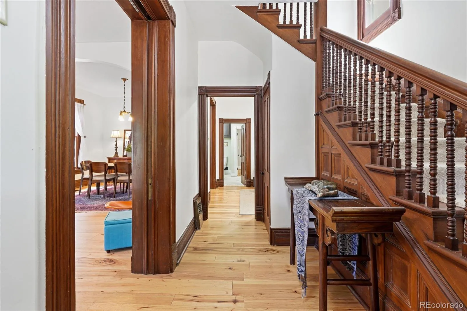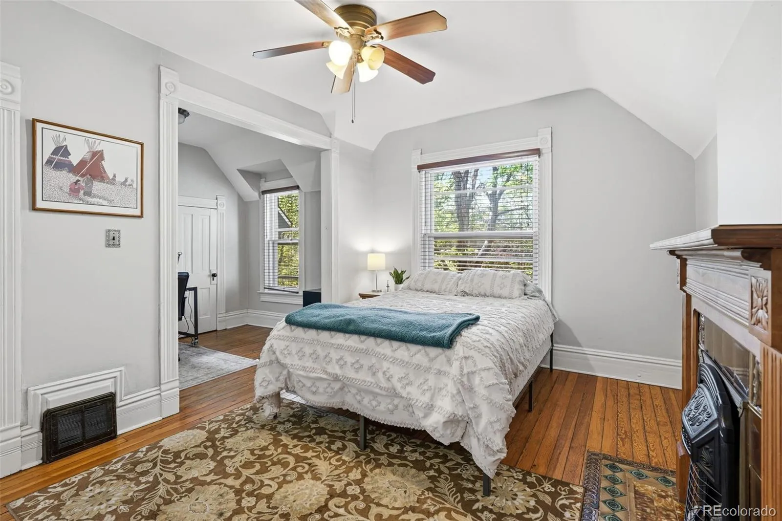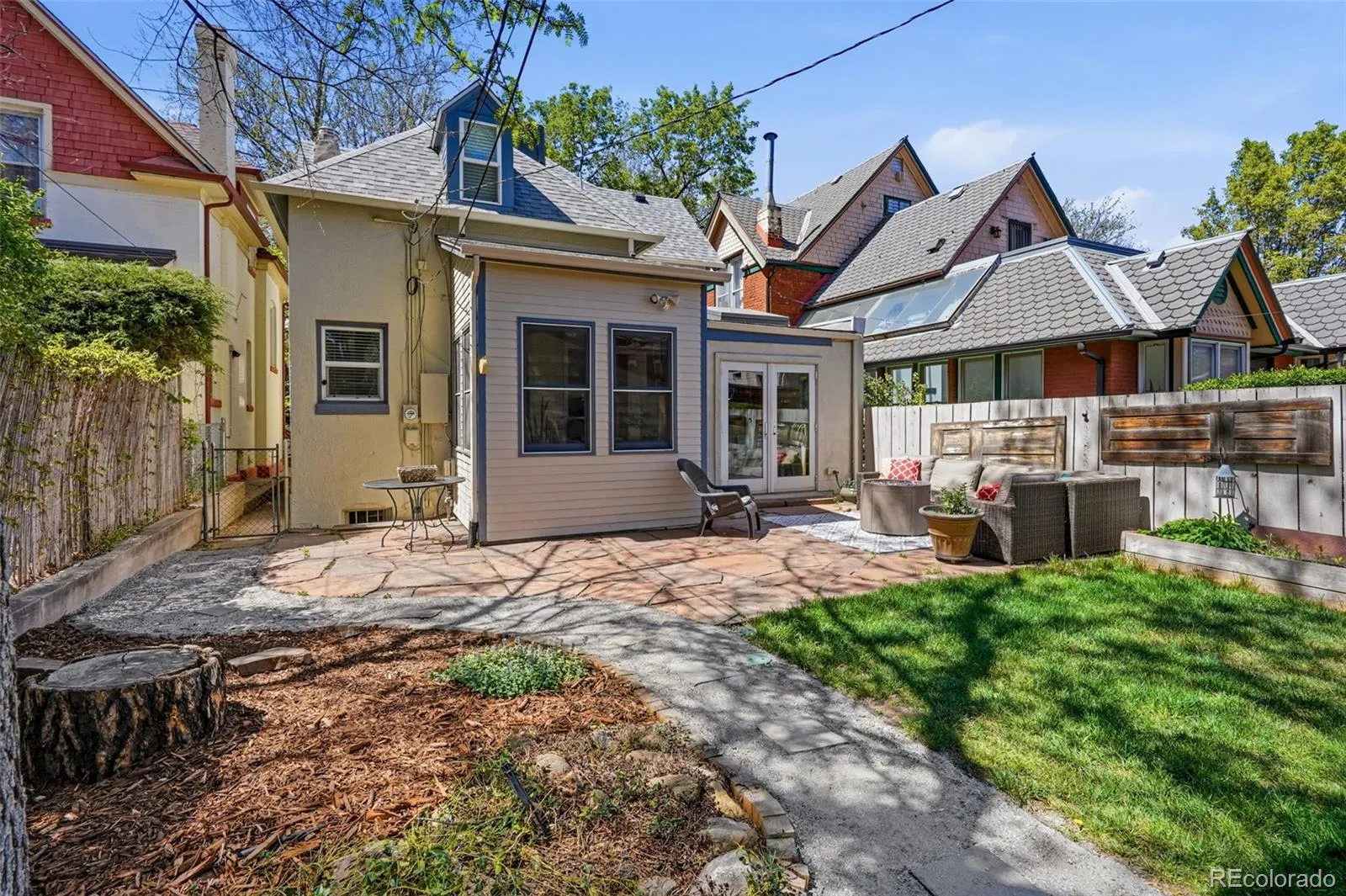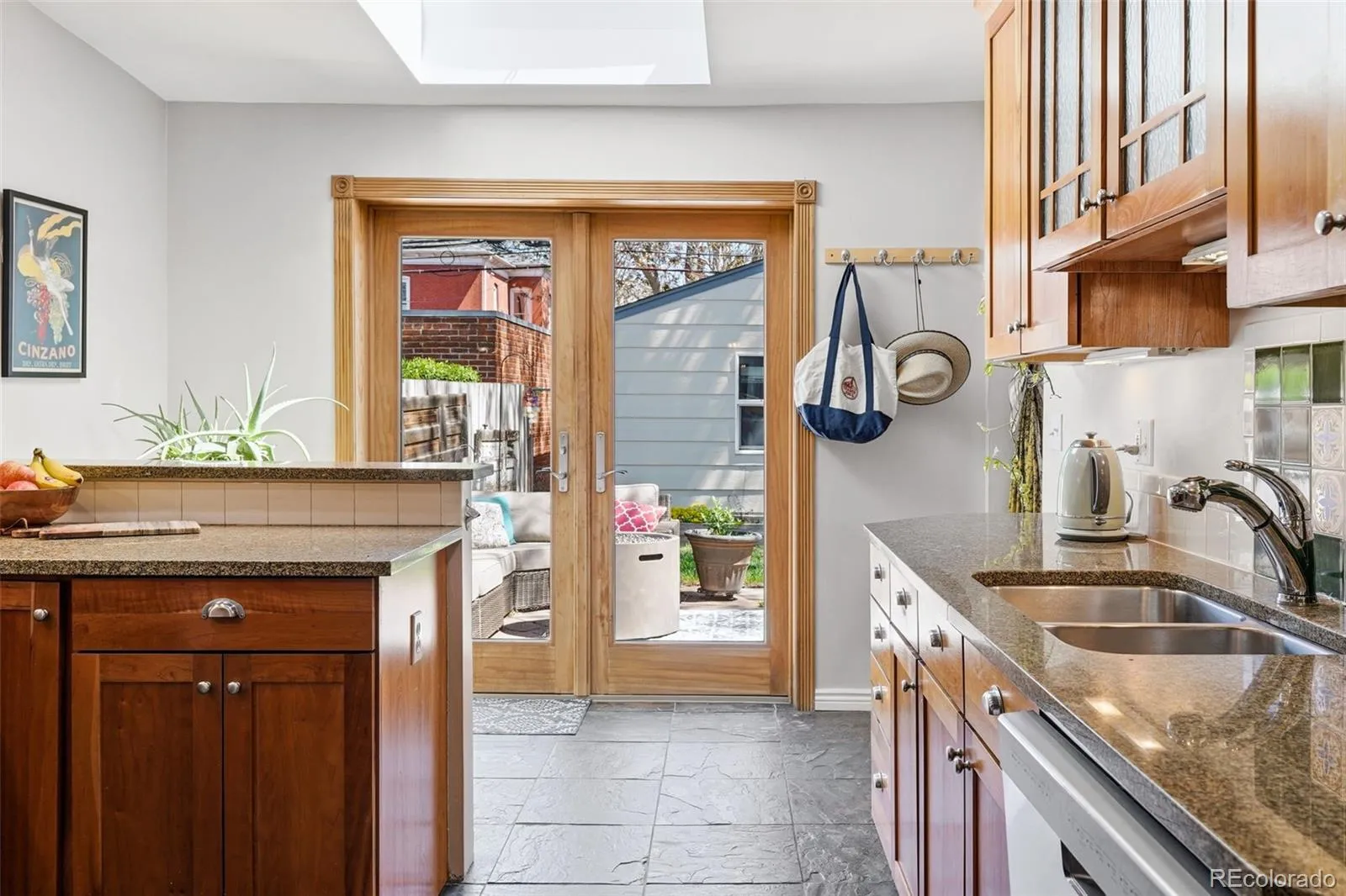 The gourmet kitchen features stainless steel appliances, cherry cabinetry, granite surfaces, and a large skylight that fills the space with natural light. Sliding glass doors open seamlessly to the outdoor patio, extending your living space for gatherings or quiet evenings at home. Rich in original charm, the home showcases craftsman millwork, tall windows, original pocket doors, high ceilings, and a classic tile fireplace, complemented by a formal dining room perfect for hosting. The main-floor primary suite offers both privacy and convenience, complete with dual closets and a beautifully remodeled bath. A dedicated home office overlooks the peaceful backyard, while two separate living areas on the main level provide flexibility for relaxing or entertaining. Upstairs, three generously sized bedrooms feature abundant natural light from large windows and skylights, an upstairs fireplace, along with a remodeled five-piece bath and convenient second-floor laundry. An inviting covered front porch is ideal for morning coffee or evening unwinding. A rare oversized two-car garage with ample storage sits adjacent an art studio or potting area. Upgrades include a newer impact resistant roof (2023), gutter and downspout upgrades (2023) newer water heater (2024) and a new water service line (2024). Ideally located, enjoy easy access to City Park, East High School, Carla Madison Recreation Center, Denver Botanic Gardens, as well as local coffee shops and restaurants. Just minutes from Sprouts Farmers Market, Cherry Creek Shopping Center, and downtown Denver.