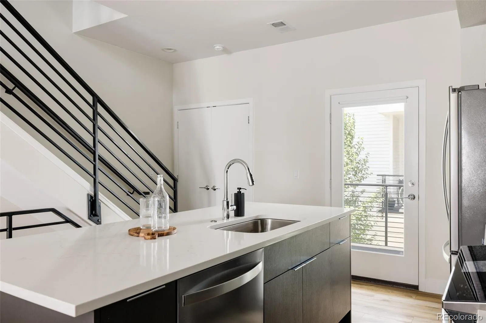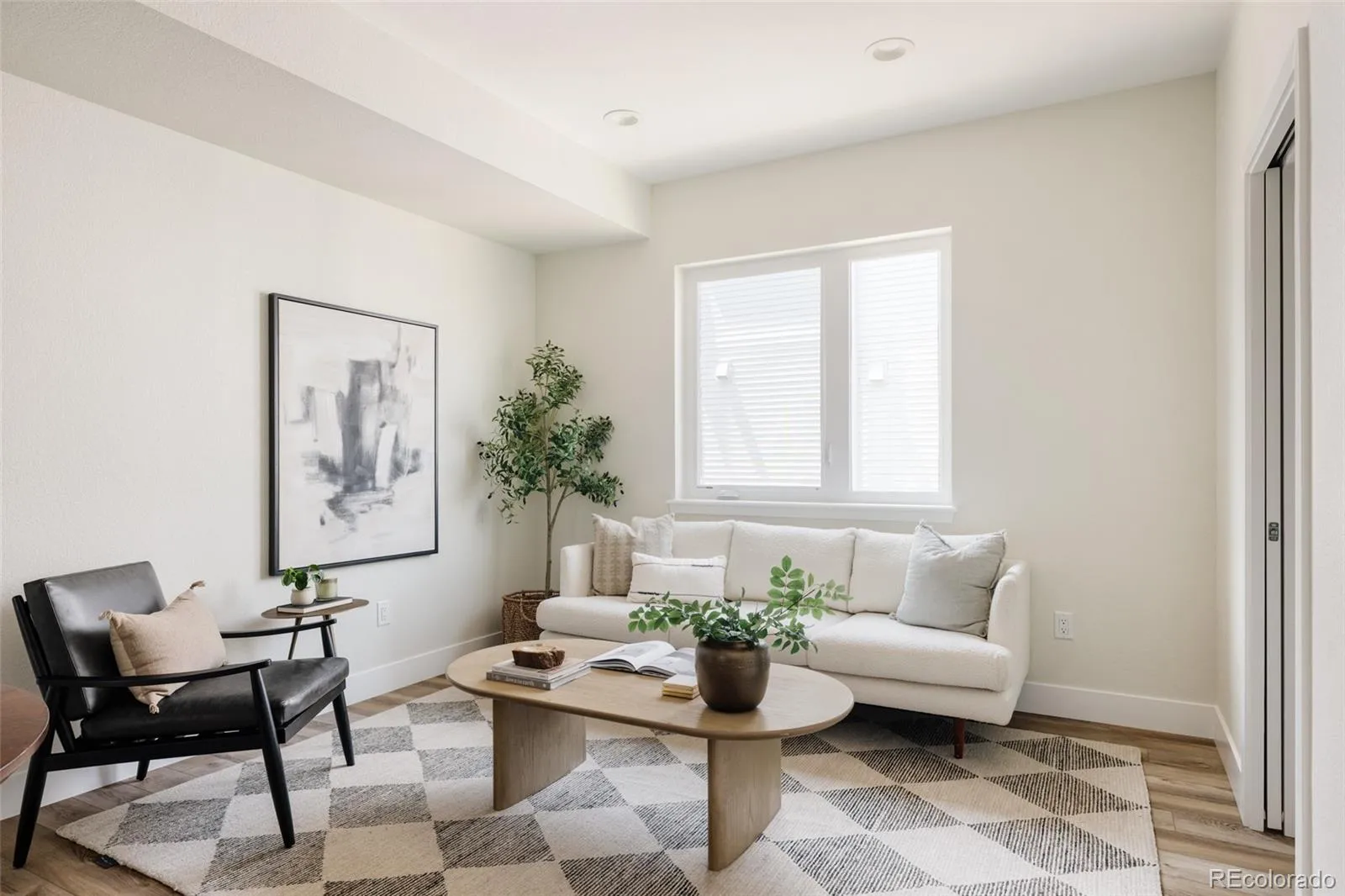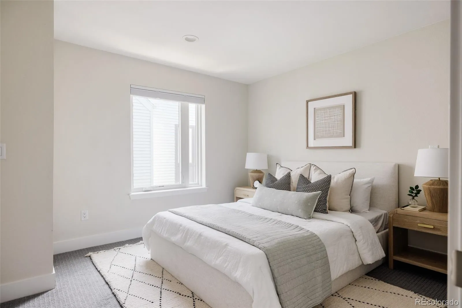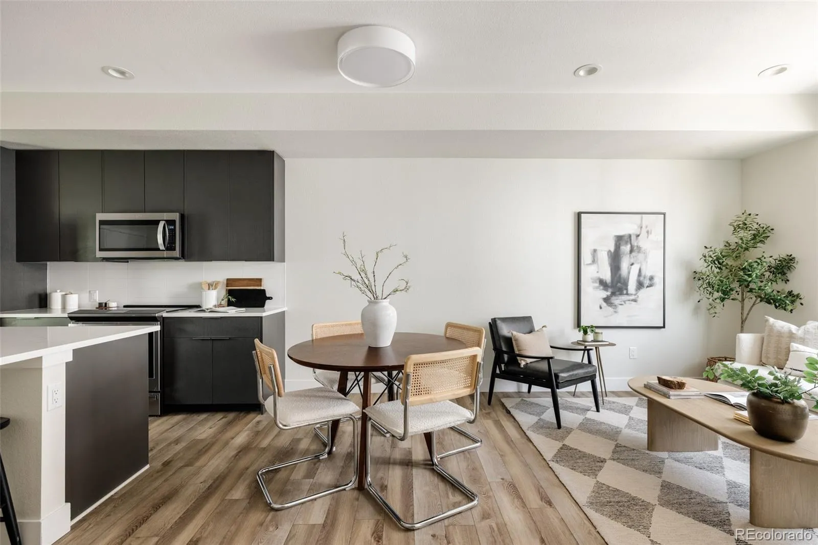 Welcome to Parkview Residences—a quiet, contemporary townhome community offering energy-efficient living, thoughtful design, and an unbeatable Lakewood location. Built in 2022, this 3-level, 2-bedroom, 2.5-bath home blends modern style with smart upgrades and sustainability. The second level features a bright, open floorplan that connects the kitchen, dining, and living areas. The kitchen boasts espresso cabinetry, quartz counters, a white tile backsplash, and upgraded stainless steel appliances—including a sleek induction cooktop and stove. Designer lighting and clean lines make the space feel elevated and inviting, while large windows and a private balcony bring in abundant natural light. A convenient powder room is also located on this level for guests. Upstairs are two spacious bedrooms, each with its own en-suite bathroom and large closet. Window coverings are installed in the bedrooms for privacy, and the upgraded Miele washer and dryer are located on the same level for easy laundry access. Additional smart and energy-efficient features include a newer heat pump water heater, smart thermostat, smart deadbolt, and a 240V outlet in the garage—perfect for EV charging. Enjoy indoor-outdoor connectivity, a peaceful off-street setting, and access to a community garden. The HOA covers roof maintenance, snow removal, landscaping, and recycling for true low-maintenance living. Location is everything—and this one is exceptional. You’re just steps from a park and rec center and extremely close to Belmar’s shopping, dining, entertainment, and grocery options. With quick access to Light Rail, 6th Ave, Red Rocks, and downtown Denver, this move-in ready townhome offers the perfect balance of comfort, efficiency, and convenience.