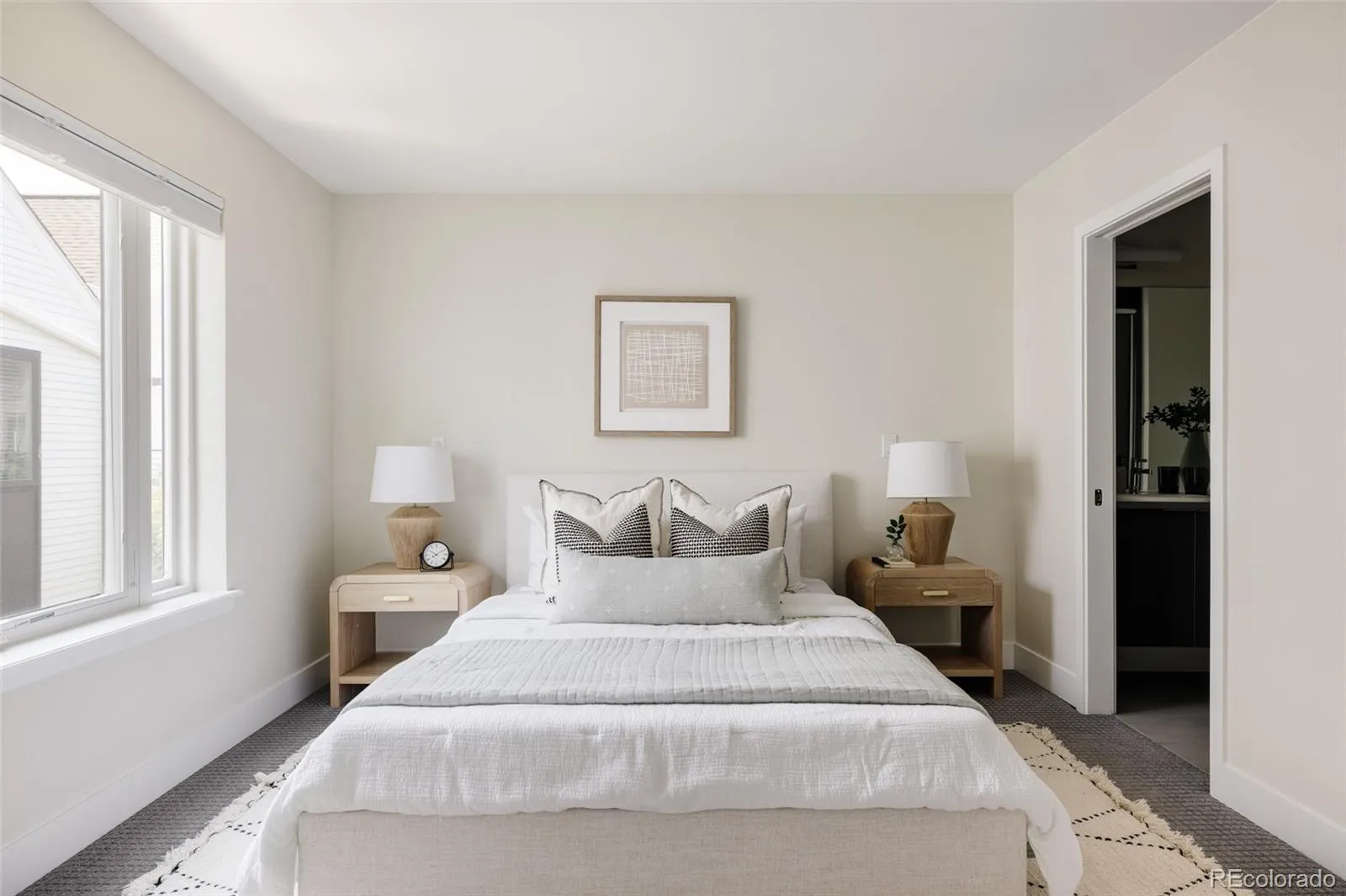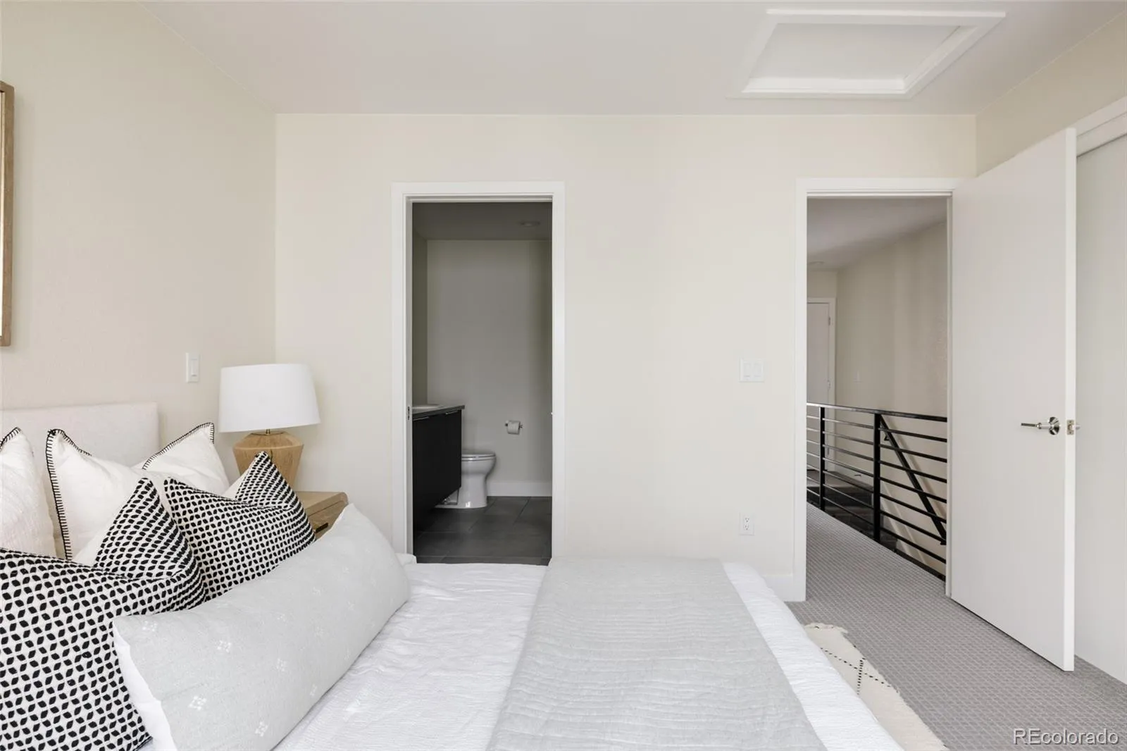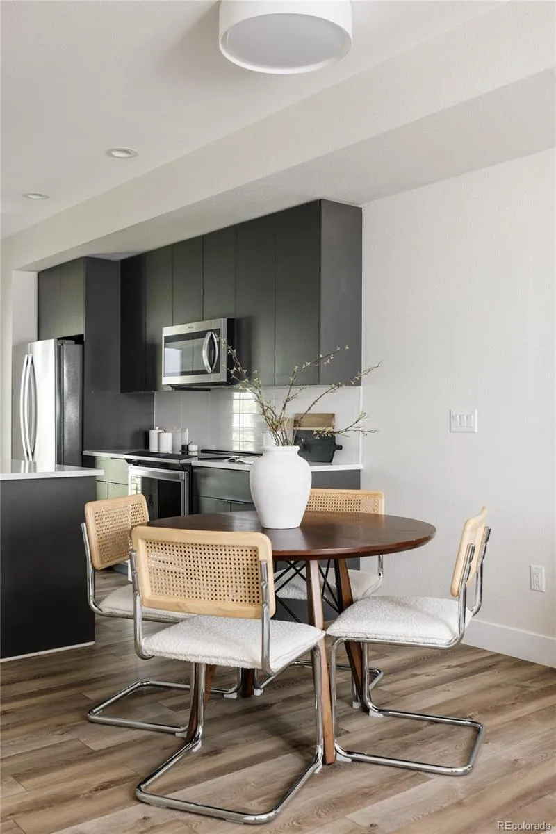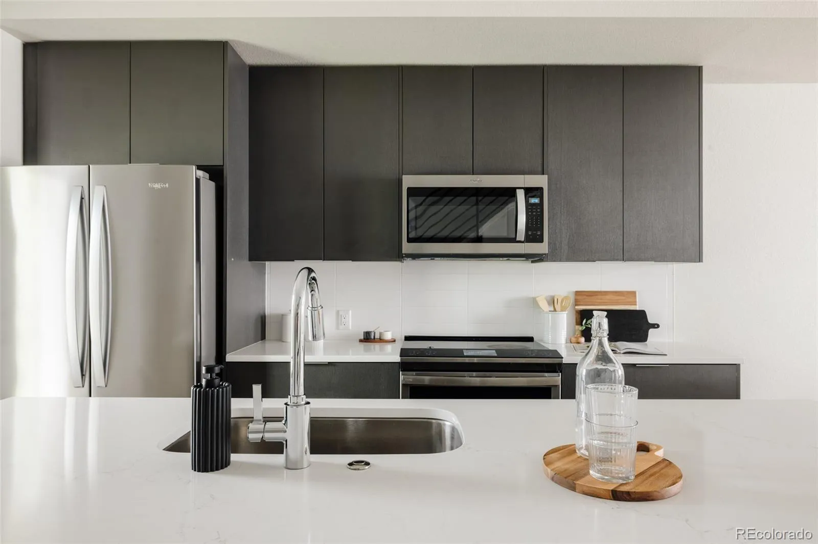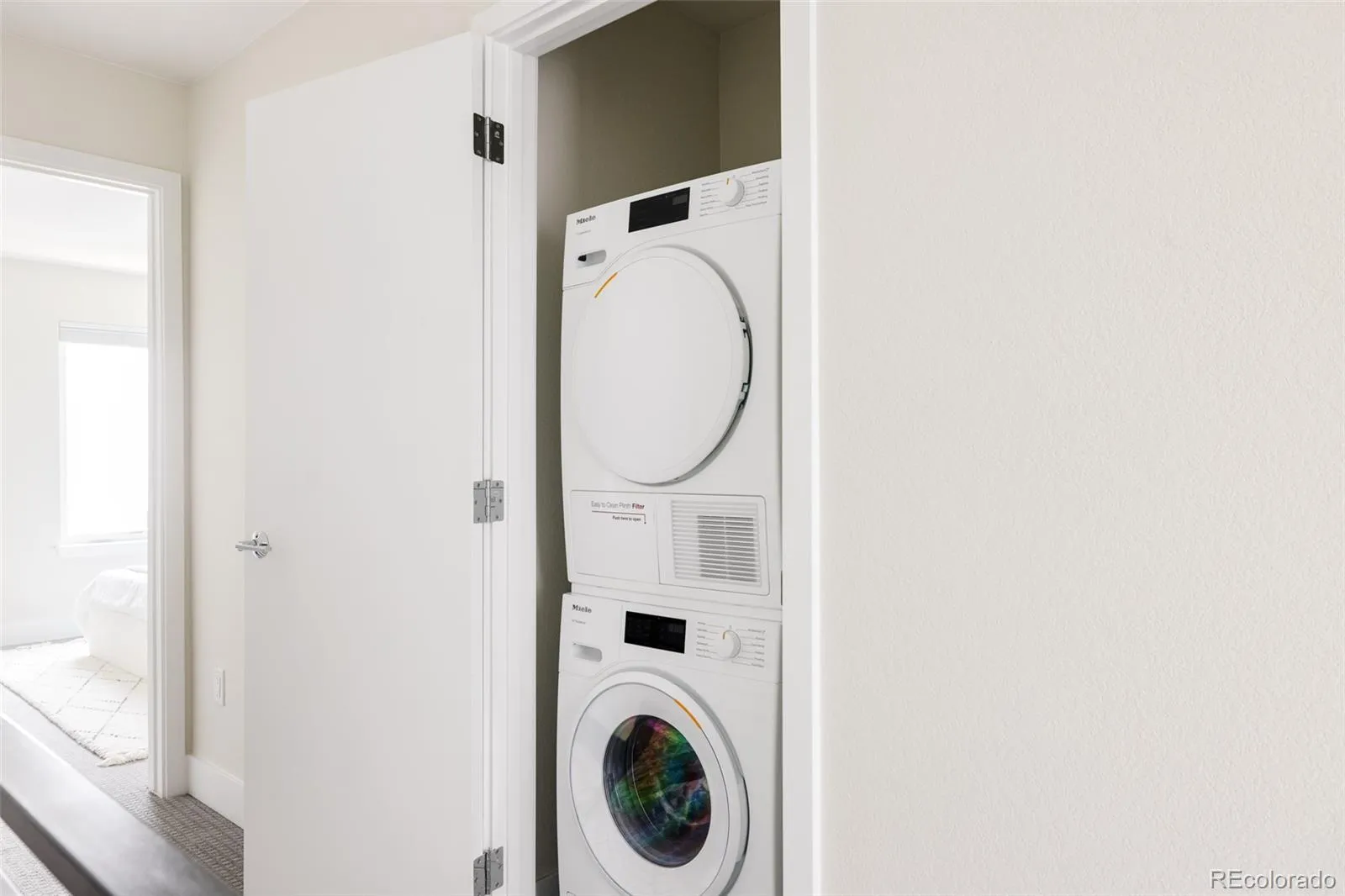 Welcome to Parkview Residences—a quiet, contemporary townhome community offering energy-efficient living, thoughtful design, and an unbeatable Lakewood location. Built in 2022, this 3-level, 2-bedroom, 2.5-bath home blends modern style with smart upgrades and sustainability. The second level features a bright, open floorplan that connects the kitchen, dining, and living areas. The kitchen boasts espresso cabinetry, quartz counters, a white tile backsplash, and upgraded stainless steel appliances—including a sleek induction cooktop and stove. Designer lighting and clean lines make the space feel elevated and inviting, while large windows and a private balcony bring in abundant natural light. A convenient powder room is also located on this level for guests. Upstairs are two spacious bedrooms, each with its own en-suite bathroom and large closet. Window coverings are installed in the bedrooms for privacy, and the upgraded Miele washer and dryer are located on the same level for easy laundry access. Additional smart and energy-efficient features include a newer heat pump water heater, smart thermostat, smart deadbolt, and a 240V outlet in the garage—perfect for EV charging. Enjoy indoor-outdoor connectivity, a peaceful off-street setting, and access to a community garden. The HOA covers roof maintenance, snow removal, landscaping, and recycling for true low-maintenance living. Location is everything—and this one is exceptional. You’re just steps from a park and rec center and extremely close to Belmar’s shopping, dining, entertainment, and grocery options. With quick access to Light Rail, 6th Ave, Red Rocks, and downtown Denver, this move-in ready townhome offers the perfect balance of comfort, efficiency, and convenience.