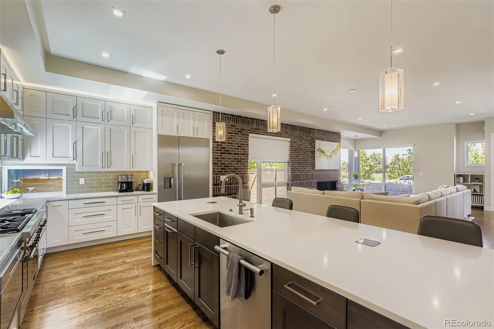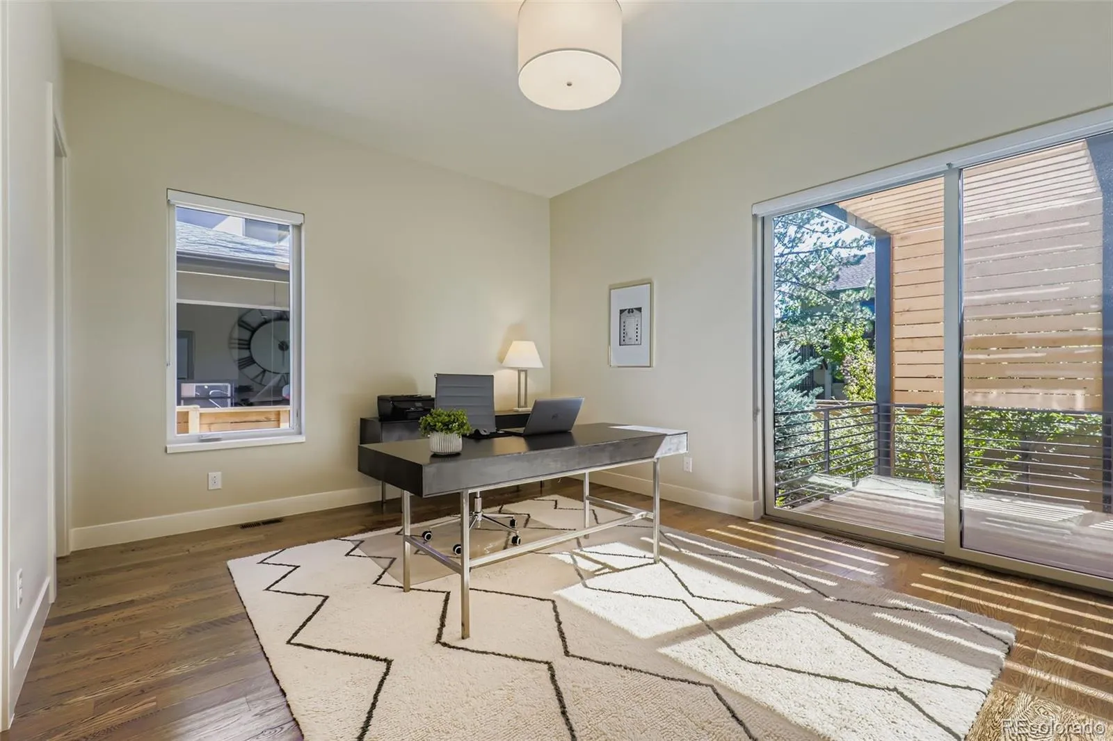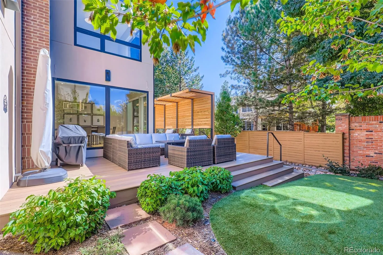 Exceptional opportunity to own an exquisite modern residence overlooking the park in the coveted Boulevard One community! This architecturally striking home features a thoughtfully designed open-concept main level with expansive living, dining, and kitchen spaces, ideal for both everyday living and elegant entertaining. A sun-filled dining room opens through walls of glass to generous rear decks for seamless indoor-outdoor enjoyment. A private study or bedroom with deck access and an adjacent bath, plus a well-appointed mudroom complete the main level. Gorgeous oak flooring and floating-tread stairs, and extensive designer finishes and glass elevate the home throughout. The upper level is anchored by a luxurious primary suite with direct access to a covered veranda offering a ceiling fan, A/V connections, and a gas fireplace with an auto screen and multi-colored lighting effects. The spa-inspired primary bath features heated floors, a steam shower and a vessel soaking tub. 3 additional bedrooms provide a jack-n-jill bath and a private ensuite, with oak flooring extending through the primary suite, halls, and fantastic loft/lounge area. The finished basement offers additional living space, an extra bedroom and bath, and ample storage. Designed for efficiency and modern living, the home boasts a HERS 40 rating, dual high-efficiency furnaces, central A/C, owned solar panels, and Andersen 100 series energy-efficient windows. Smart-home pre-wiring, fiber-optic connectivity, extensive audio wiring, and premium LED lighting enhance convenience and ambiance. Outdoors, enjoy fully landscaped grounds in addition to a pergola, sprinkler system, and lifelike, low-maintenance turf. Offering extraordinary value as a luxury alternative to Hilltop, Wash Park, and Cory-Merrill, this remarkable residence delivers exquisite modern elegance, unparalleled energy efficiency, and exceptional livability in one of Denver’s most desirable park-side settings!