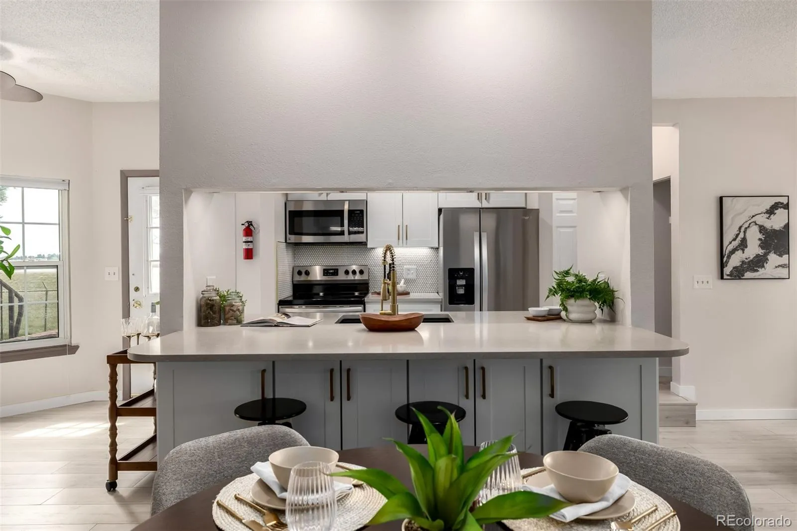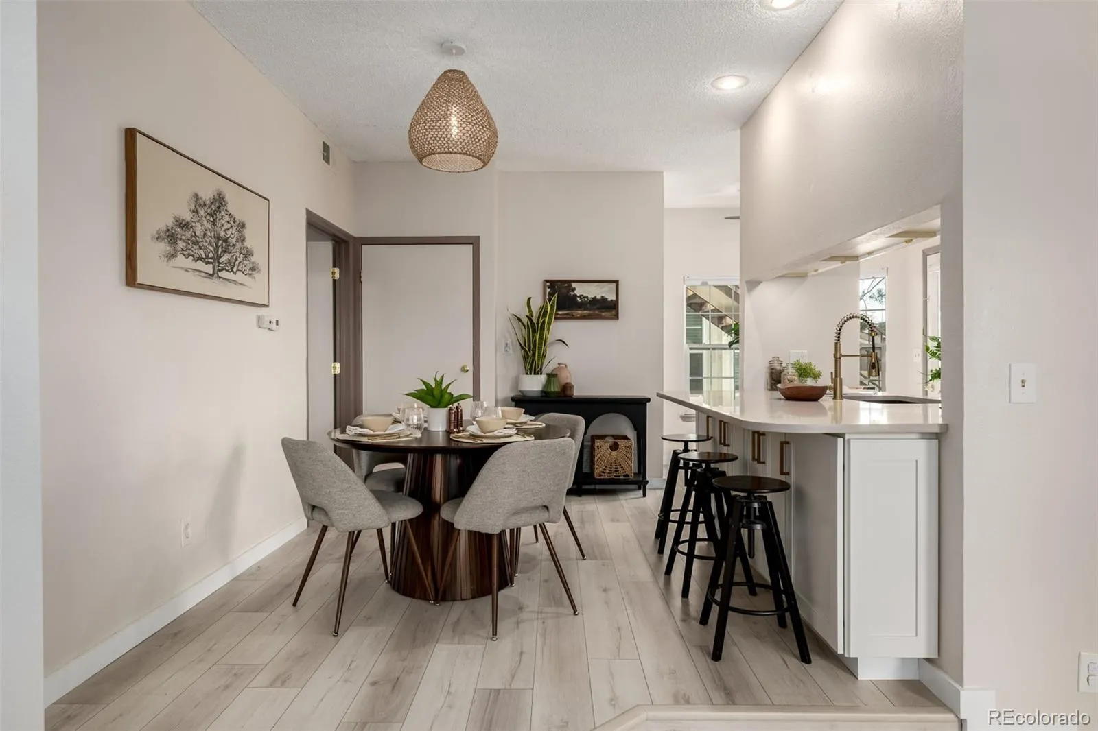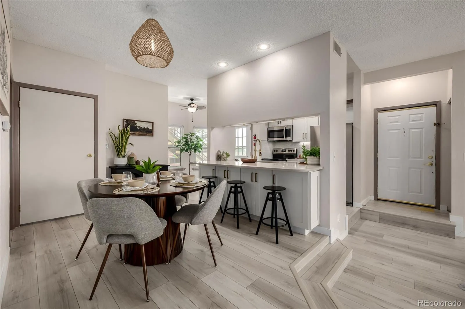 A gentle elevation change leads to the dining area, where a contemporary statement light fixture defines the space. The adjacent kitchen is arranged with clarity and connection in mind. An iconic pass-through breakfast bar invites conversation and casual dining, while the galley layout is executed with elegant precision. White shaker cabinetry, quartz countertops, and a thoughtfully selected backsplash create a cohesive, timeless look.