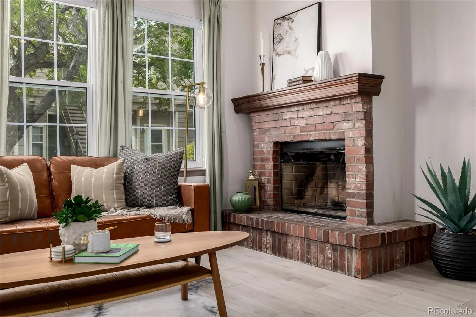 Inside, the main living space is both grounded and luminous. A classic brick-faced fireplace anchors the room with architectural presence, while wide-plank flooring introduces a refined, modern layer. Oversized windows draw in natural light, creating an atmosphere that feels open and composed.