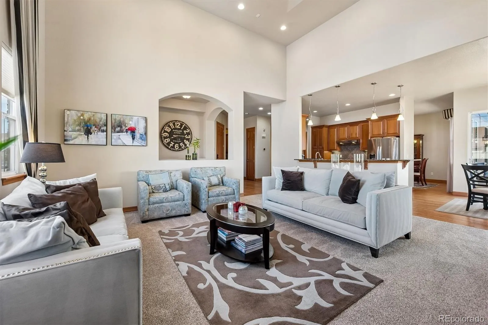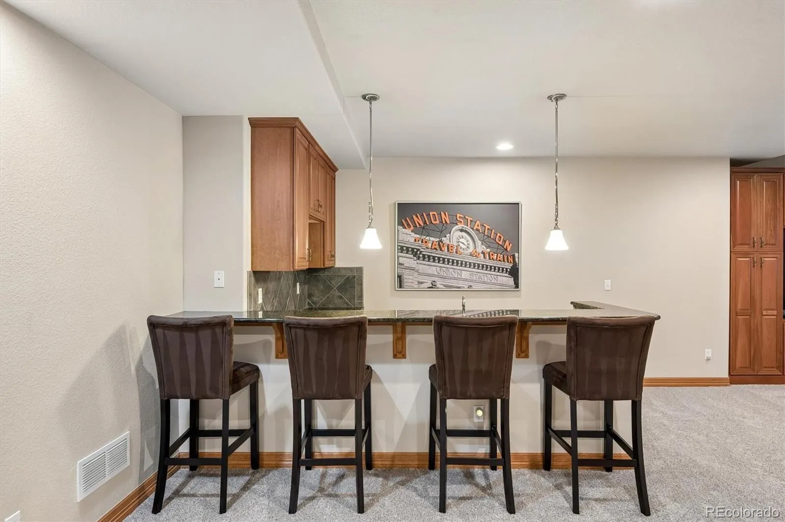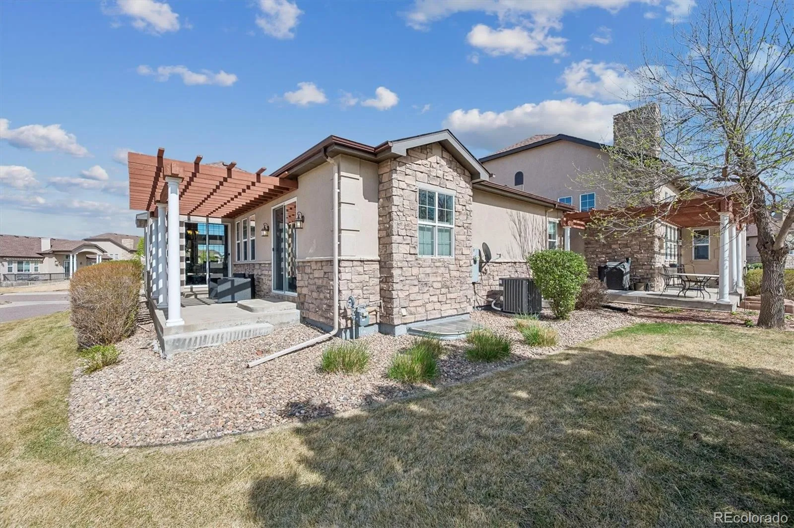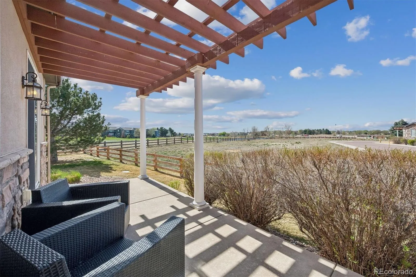 Welcome home to incredible sunset and mountain views from this zero-maintenance patio home situated on a premium lot backing to Buffalo Run golf course in the gated community of The Fairways at Buffalo Run. This former model ranch home offers an expansive open floor plan with stunning hardwood floors, new carpet (2025), and abundant natural light. The high ceilings and fresh paint seamlessly tie together the main living spaces. Enjoy preparing a meal in the well-appointed kitchen featuring granite counters, cherry cabinetry, an island with barstool seating, and a built-in pantry with pull-out drawers. Enjoy cozying up by the fireplace on cool Colorado evenings, hosting dinner parties in the formal dining room, or stepping outside to the large patio. Sip your morning coffee under the pergola while taking in the striking views. The main floor primary suite includes access to the patio, a sizeable walk-in closet, and a 5-piece ensuite bath. Descend to the finished lower level for additional living and entertaining space. A spacious family room with a custom wet bar is perfect for movie nights or watching the big game. Two generously sized secondary bedrooms, a full bath, and a custom wine cellar round out the lower level. Additional features of this turnkey residence include a new roof (2022), new HVAC & water heater (2023), and an attached 2-car finished garage. The gated community of The Fairways is ideally located near dining, shopping, major roadways, and easy access to Buffalo Run golf course.