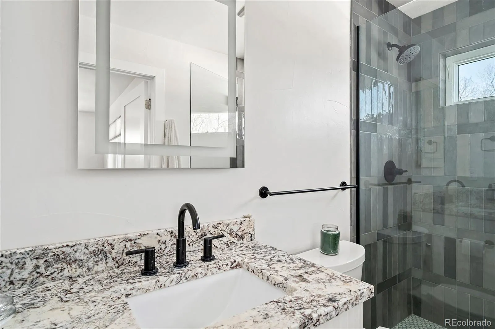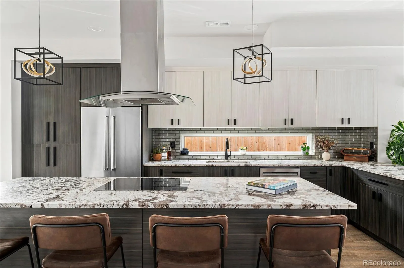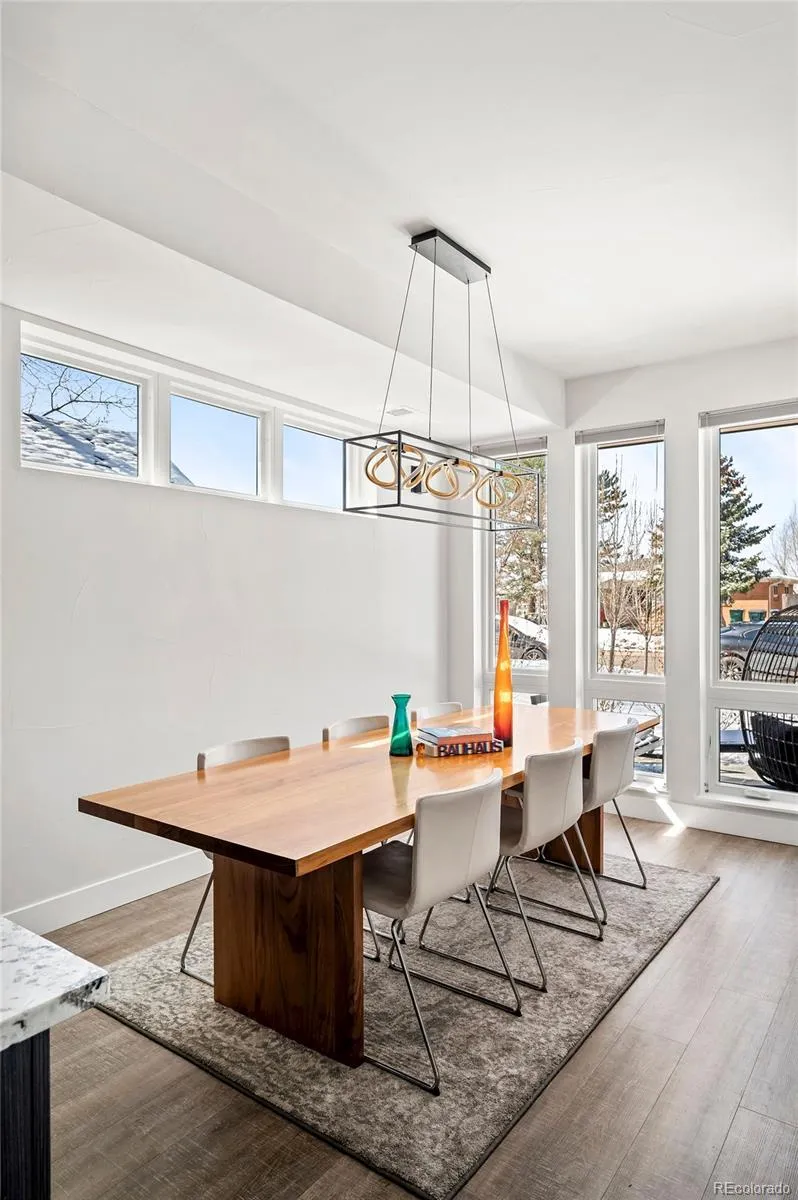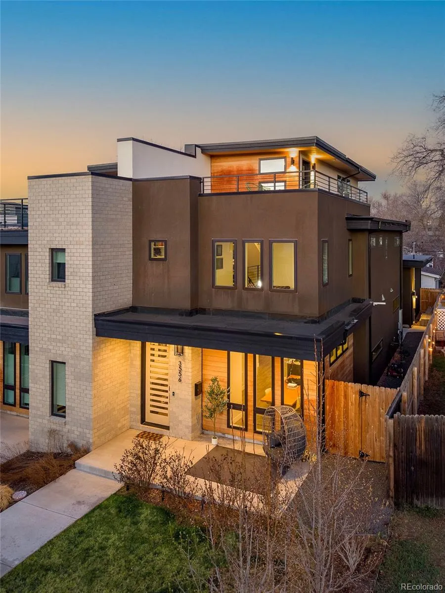 This modern duplex sits on an oversized lot and offers spectacular mountain views from the spacious third-floor rooftop deck. With 3 bedrooms and 3.5 bathrooms, the home blends luxury finishes with energy-efficient design. The main level features tall ceilings with wide-plank flooring, an open dining room, a grand chef’s kitchen with stone island and custom cabinetry, and a bright living room with gas fireplace. Upstairs, the primary suite impresses with west-facing windows for more mountain views, a walk-in closet, and a spa-inspired bath with soaking tub, oversized shower, and floor-to-ceiling tile. The third floor provides a private retreat with loft space ideal for an office or gym, or a guest suite with full bath, and access to the expansive rooftop deck—complete with a private viewing deck for sunsets and mountain vistas from Pikes Peak to the flatirons of Boulder. . Additional highlights include a detached two-car garage with overhead storage loft, paved driveway, and a mature tree canopy that provides seasonal shade. Energy efficient features include Anderson windows, advanced insulation, HE-HVAC, smart thermostats, a high-efficiency hot water heater, and a Jenn-Air induction cooktop, ensuring comfort and energy savings year-round.