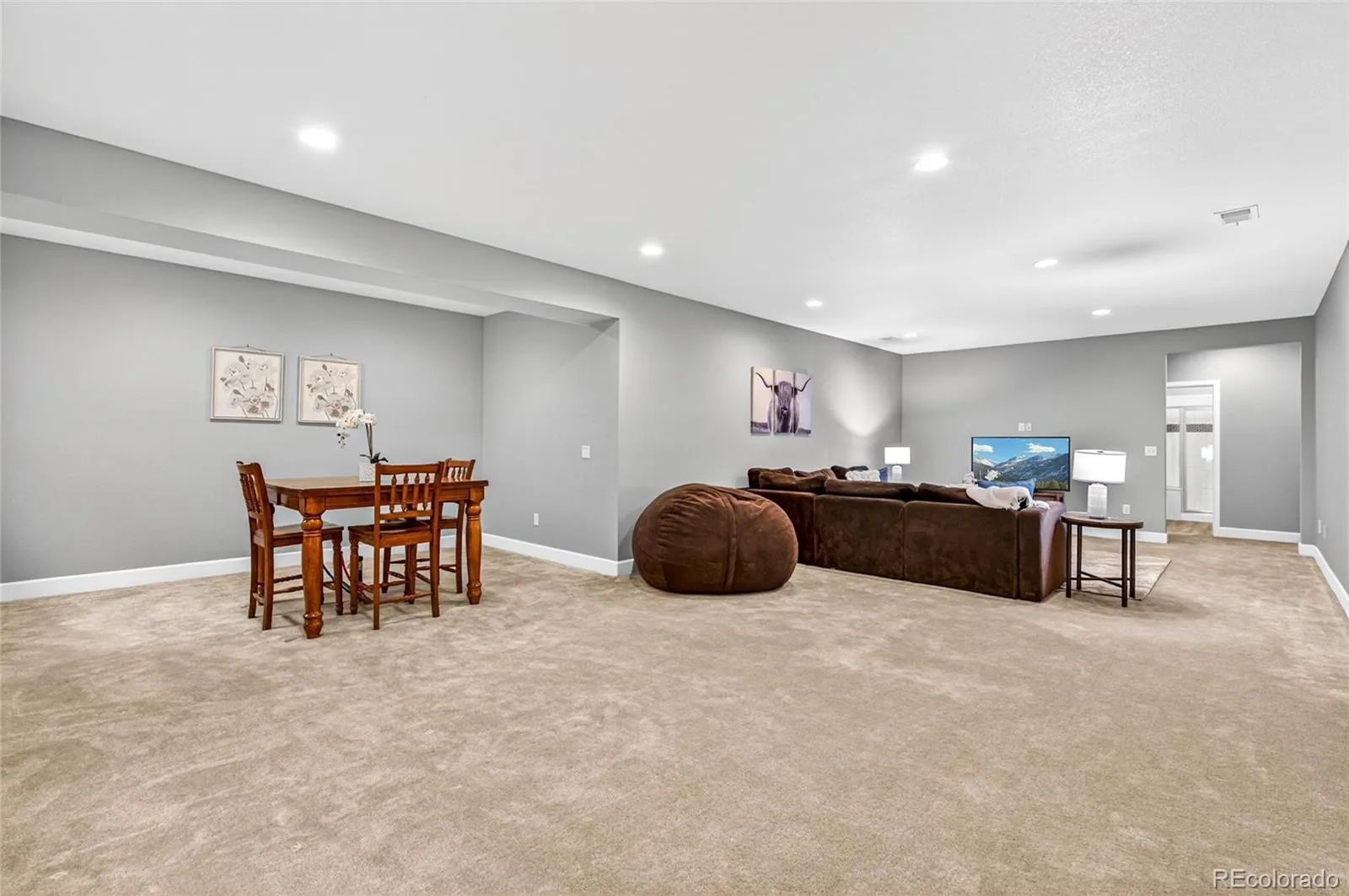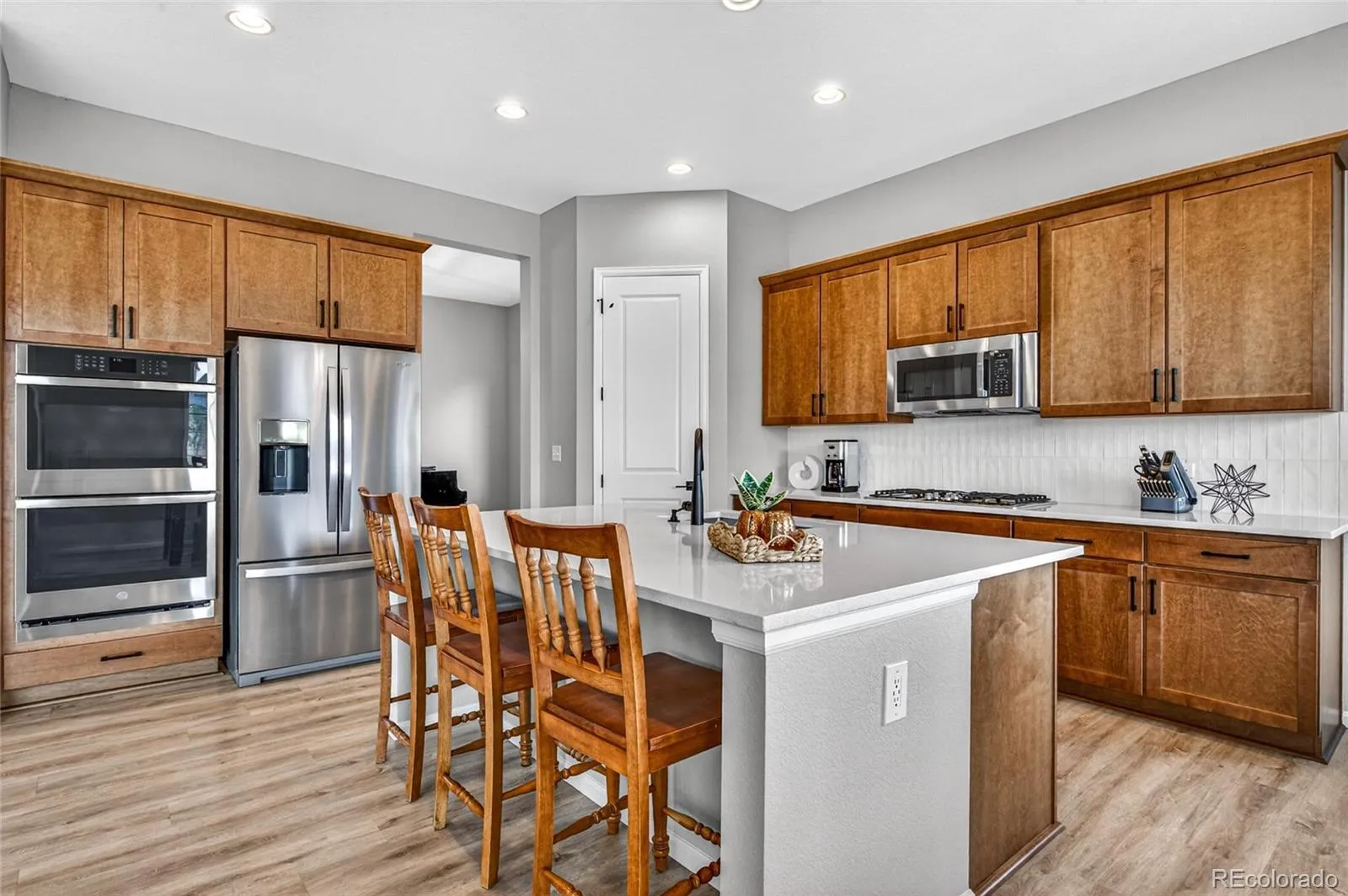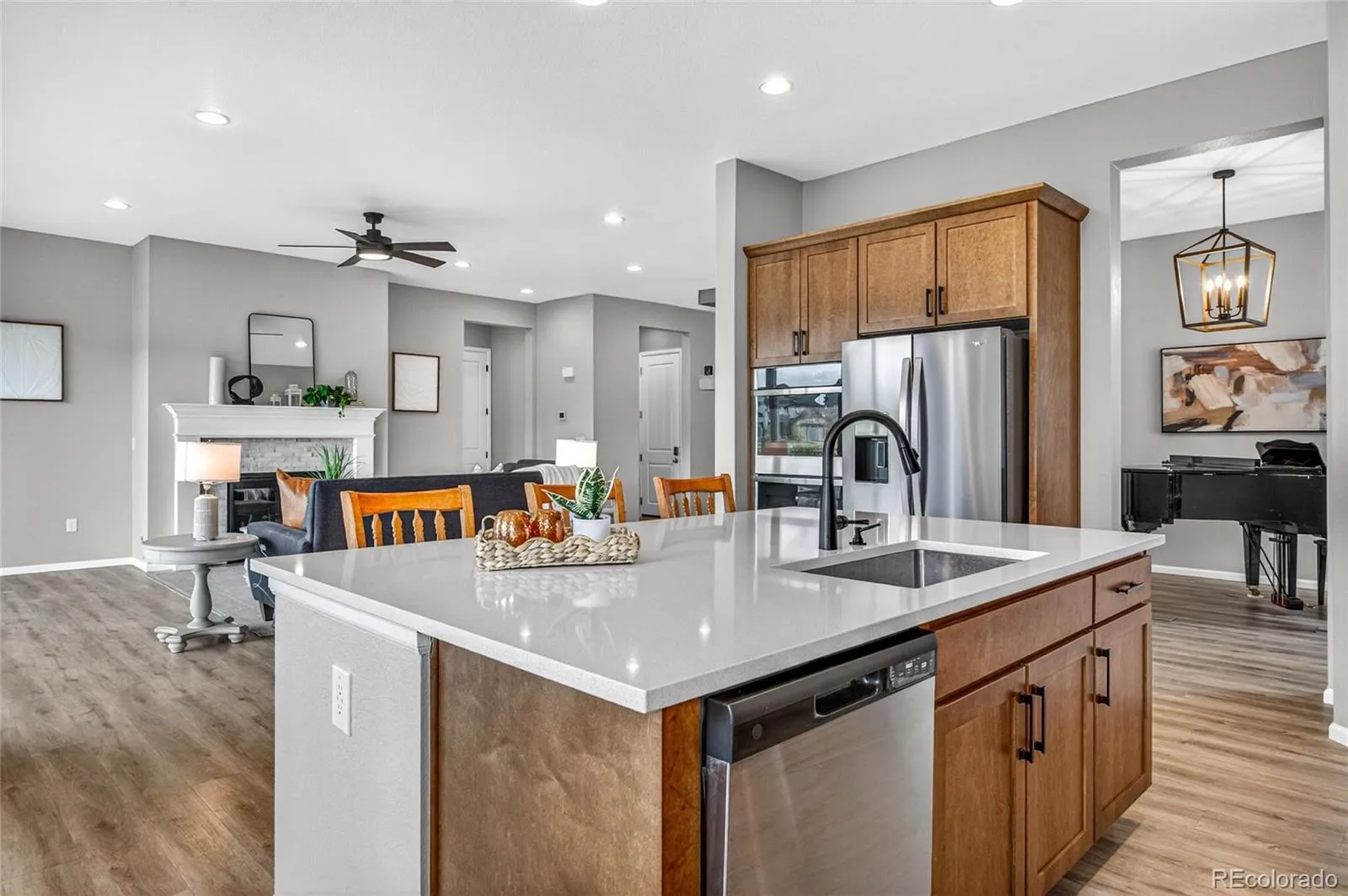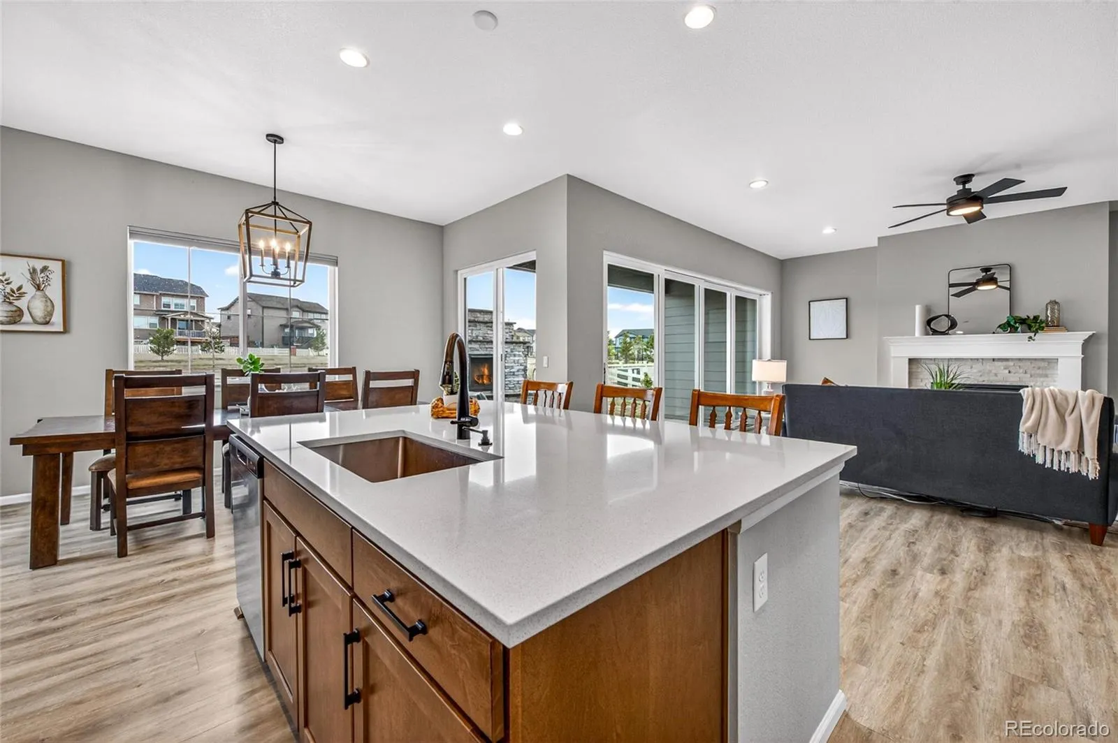 Discover your dream home in the highly sought-after Southshore neighborhood in Aurora, Colorado. This stunning home boasts 4 bedrooms, 3.5 bathrooms, a generous 4,772 square feet of luxurious living space, 3 car garage, finished basement, durable LVP flooring on the main floor, and does not back to another neighbor. As you step inside, you are greeted by a 3-pane slider door that leads to a beautifully designed outdoor area. This space features a custom fireplace, spacious patio, and fully fenced and irrigated yard. This is perfect for entertaining or simply unwinding in the fresh Colorado air. The heart of the home is the gourmet kitchen equipped with a double oven, quartz countertops, stainless steel appliances and gas cooktop, and a walk-in pantry. This culinary haven flows effortlessly into the adjoining dining and living areas, where a cozy gas fireplace creates an inviting atmosphere. The primary suite offers a serene retreat, complete with a 4-piece ensuite bath that features a luxury shower, custom tile work, and sizeable walk-in closet with built-ins, providing both space and organization. Additional highlights include a finished basement showcasing 2 bedrooms with walk-in closets, a ¾ bath with granite counters, and the perfect space for entertainment or extra living space. (PS: There’s a connect for the wet bar, drain and electrical under the bar top table in the basement rec room.) Plus enjoy phenomenal neighborhood amenities including 2 pools, 2 clubhouses, a paddleboat lake, access to the reservoir, miles of trails, parks playgrounds and so much more! This home is centrally located w/easy access to I-70, E-470, & is 30 minutes from Denver or & 30 minutes from DIA. This exceptional home combines modern amenities with thoughtful design in a prime location. Don’t miss your chance to make this stunning property your own! Schedule a showing today and experience the luxurious lifestyle that Southshore has to offer.