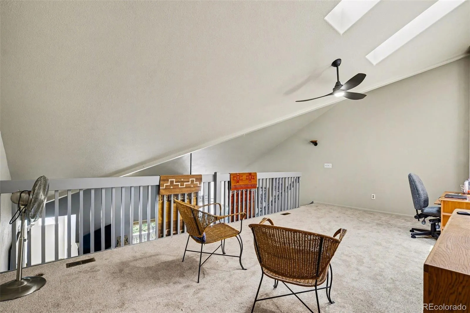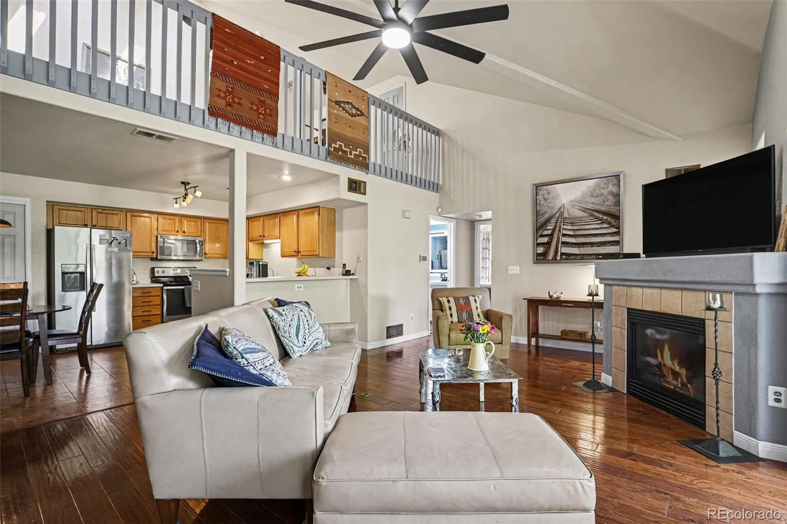 This well-maintained condominium offers a comfortable and functional layout with two spacious bedrooms and two updated bathrooms. Both bedrooms feature vaulted ceilings, creating an open and airy feel, with one bedroom offering a private, updated three-quarter ensuite bath. The kitchen provides a generous eating space and is equipped with a smooth top stove, microwave, refrigerator, dishwasher, and a large pantry for added storage. All appliances are included, including the washer and dryer, making this home truly move-in ready. The kitchen flows seamlessly into the inviting family room, complete with a cozy gas fireplace and direct access to a private balcony—perfect for relaxing or enjoying your morning coffee. An upper-level loft adds valuable flexibility, featuring a ceiling fan and a large storage closet. This versatile space is ideal for a home office, reading nook, or additional living area. Centrally located with convenient access to I-25 and the Boulder Turnpike, this home is surrounded by abundant shopping, dining, and outdoor recreation opportunities, including nearby walking and biking trails right out the front door. Call today for a private showing!