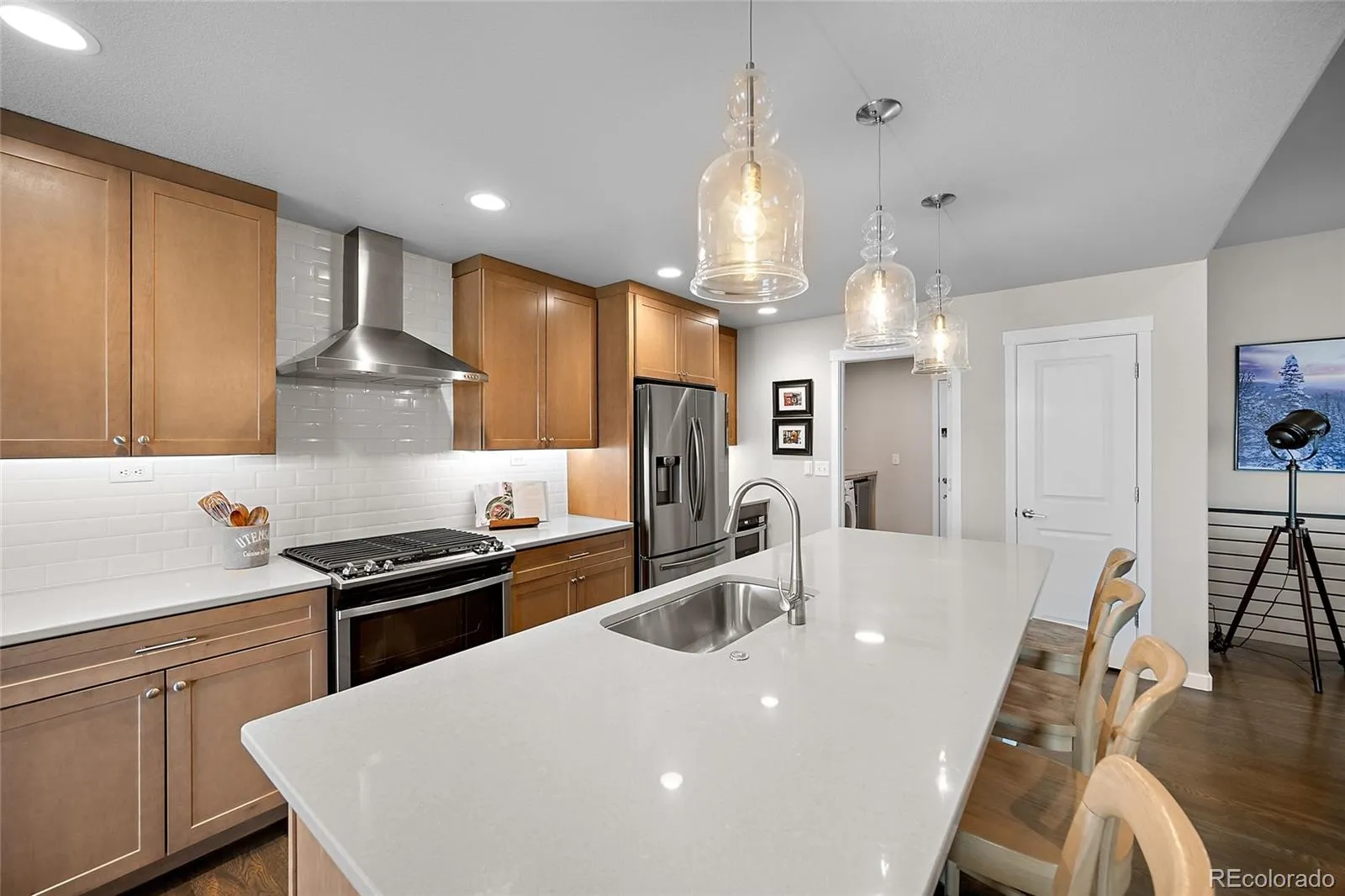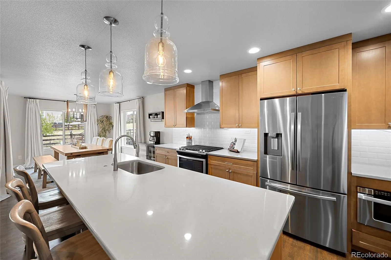 At the heart of the home, the great room impresses with 10-ft ceilings, a gas fireplace with custom tile surround and wood mantle, and a striking shiplap accent wall. The gourmet kitchen features quartz countertops, a large center island, stainless steel appliances, gas range, maple shaker cabinetry with upgraded hardware, built-in microwave, and a spacious pantry. The adjoining dining area is filled with natural light and highlighted by rich oak hardwood floors and a modern chandelier.