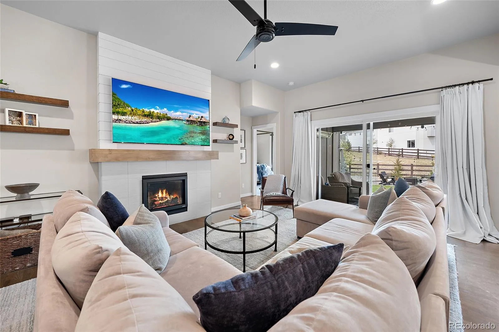 The vaulted primary suite offers a true retreat with a spa-inspired bath featuring quartz counters, an oversized glass-enclosed shower, linen closet, and a custom walk-in closet with built-ins. Oak hardwood flooring flows throughout the main level, while the enclosed patio with wind-resistant glass doors creates a perfect year-round living space.