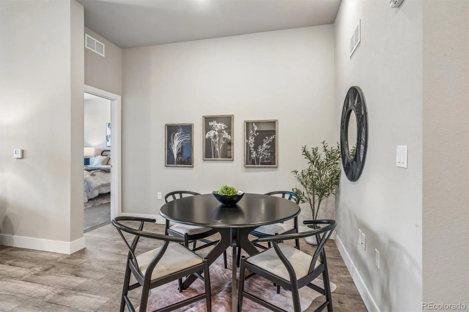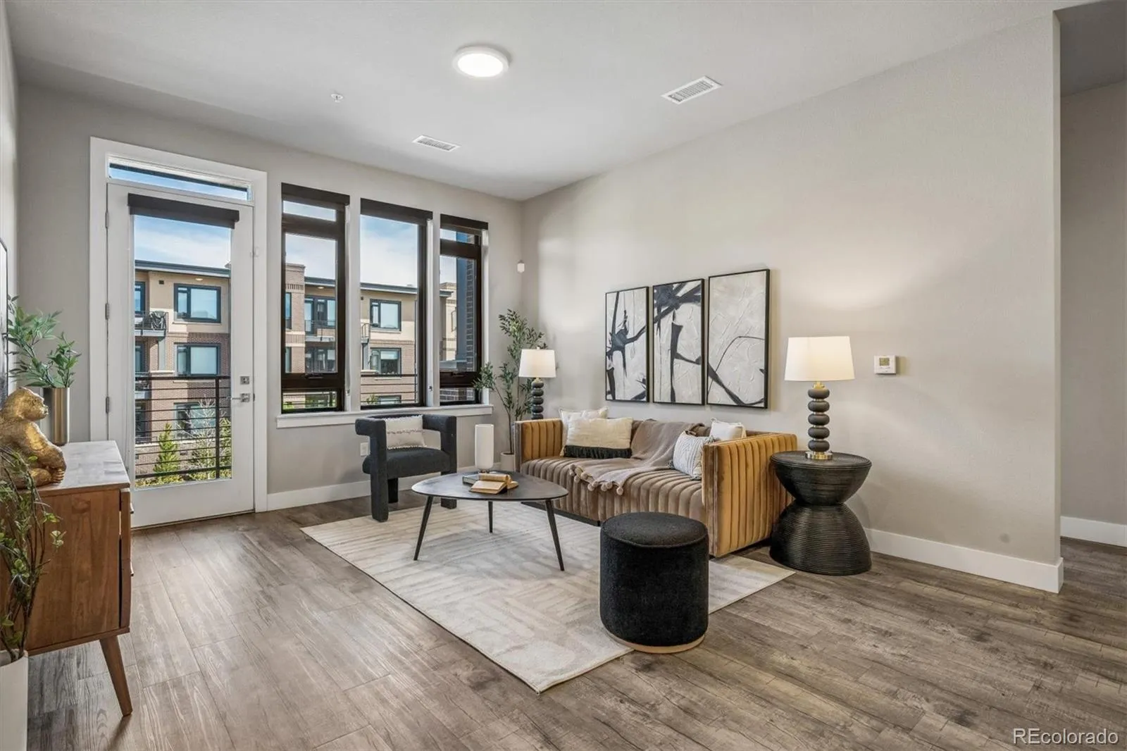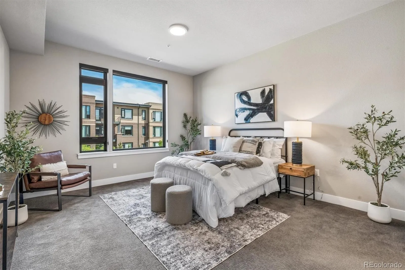 Welcome home to this gorgeous, open condo in the highly sought after Boulevard One neighborhood in Lowry. This beautiful 2 bedroom/2 bath second floor unit in the artsy Met South building is the perfect balance of luxurious and low-maintenance living. The spacious gourmet kitchen includes Bosch appliances, extensive Tharp cabinetry, induction cooktop, quartz counters, and large kitchen island with barstool seating–just perfect for entertaining! Ten-foot ceilings, large picture windows, and an open floor plan with LVT add to the loft-like feeling within. The living room opens to a covered balcony with views of Crestmoor Park and the mountains. The primary suite has a large, spa-like bathroom boasting a double sink vanity, zero entry shower, and large walk-in closet with built-ins. The 2nd bedroom (or office space) and full bath are situated on the other side of the unit offering guests privacy. Located just inside the entryway is a large laundry room that offers additional built-in storage as well as an in-unit washer and dryer. Situated in a secured building right next to Crestmoor Park and walkable to wonderful retail and restaurant amenities within the Boulevard One neighborhood and adjacent Lowry Town Center and Hangar 2 (including Clark’s market, Denver Beer Co, North County, Officer’s Club, Rocket Ice Cream, Lowry Beer Garden, and more), this unit will absolutely delight. Enjoy a lock and leave lifestyle that allows you to come and go as you please and no maintenance allows you more time to enjoy the things you love! Storage is not an issue with this unit. In addition to the extensive storage in the kitchen, walk-in closet, and laundry room, this unit has an exclusive use storage unit located just down the hall on the same floor. It also comes with 3 exclusive use parking spaces (very few units have more than 2 spaces) in a secured parking garage. The tandem space is handicap accessible and is located next to the elevator. The unit also meets ADA standards.