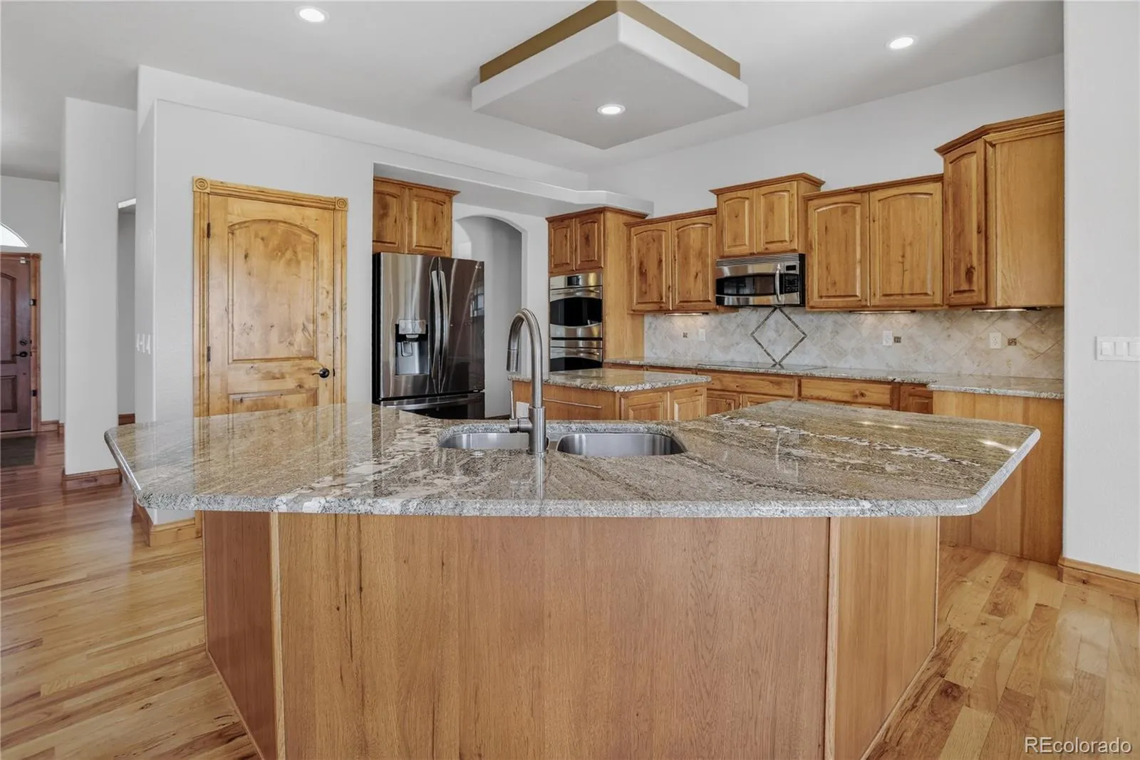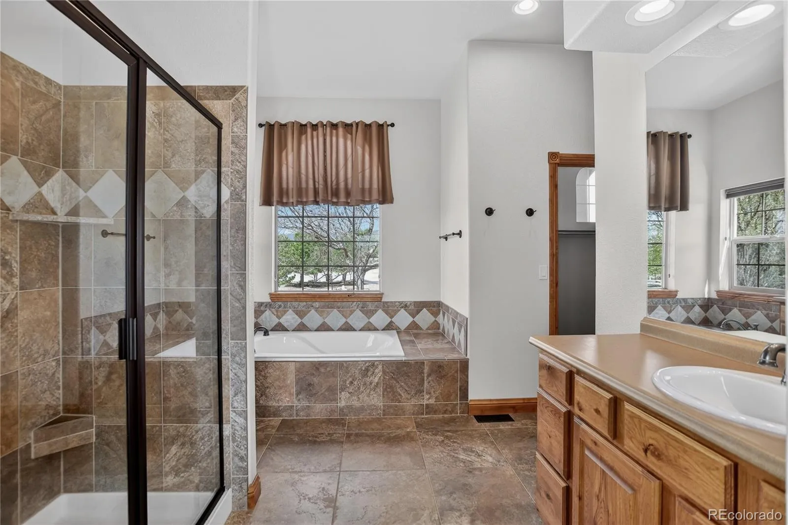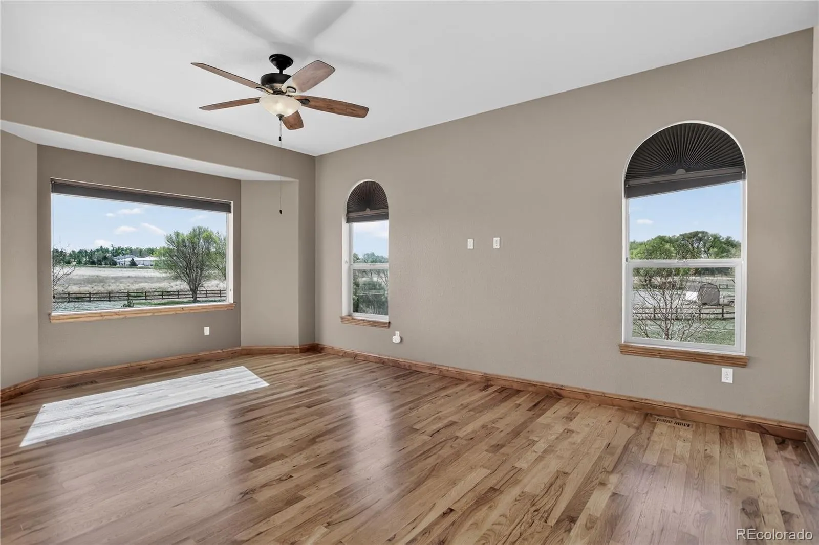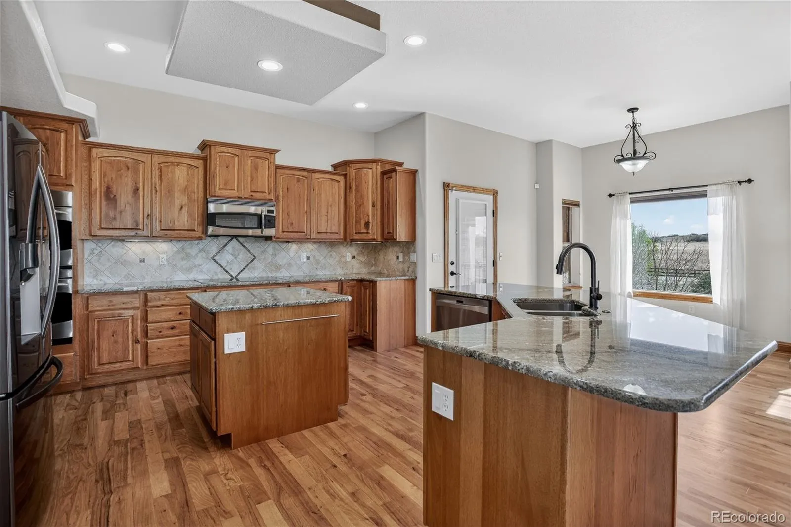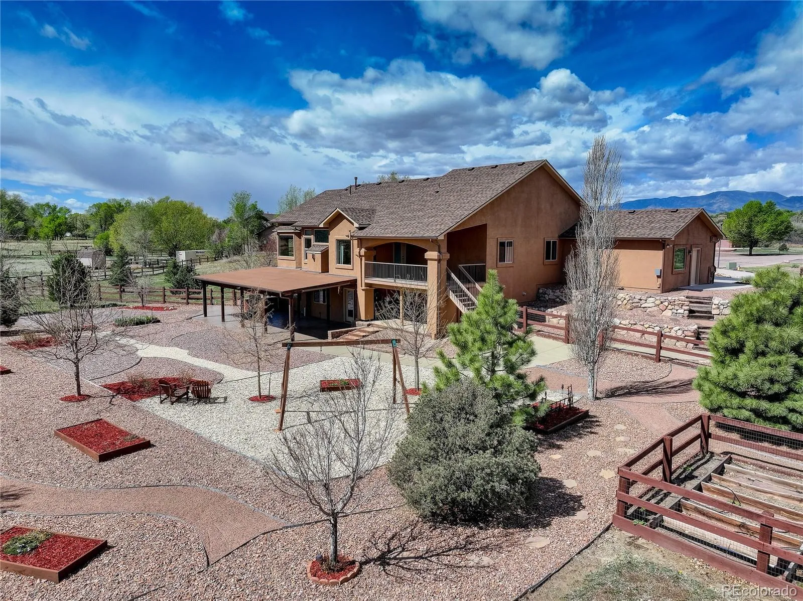 Refined craftsmanship and thoughtful upgrades define this Cumberland Greens residence, offering a warm and polished aesthetic with extensive custom details throughout. Stone entry accents create a striking first impression that opens to hickory hardwood flooring through most of the main level. Natural lighting illuminates the living room open concept and gas fireplace. The gourmet kitchen showcases hickory cabinetry, granite countertops, stainless steel appliances including double ovens, and a breakfast nook, designed for both everyday living and entertaining. Enjoy the comfort of the main-level primary suite offering a walk-in closet and 5-piece bath featuring separate vanities, a walk-in shower, and soaking tub. The main level is completed by a second bedroom, office, and convenient laundry. A full walk-out basement expands the living space with a large rec room with wet bar, a dedicated pool room and 3 additional bedrooms. Highlights for this property include 10’ ceilings on the main level & 9’ ceilings in the basement, iron rail stair detailing, & Hunter Douglas blinds throughout. Outdoor living is elevated with a covered 12×18 Trex deck, a covered stamped concrete patio with built-in grilling station, and a fully fenced rear yard. Exterior stucco and trim were freshly painted in 2025, and the asphalt driveway was just resealed. This peaceful property offers space and privacy, enhanced by Pikes Peak views with striking sunrises and sunsets.