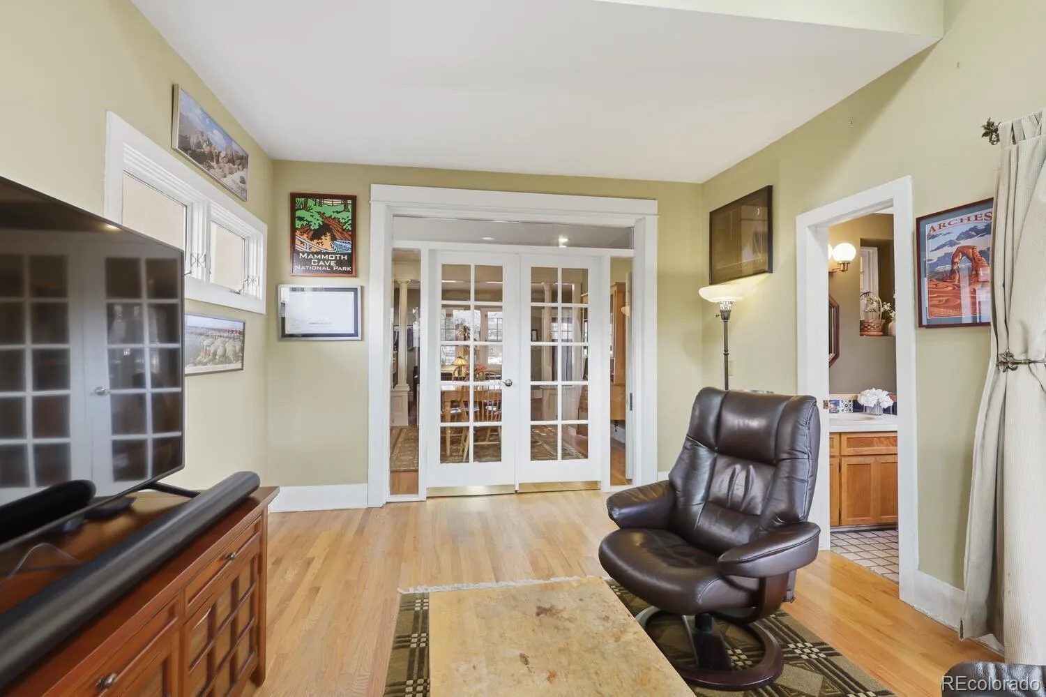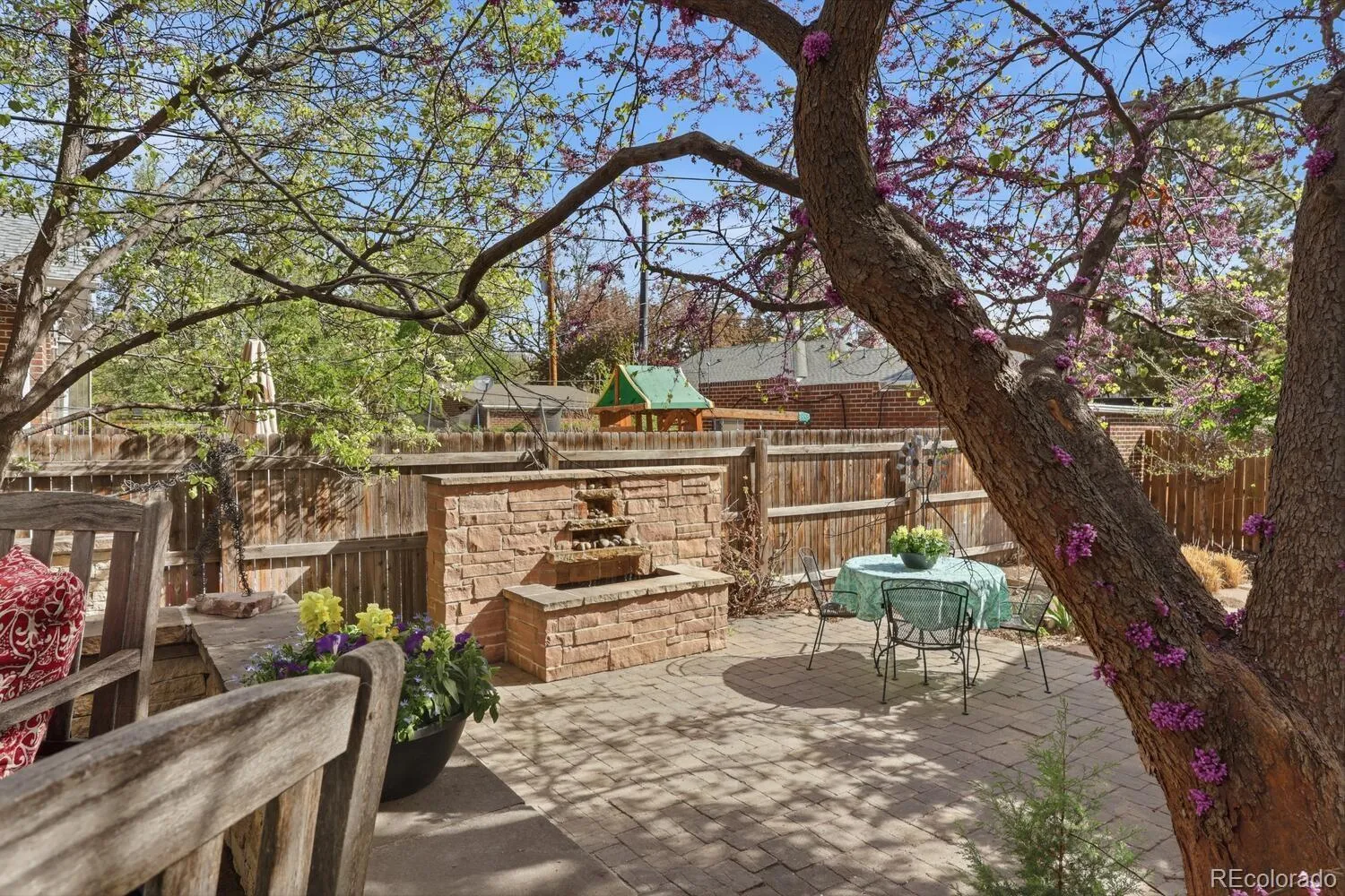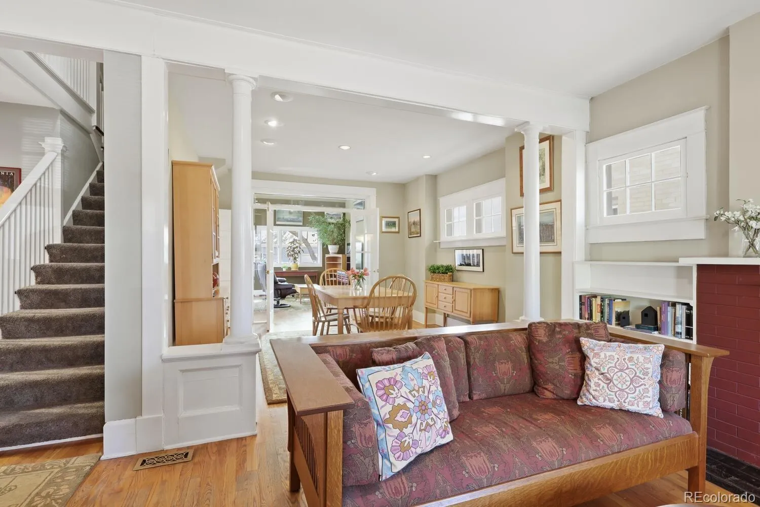 Charming Park Hill beauty! A generous front porch welcomes you to this classic lovingly cared for home. As you enter the home you are greeted with the charm and elegance of hardwood floors, high ceilings, columns, and a decorative living room fireplace. The main floor features French doors to an office or bedroom with exposed brick, a formal dining room, and French doors to a family room with vaulted ceilings and an attached powder room. The kitchen has been completely remodeled with classic charm and thoughtful design that seamlessly flows to a butler’s pantry. The kitchen features stone counters, updated appliances, a custom wood stove vent and a built-in table for two. Upstairs there are three additional bedrooms, including a primary suite with vaulted ceilings, a mini-split for additional comfort, two closets and an en-suite primary bath that has been remodeled with style and charm. The primary bath includes two pedestal sinks, abundant storage, stone countertop and a generous shower. There is so much potential in the spacious unfinished basement that has plenty of room for storage. The backyard features stone patios, custom water feature and low maintenance landscaping. There is a two car garage, The front yard is beautifully xeriscaped to save water and reduce maintenance. This Park Hill charmer is move in ready and brimming with potential.