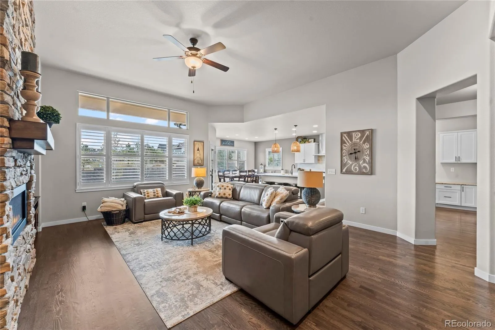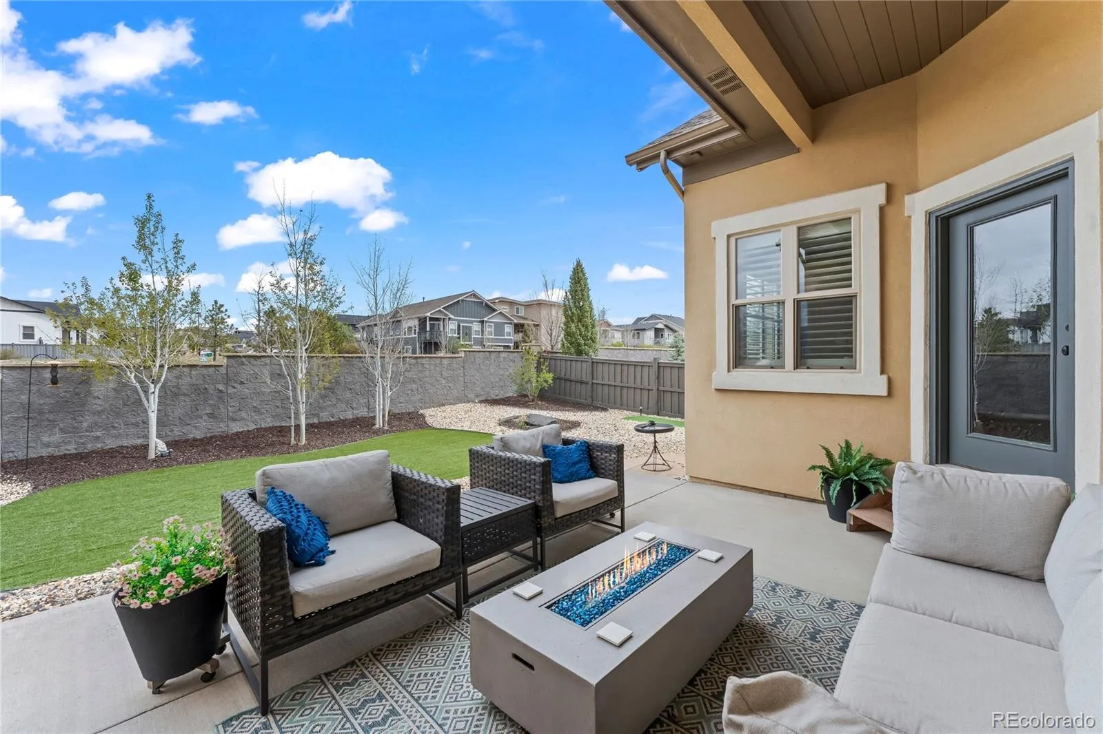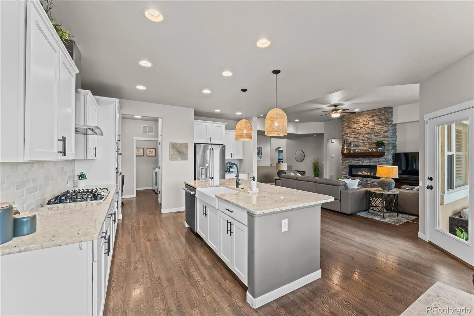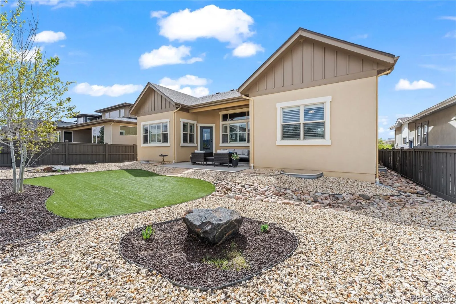 Nestled in the highly desirable community of The Farm and located within the sought-after D20 school district, this beautifully updated ranch-style home by Vantage Homes offers just under 4,000 square feet of thoughtfully designed living space. Featuring 4 bedrooms, 3 bathrooms, and a spacious 3-car garage, this residence blends comfort, functionality, and timeless elegance. A welcoming foyer opens to an inviting open-concept main level, where the living room is anchored by a cozy fireplace, creating a warm and sophisticated atmosphere. The stunning kitchen serves as the heart of the home, showcasing beautiful white cabinetry, a gas cooktop, a large center island, and a pantry closet. Adjacent to the kitchen, a dedicated dining area provides the perfect setting for meals and gatherings, with direct access to the beautifully landscaped backyard for seamless indoor-outdoor living. A nearby nook offers an ideal space for a home office or study. A main-level laundry room and a built-in bench just outside the garage entry create a practical drop zone for everyday convenience. The main level also features a front bedroom and a nearby ¾ bathroom adorned with stunning wallpaper, offering a stylish and welcoming space for guests. The serene primary suite serves as a private retreat, complete with a spacious walk-in closet and a luxurious en-suite bathroom featuring a large walk-in shower, double vanity, and a private water closet. The expansive lower level is designed for relaxation and entertaining, featuring a second fireplace, a wet bar, two additional bedrooms, and a ¾ bathroom, along with abundant storage space. The Farm community offers exceptional amenities, including a clubhouse, pool, fitness center, scenic pond, and miles of walking trails. Conveniently located near shopping, dining, I-25, and the United States Air Force Academy, this home provides the perfect balance of luxury, comfort, and accessibility, complemented by beautiful mountain views.