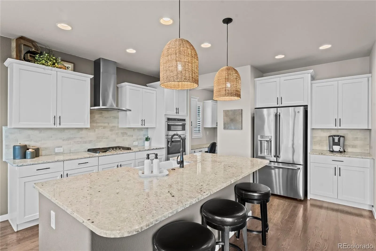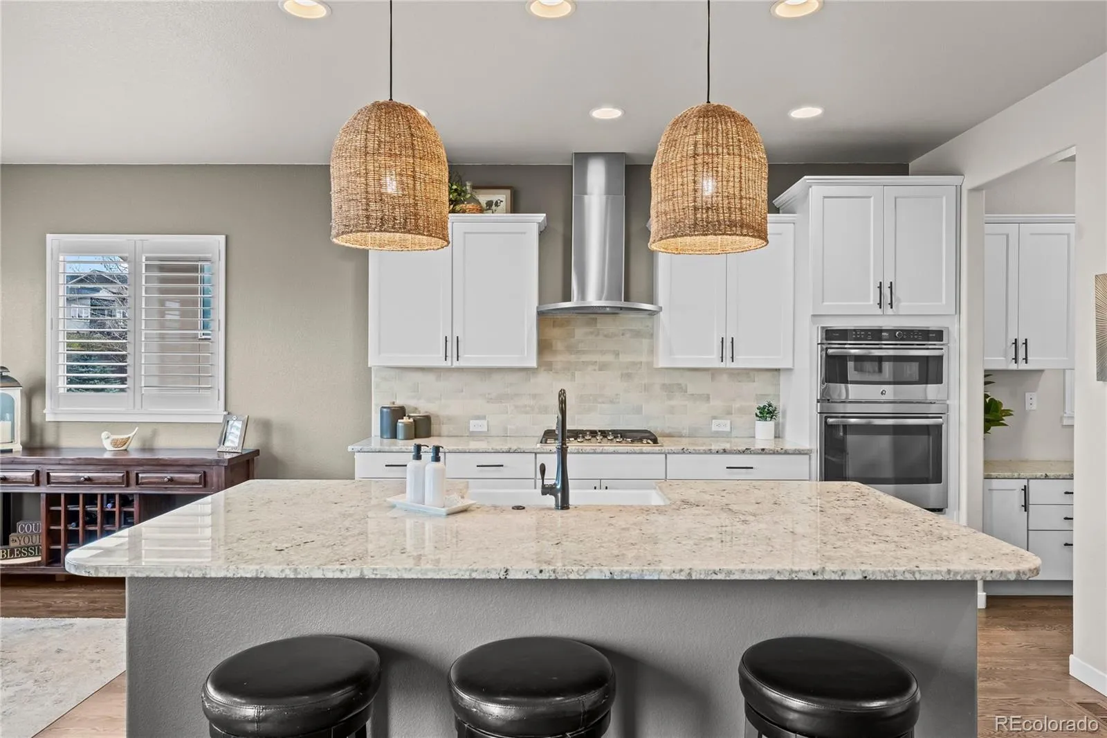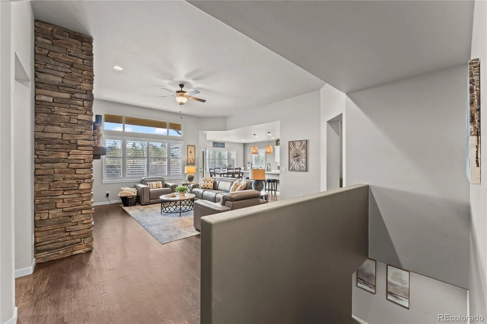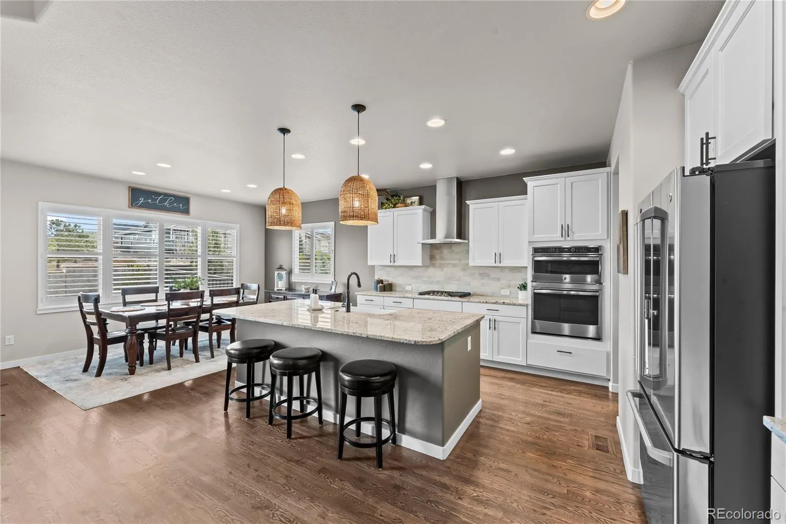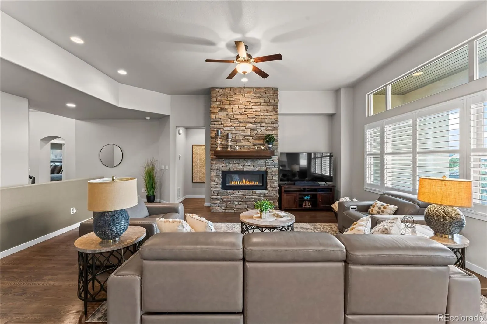 Nestled in the highly desirable community of The Farm and located within the sought-after D20 school district, this beautifully updated ranch-style home by Vantage Homes offers just under 4,000 square feet of thoughtfully designed living space. Featuring 4 bedrooms, 3 bathrooms, and a spacious 3-car garage, this residence blends comfort, functionality, and timeless elegance. A welcoming foyer opens to an inviting open-concept main level, where the living room is anchored by a cozy fireplace, creating a warm and sophisticated atmosphere. The stunning kitchen serves as the heart of the home, showcasing beautiful white cabinetry, a gas cooktop, a large center island, and a pantry closet. Adjacent to the kitchen, a dedicated dining area provides the perfect setting for meals and gatherings, with direct access to the beautifully landscaped backyard for seamless indoor-outdoor living. A nearby nook offers an ideal space for a home office or study. A main-level laundry room and a built-in bench just outside the garage entry create a practical drop zone for everyday convenience. The main level also features a front bedroom and a nearby ¾ bathroom adorned with stunning wallpaper, offering a stylish and welcoming space for guests. The serene primary suite serves as a private retreat, complete with a spacious walk-in closet and a luxurious en-suite bathroom featuring a large walk-in shower, double vanity, and a private water closet. The expansive lower level is designed for relaxation and entertaining, featuring a second fireplace, a wet bar, two additional bedrooms, and a ¾ bathroom, along with abundant storage space. The Farm community offers exceptional amenities, including a clubhouse, pool, fitness center, scenic pond, and miles of walking trails. Conveniently located near shopping, dining, I-25, and the United States Air Force Academy, this home provides the perfect balance of luxury, comfort, and accessibility, complemented by beautiful mountain views.
