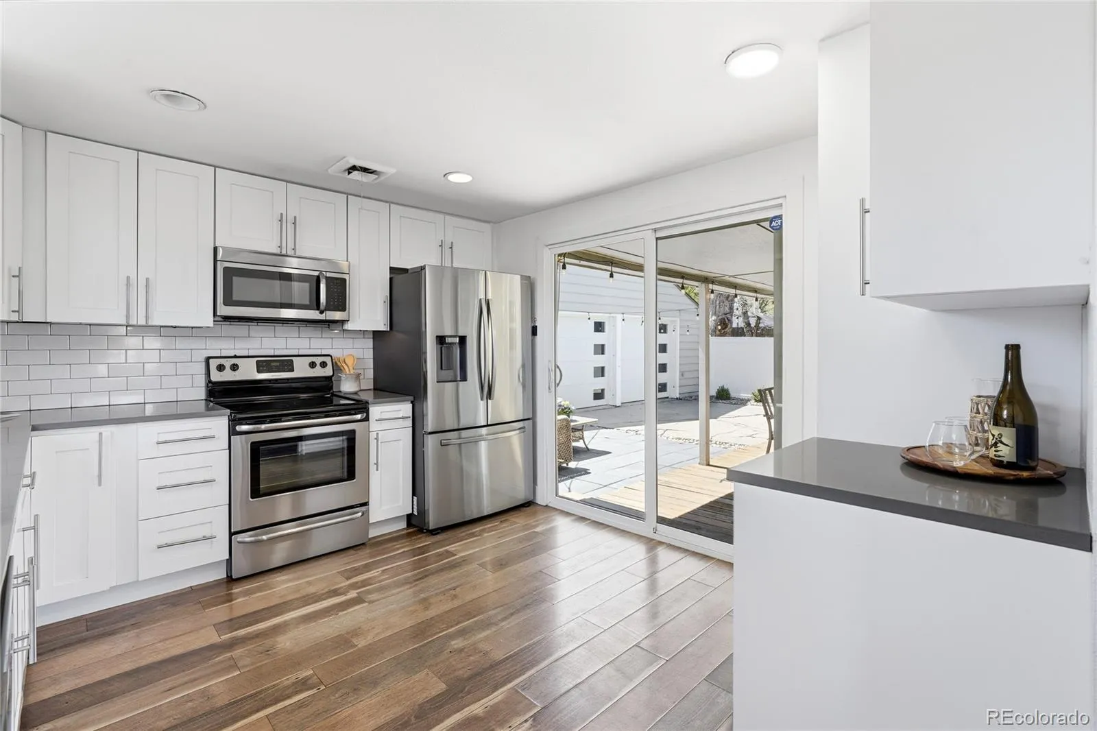 The main living area is warm and inviting, featuring durable newer flooring and abundant natural light. The spacious eat-in kitchen is a standout with quartz countertops, tile backsplash, white cabinetry, and recently updated appliances—including a new refrigerator, dishwasher, and washer/dryer. Sliding glass doors open seamlessly from the kitchen to a covered deck, creating an ideal indoor-outdoor flow for entertaining.