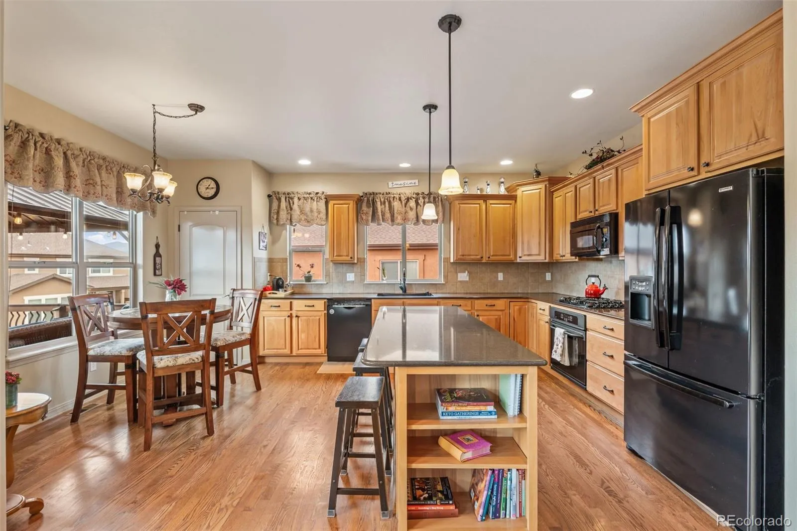 The two-story great room is anchored by a double-sided gas fireplace, seamlessly connecting to a flexible office or main-level bedroom with an adjacent full bath. The kitchen blends function and style with extended hickory cabinetry, quartz countertops, a large center island, a quiet Bosch dishwasher, and a built-in gas cooktop.