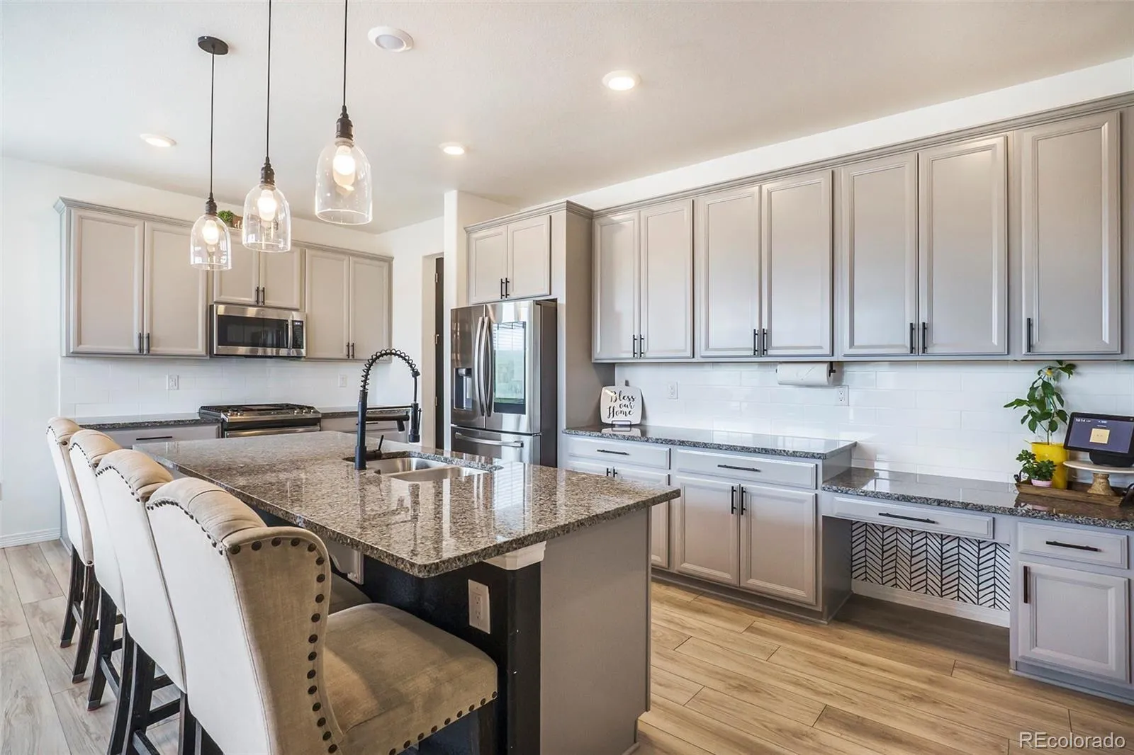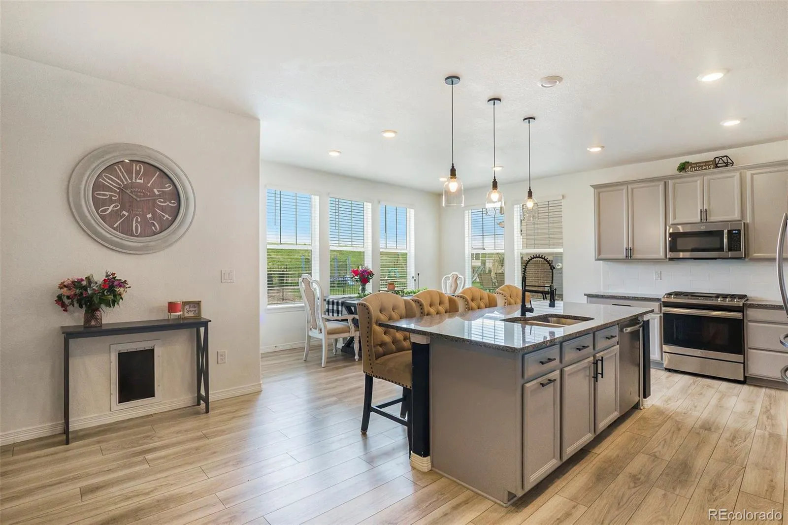 The open-concept layout flows into the dining area and a thoughtfully designed kitchen, complete with soft gray shaker cabinets, stainless steel appliances, a spacious walk-in pantry, and a large island with bar seating—perfect for casual meals or gathering with guests.