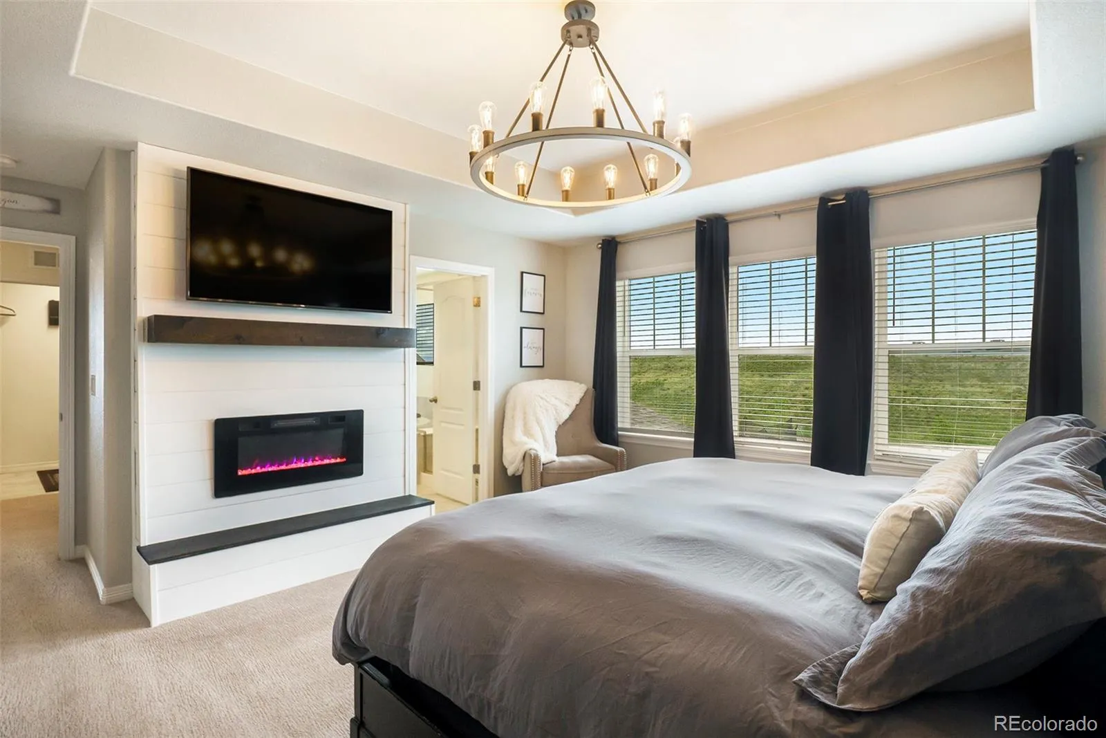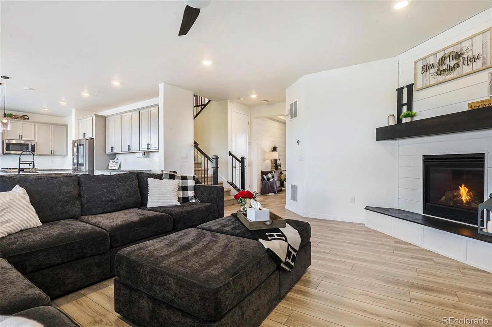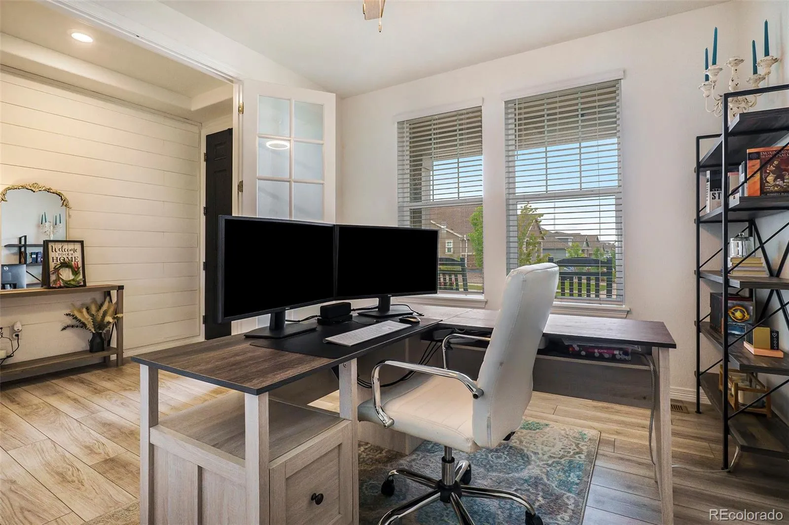 Just off the entry, a private office with French doors and large windows creates an ideal space for working from home or staying organized. The inviting living room showcases a striking black fireplace with a shiplap accent wall, complemented by expansive windows that bring in abundant natural light.