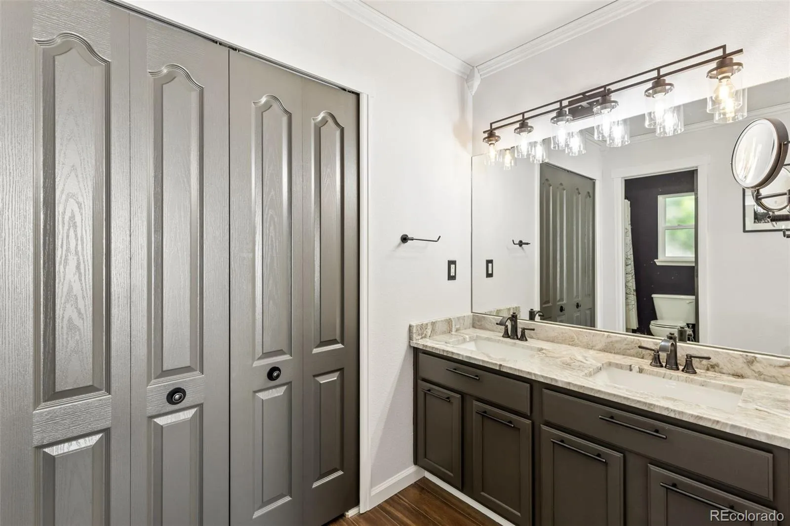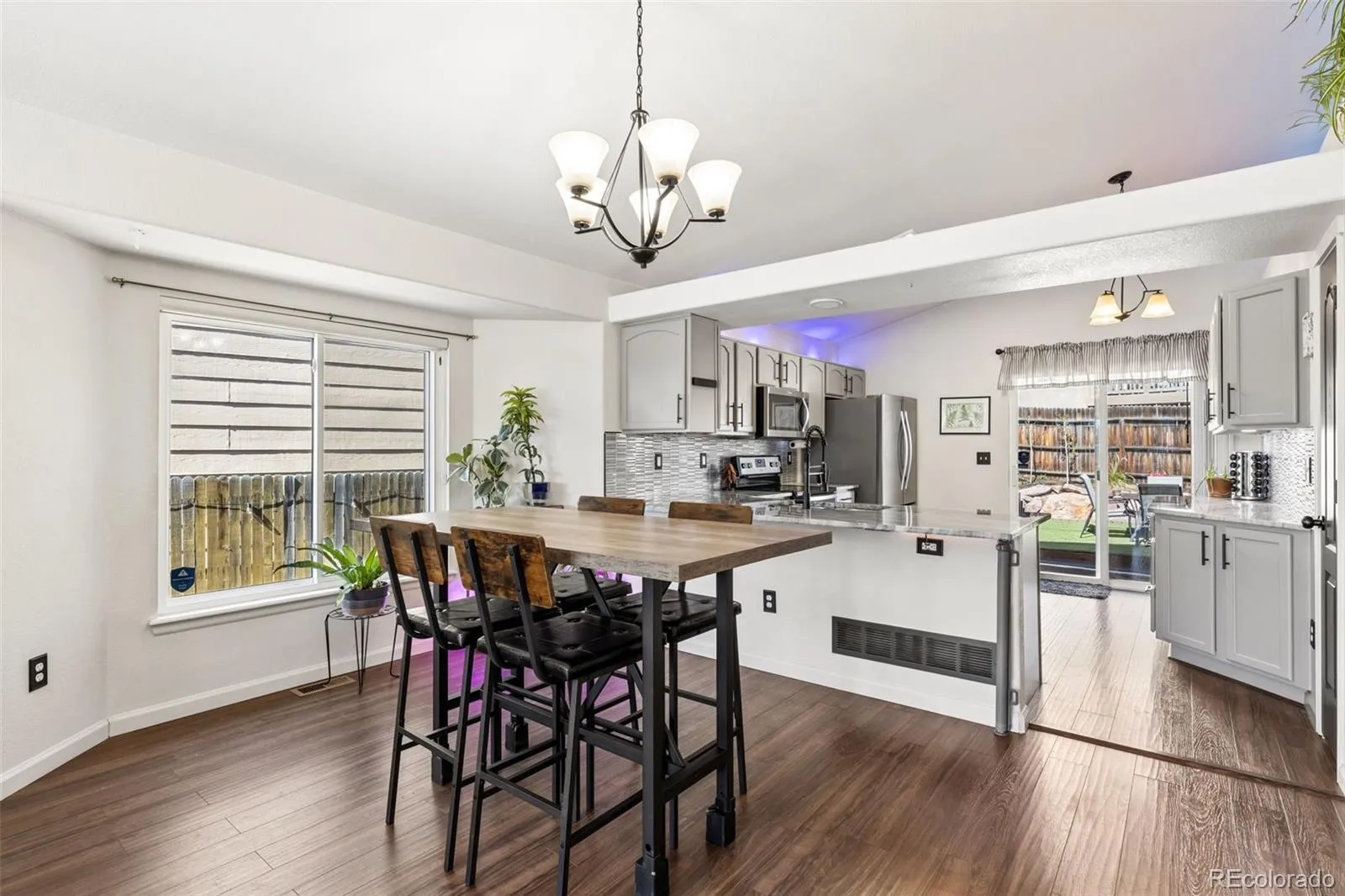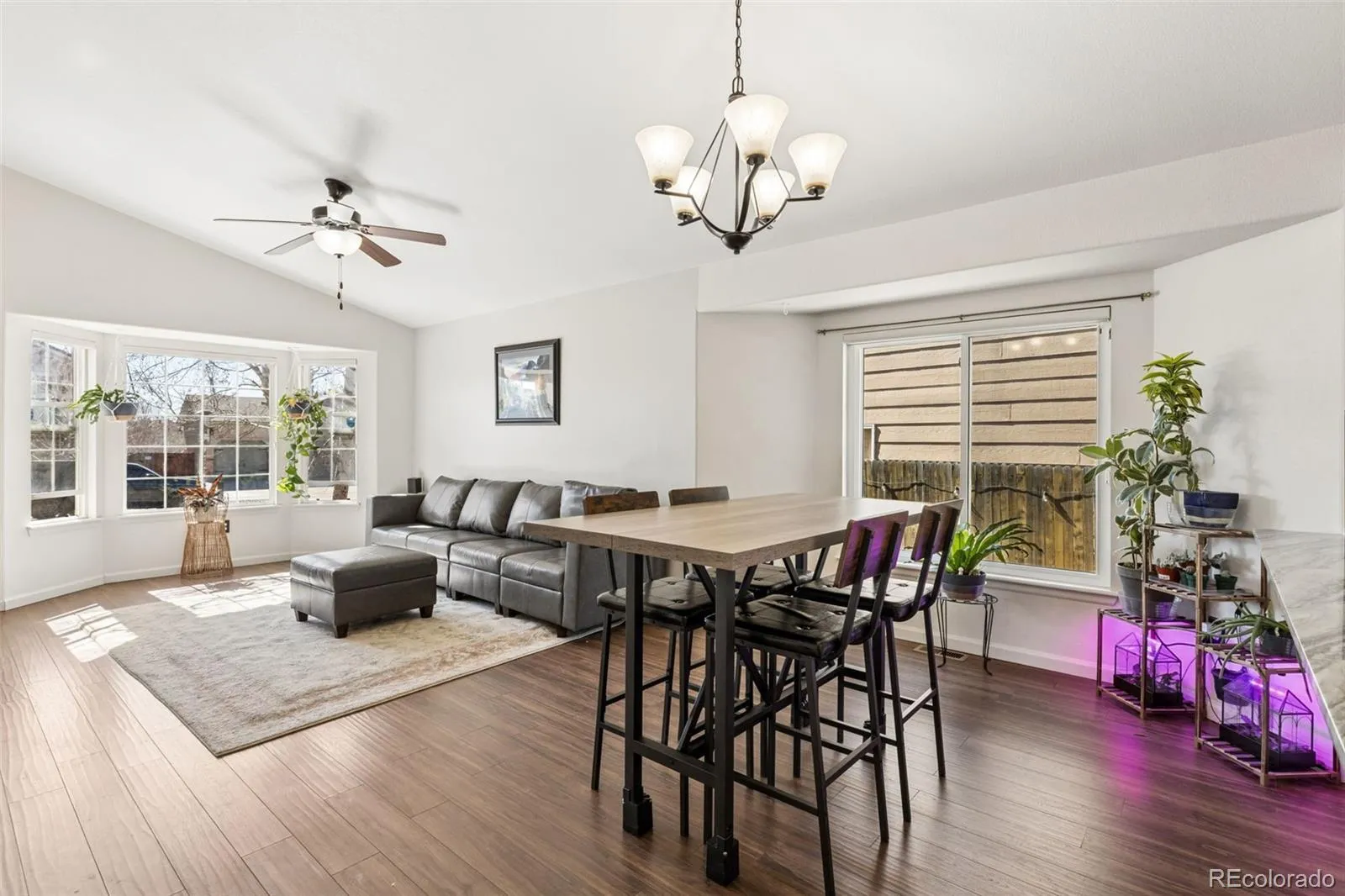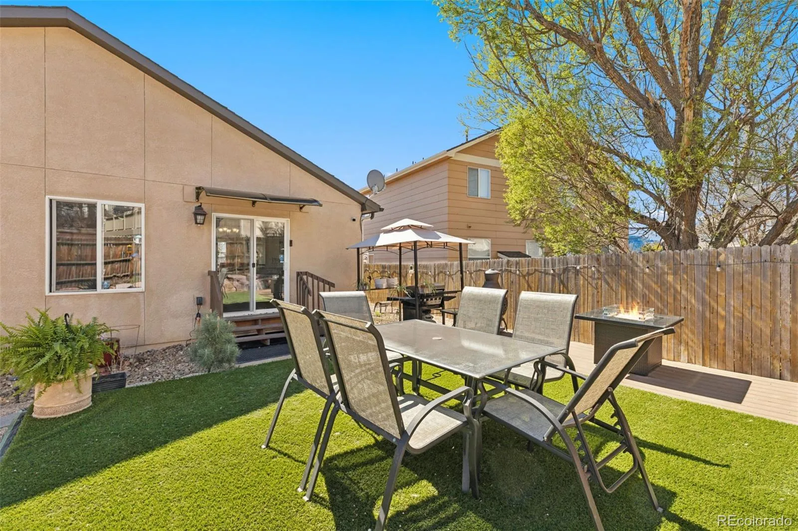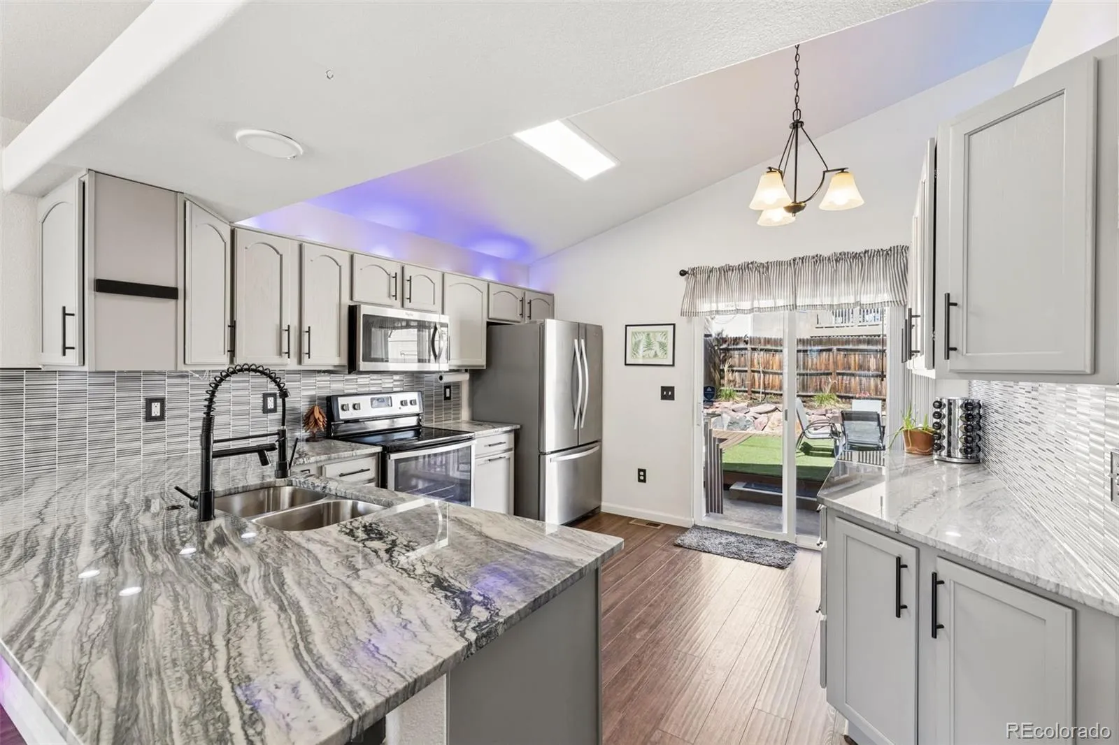 This beautifully remodeled ranch-style home is set on a gorgeous lot filled with mature aspens and trees. The open-concept design offers true main-level living, with luxury plank flooring throughout the main level and soaring vaulted ceilings that create a bright, open, and airy feel. The updated kitchen features granite countertops, stainless steel appliances, a stylish backsplash, a dedicated coffee area, and an extended buffet in the eat-in nook for added storage and prep space. The dining area is highlighted by a charming bay window that fills the space with natural light. The main-level primary suite offers a peaceful retreat with a spacious walk-in closet complete with custom built-ins and a private en-suite bath featuring double vanities, linen storage, and an additional separate closet. The fully finished basement provides even more living space with a large rec room, dedicated game area with a pool table, full bathroom, and two additional bedrooms, ideal for guests or flexible living needs. Outside, the expansive backyard is designed for both relaxation and entertaining, featuring an extended stamped concrete patio, floating composite deck, artificial turf, charming gazebo area, shed with electrical, and a water feature. The oversized garage also includes an electric charger. Don’t miss your chance to see this beautiful home. Schedule your showing today!