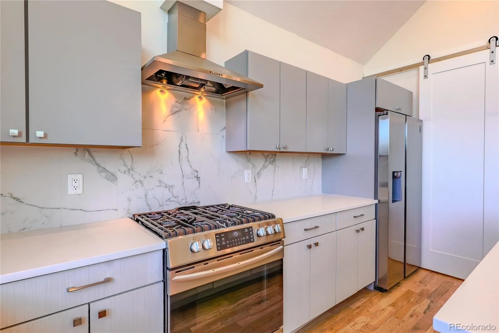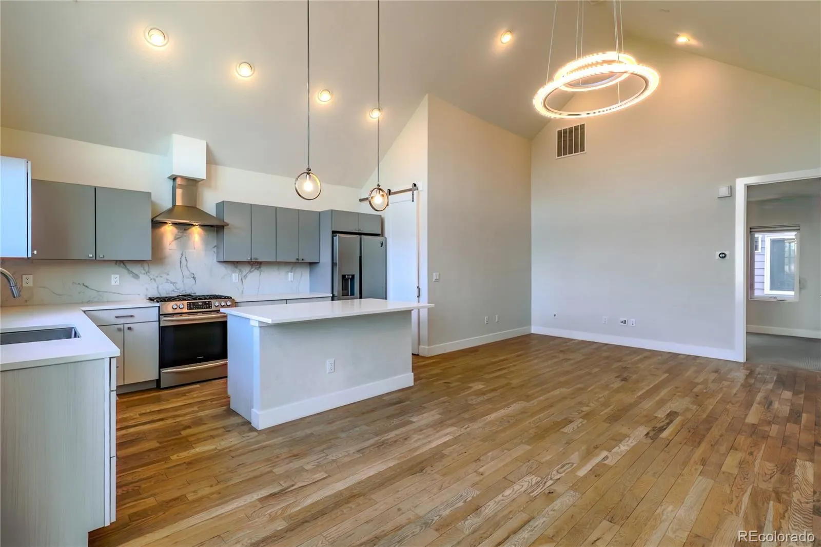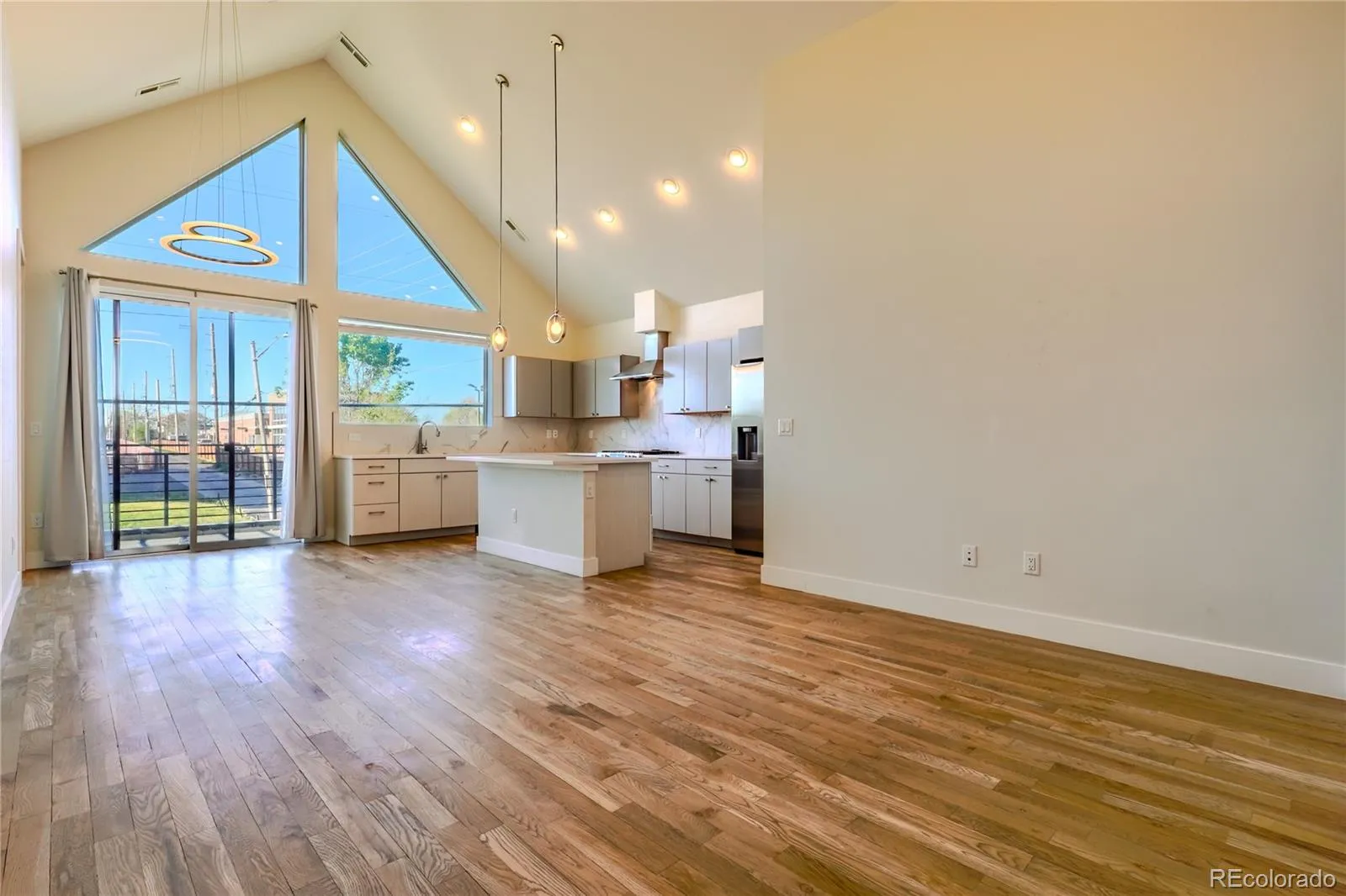 Upstairs is where it opens up. Vaulted ceilings, hardwood floors, and a kitchen that anchors the space with quartz countertops, a gas cooktop, French-door refrigerator, pendant lighting, and a functional island with seating. It flows seamlessly into the living and dining areas—easy, open, and built for entertaining.