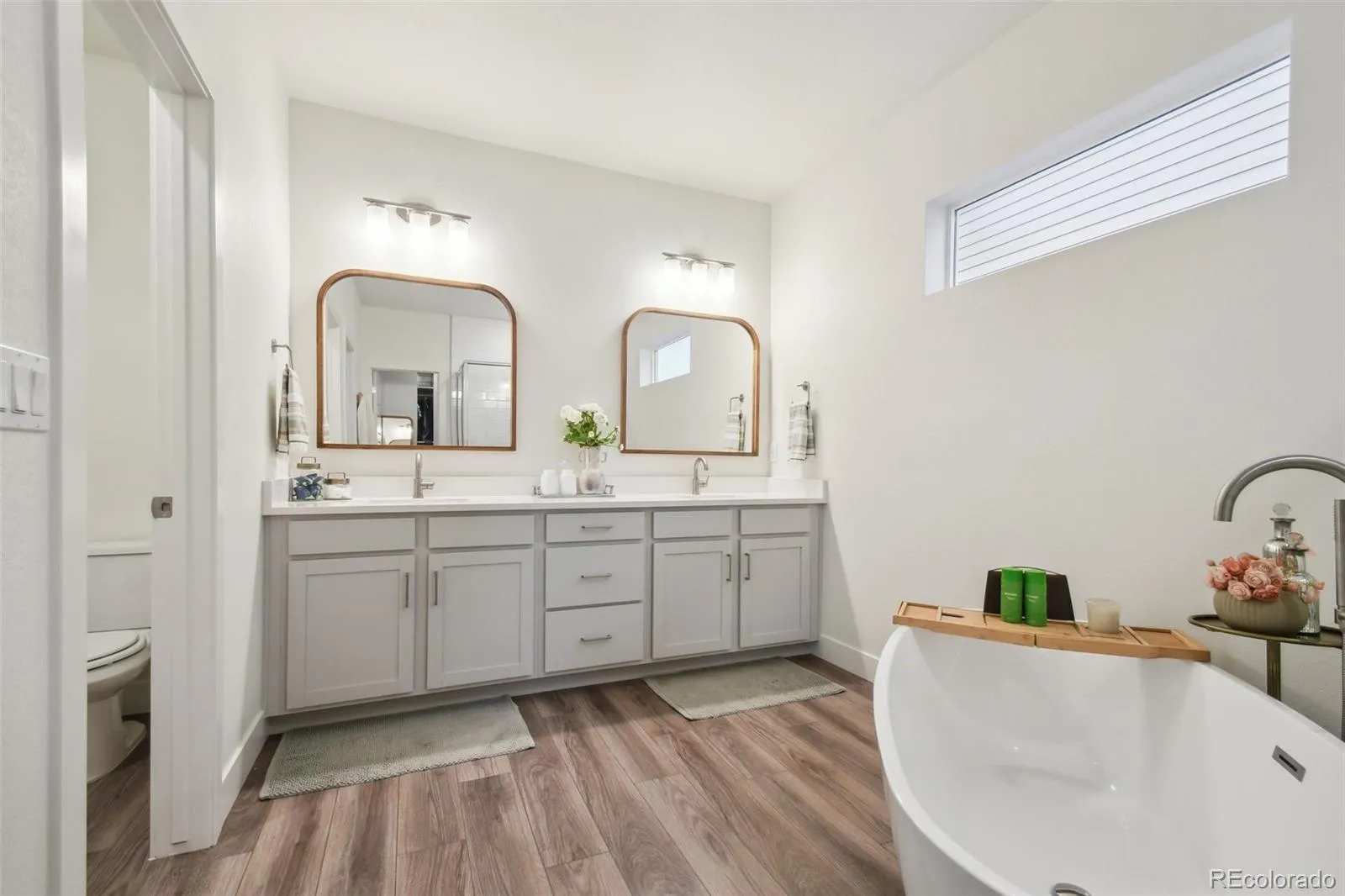 Discover elevated modern living in this stunning 5-bedroom, 5-bathroom home, thoughtfully designed to balance refined style with everyday comfort. From impressive ceiling heights, abundant natural light, and expansive living spaces to sleek, oversized interior doors, the home makes a striking first impression with curated architectural details throughout. The spacious kitchen anchors the main level, showcasing a 5-burner gas range, upgraded finishes, a dedicated coffee nook, and generous storage and counter space—ideal for both entertaining and daily living. It opens effortlessly to the main living area, where large patio doors fill the space with natural light and create a seamless indoor-outdoor connection. The main floor offers exceptional versatility, featuring a private office, a main-level guest bedroom, and a full guest bath. Upstairs, three generously sized bedrooms with accompanying bathrooms provide comfort and privacy, including an expansive primary suite with a 5-piece ensuite and custom built-in closet. A spacious laundry room and numerous storage closets add everyday convenience. Completing the upper level is a versatile loft space ideal as a secondary living area, media room, or play space while maintaining a bright, open feel. Throughout the home, luxury vinyl plank flooring delivers durability with modern appeal. Gas furnaces and A/C systems ensure year-round comfort, accompanied by a tankless hot water heater, radon mitigation system, & water softener. The finished basement adds valuable living space with a wet bar, guest bedroom, bathroom with walk in shower, and dedicated gym—ideal for guests, multigenerational living, or entertaining. Step outside to thoughtfully designed landscaping with automated sprinkler system and raised garden beds. The patio features a gas line hookup for effortless outdoor dining. A spacious 3-car tandem garage completes the home with ample room for vehicles and storage. This exceptional residence is a must-see home.
