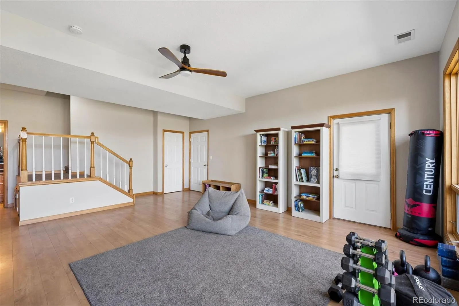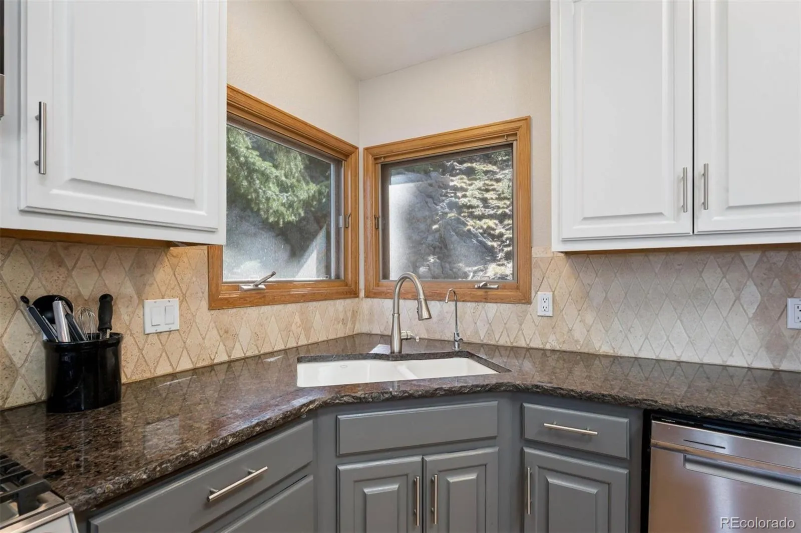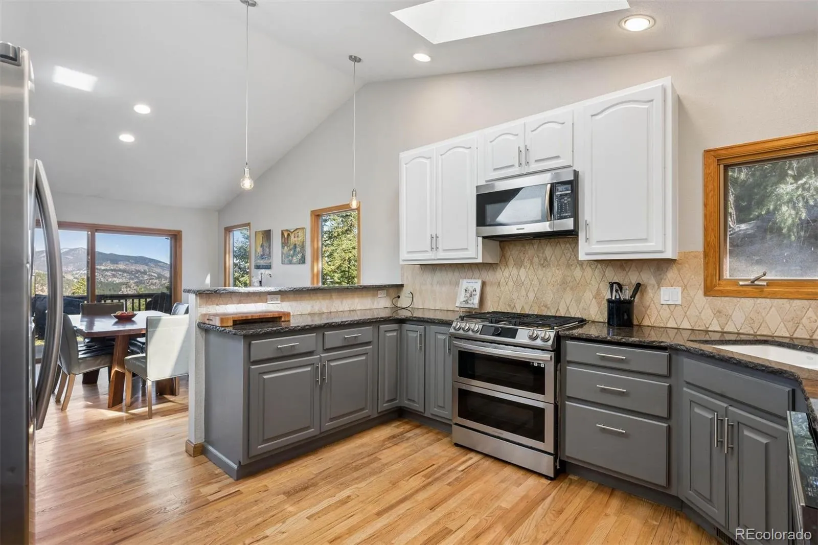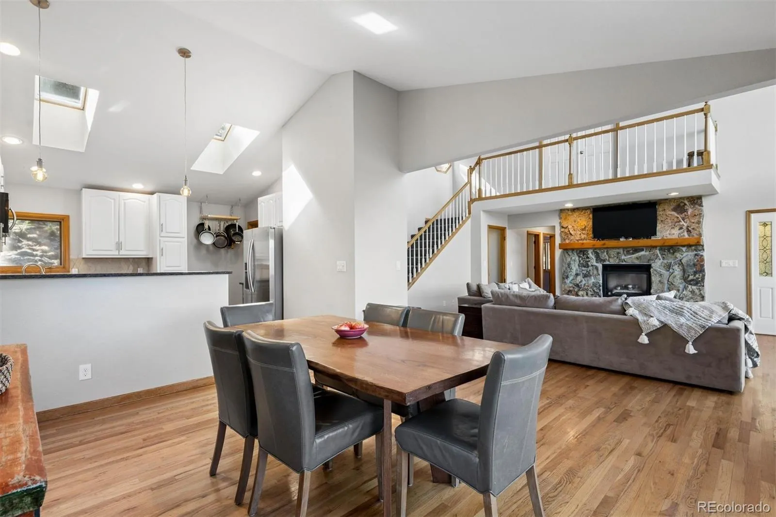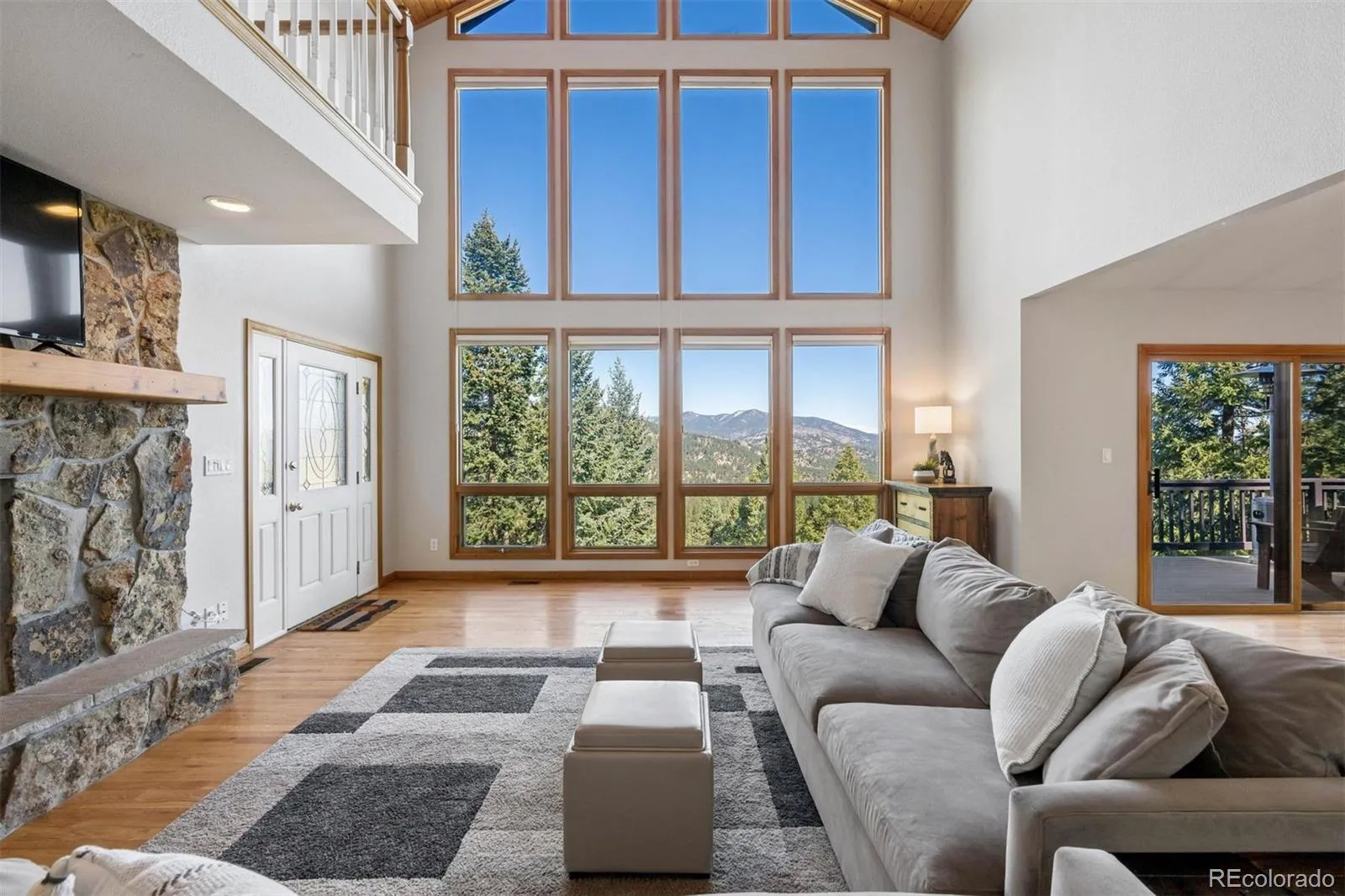 iconic Colorado scenery, framed by dramatic rock outcroppings. The inviting great room features soaring two-story windows that flood the space with natural light while showcasing the breathtaking landscape. Tongue-and-groove vaulted