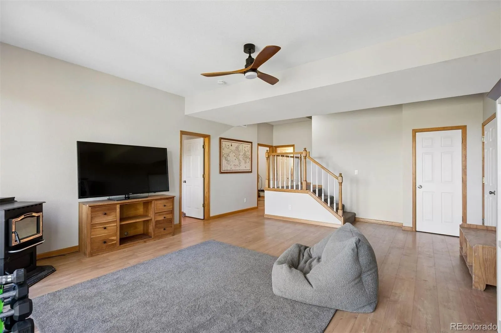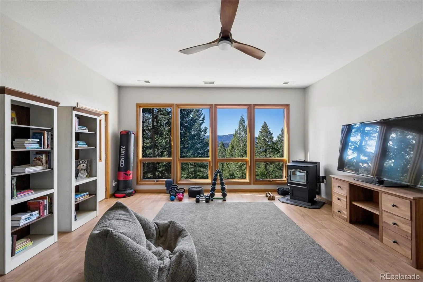 featuring a pellet stove, an additional bedroom and bathroom, and a dedicated office or